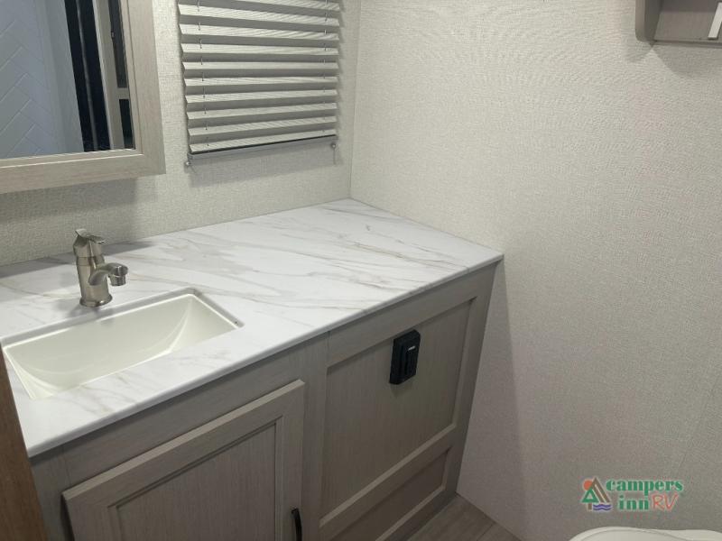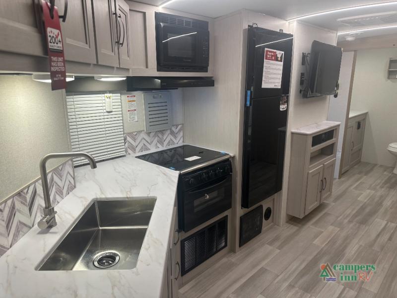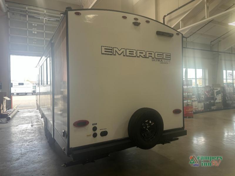 Experience a peace of mind with each one of these Cruiser Embrace travel trailers! Durable construction consists of a painted front cap with LED lights, a one-piece vinyl TPO membrane roof, plus a heated and enclosed underbelly to help extend your camping season. There are also 15" rims and tires on heavy-duty axles, 5/8" tongue and groove plywood flooring, a power awning with LED lights, plus more top selling features. Inside, you'll enjoy seamless countertops, concealed cabinet door hinges, an LED lighting package, and many more comforts.