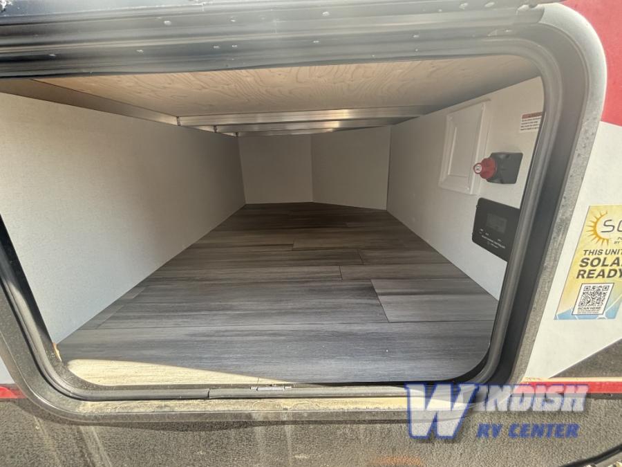 This toy hauler with an 18' garage is sure to meet all your expectations. Once the dirt bikes are unloaded, you can relax on the opposing sofa with a dinette, and there is an optional three seasons glass door that can be added for more convenience. The dual lounge chairs across from the fireplace slide out will make your space feel more like home, and the full kitchen lets you make meals each day. You'll also find a dual entry bath that will create a front master bedroom. Here, a king bed will provide a great night's rest and the dual wardrobes help keep your space tidy!