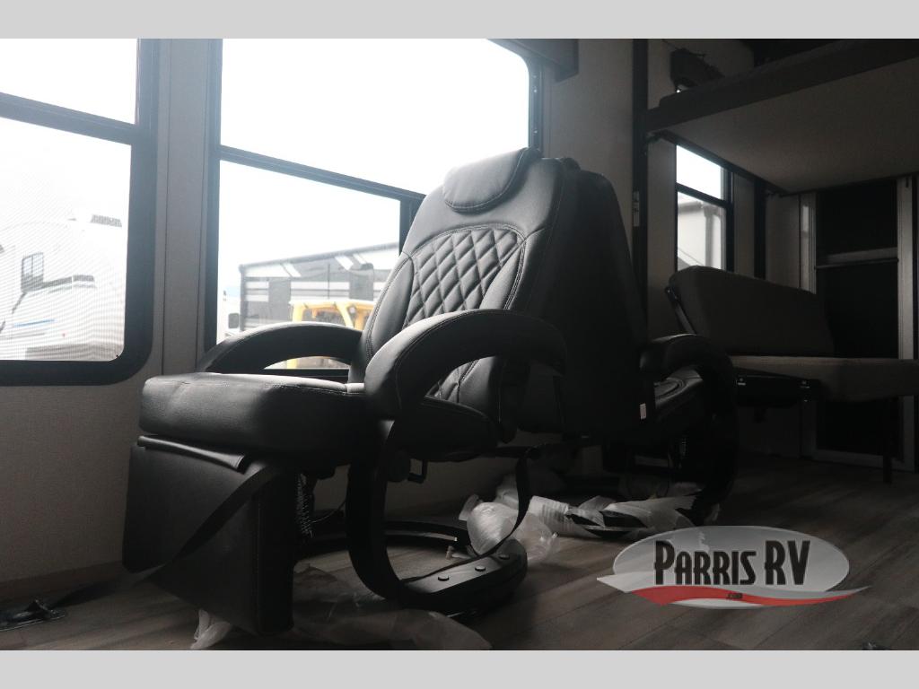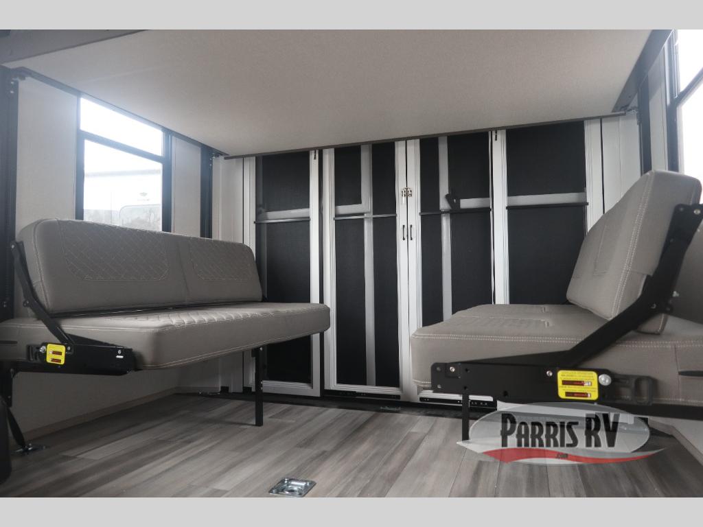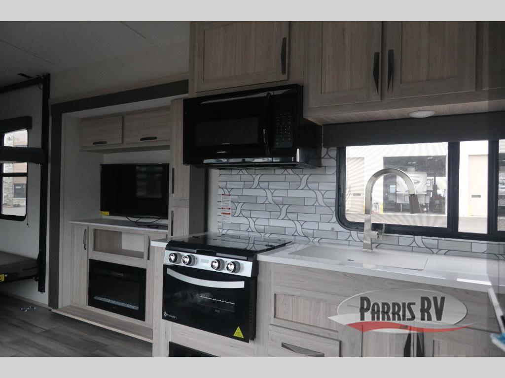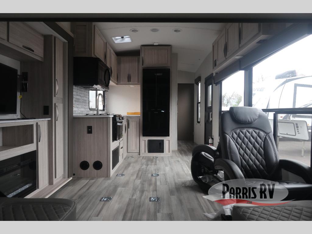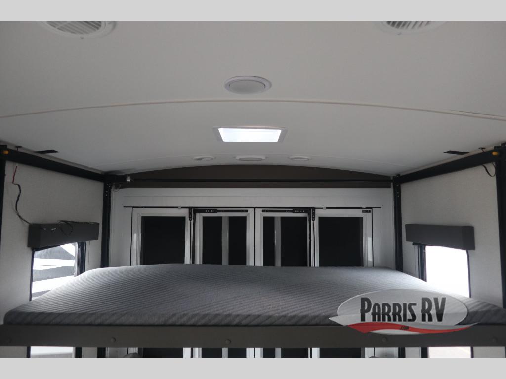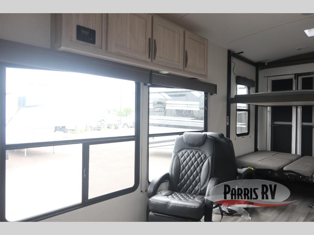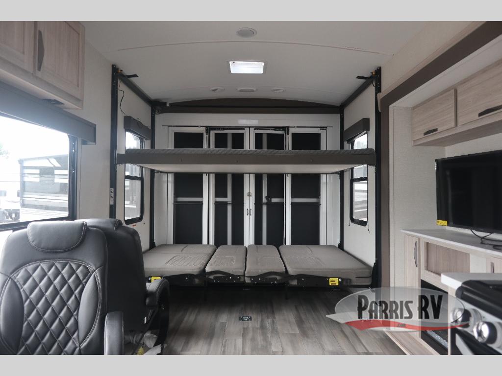 This toy hauler with an 18' garage is sure to meet all your expectations. Once the dirt bikes are unloaded, you can relax on the opposing sofa with a dinette, and there is an optional three seasons glass door that can be added for more convenience. The dual lounge chairs across from the fireplace slide out will make your space feel more like home, and the full kitchen lets you make meals each day. You'll also find a dual entry bath that will create a front master bedroom. Here, a king bed will provide a great night's rest and the dual wardrobes help keep your space tidy!