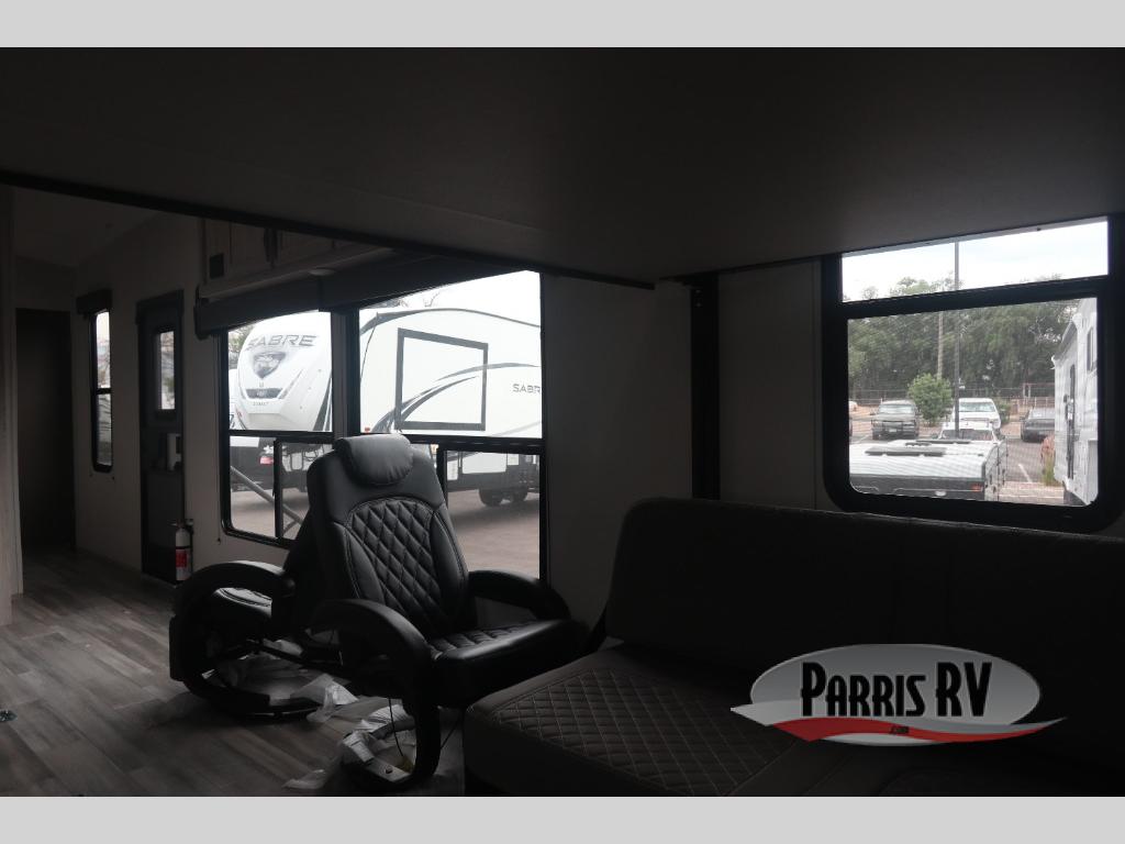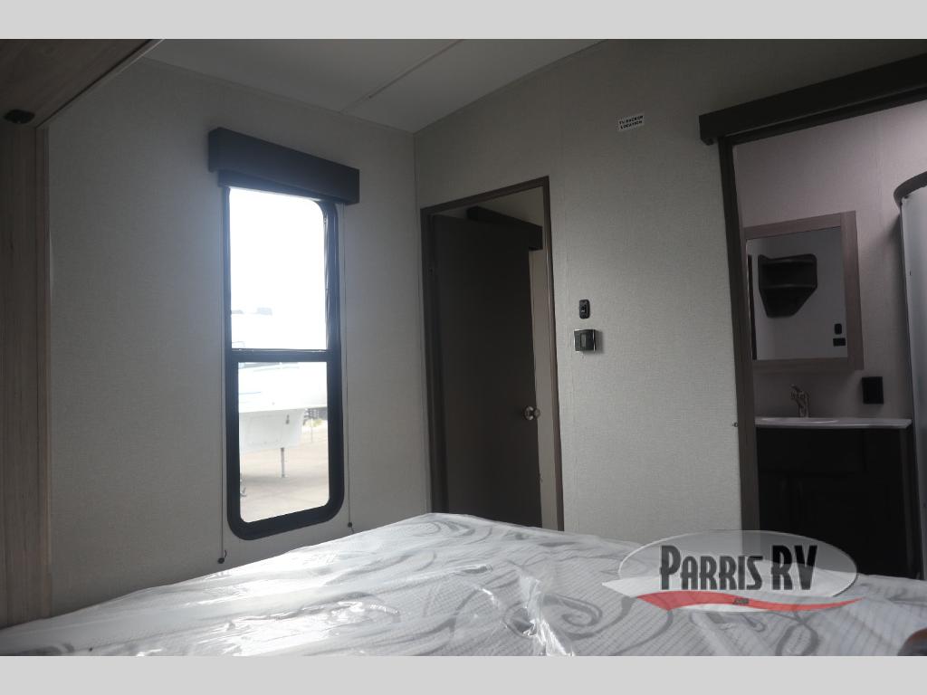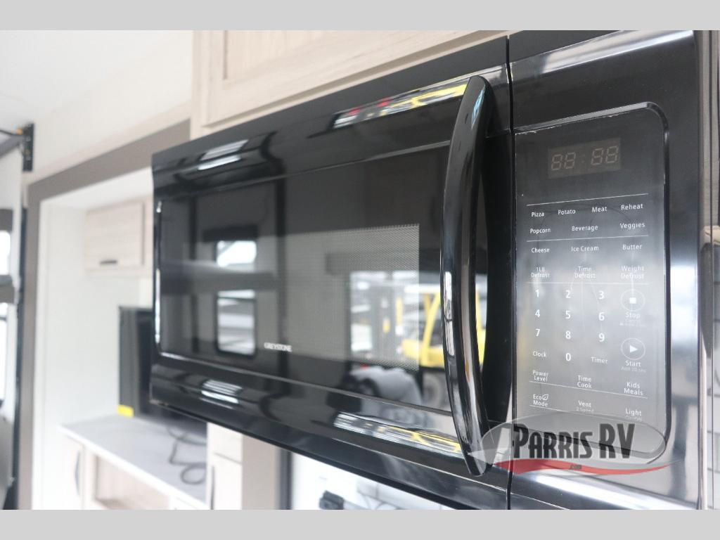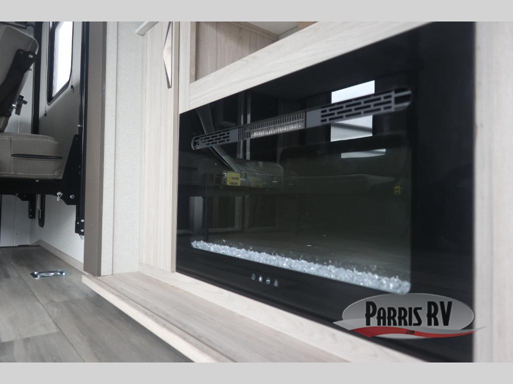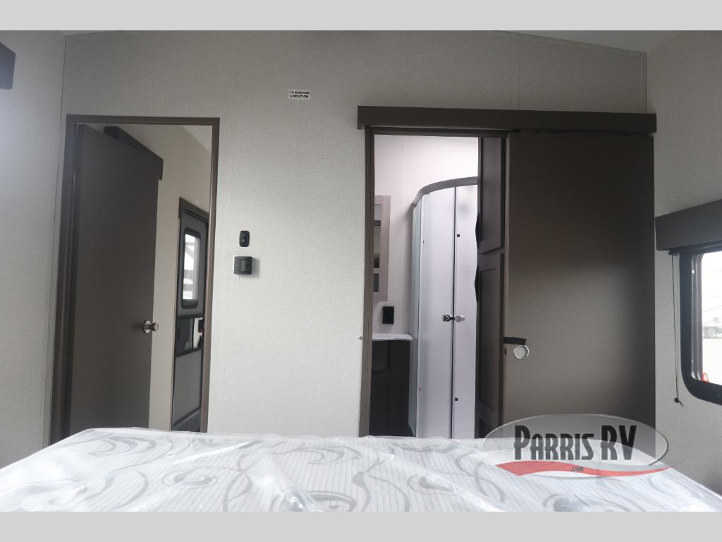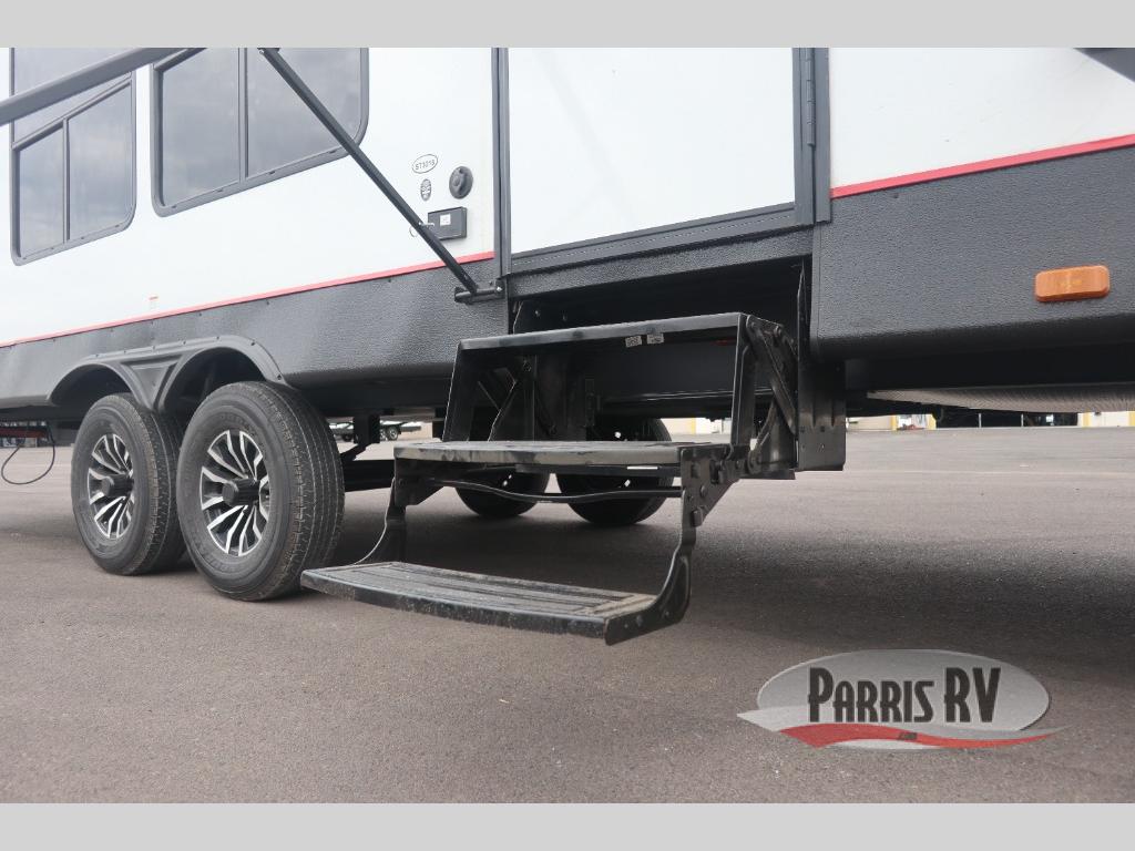 This toy hauler with an 18' garage is sure to meet all your expectations. Once the dirt bikes are unloaded, you can relax on the opposing sofa with a dinette, and there is an optional three seasons glass door that can be added for more convenience. The dual lounge chairs across from the fireplace slide out will make your space feel more like home, and the full kitchen lets you make meals each day. You'll also find a dual entry bath that will create a front master bedroom. Here, a king bed will provide a great night's rest and the dual wardrobes help keep your space tidy!