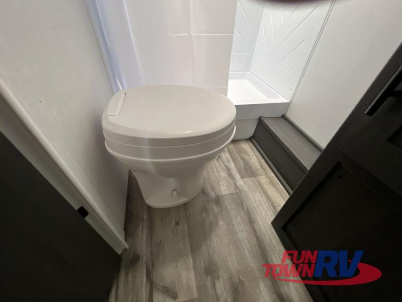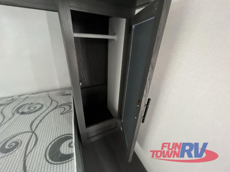 Enjoy privacy in the front bedroom when you close the curtains. You can sleep on your own residential queen bed, and there are two wardrobes to stow away your clothes. Your family and friends can sleep on the double-size bunks in the rear next to the full bathroom with a shower, and the booth dinette as well as the sofa provide extra sleeping space. The 10 cu. ft. 12V refrigerator will hold your cold items, and you can cook using the range top, and keep everything clean using the galley sink with a high rise faucet. And the overhead cabinets will hold your dishes, snacks and such.
