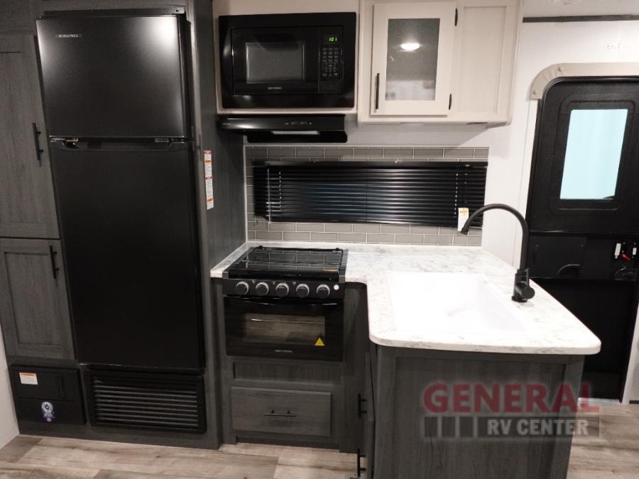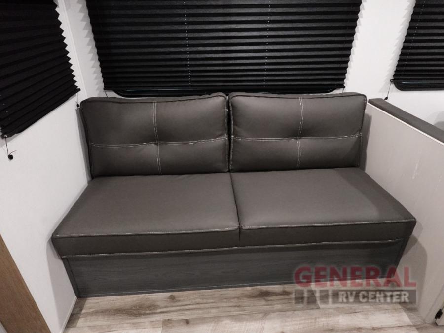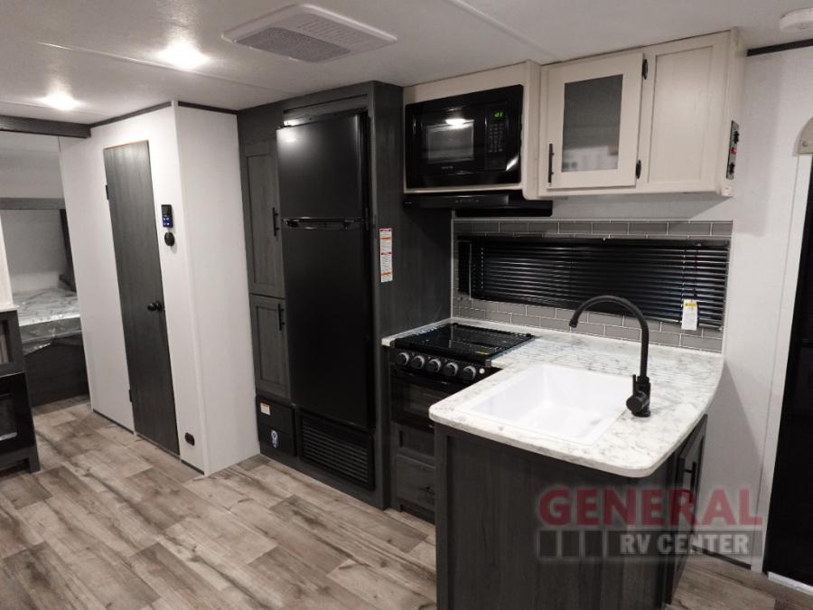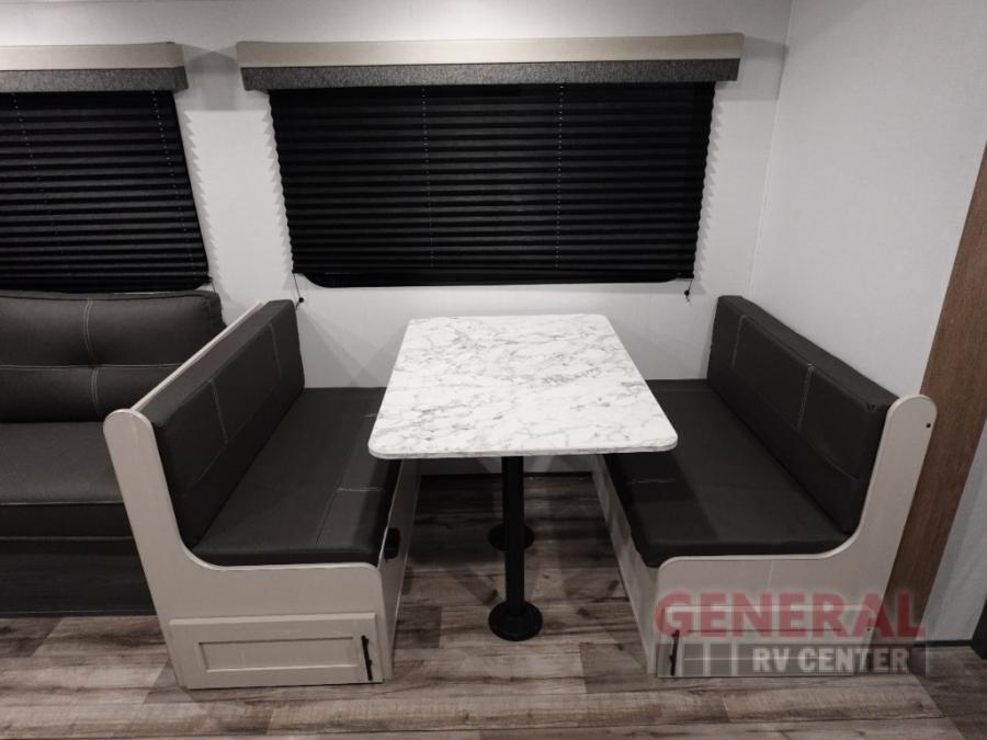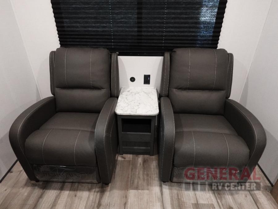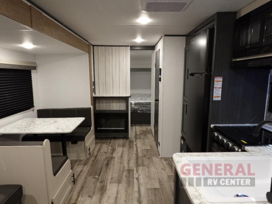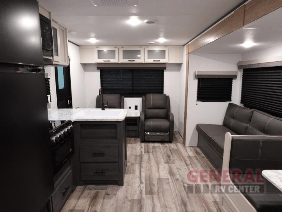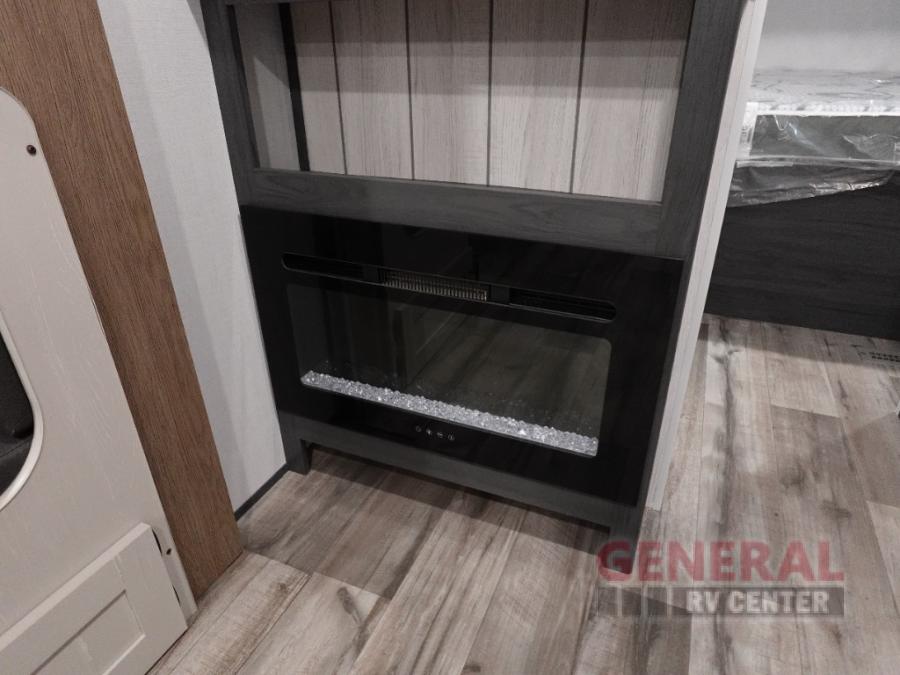 With dual entry doors, you can easily enter and exit this travel trailer! The jackknife sofa with footrest and booth dinette are next to each other near the fireplace, as well as two rear recliners allowing you to visit with other RVers or your family. The cook will have an ovenĀ and a microwave to make meals, and a 10 cu. ft. 12V refrigerator for cold items, plus a galley sink with high rise faucet to keep the dishes clean. Speaking of being clean, the full bathroom offers a shower with exhaust fan to eliminate unwanted steam as you clean yourself up after a fun day at the beach. The front private bedroom has a residential queen bed and one of the entrance/exit doors so you can slip out for an early morning fishing trip!