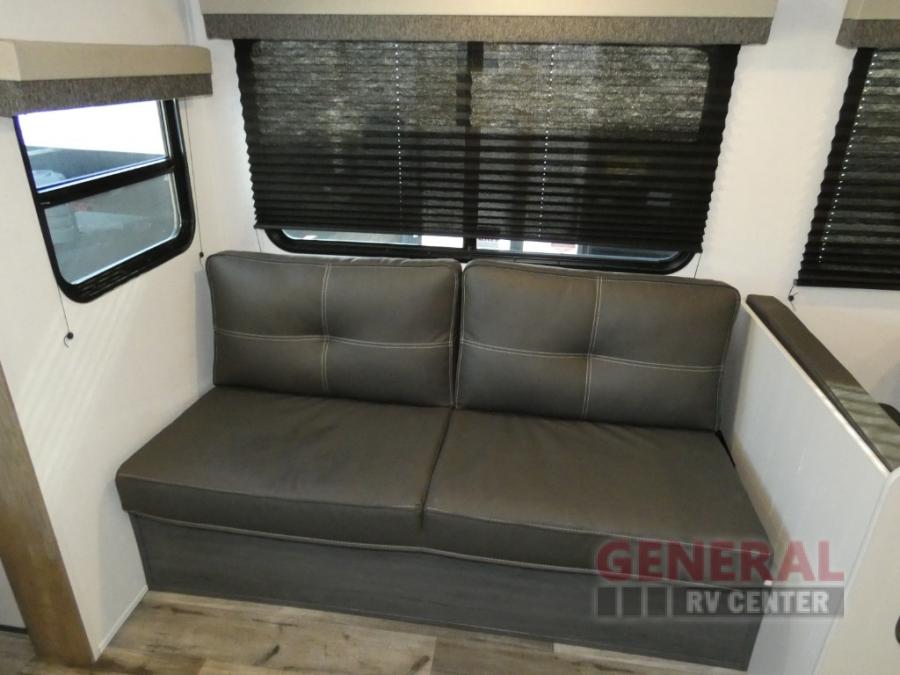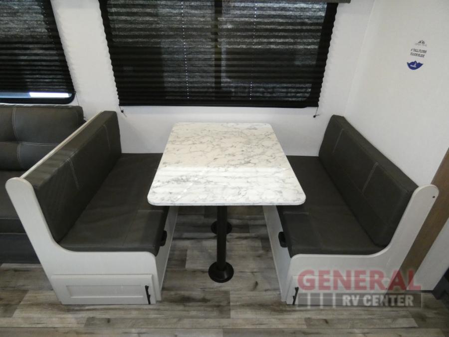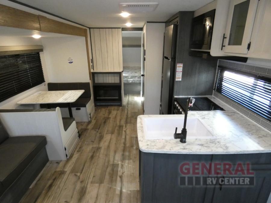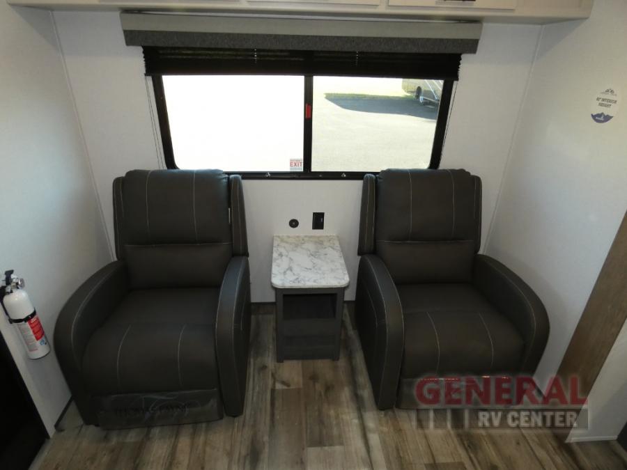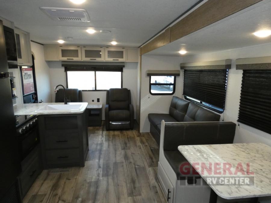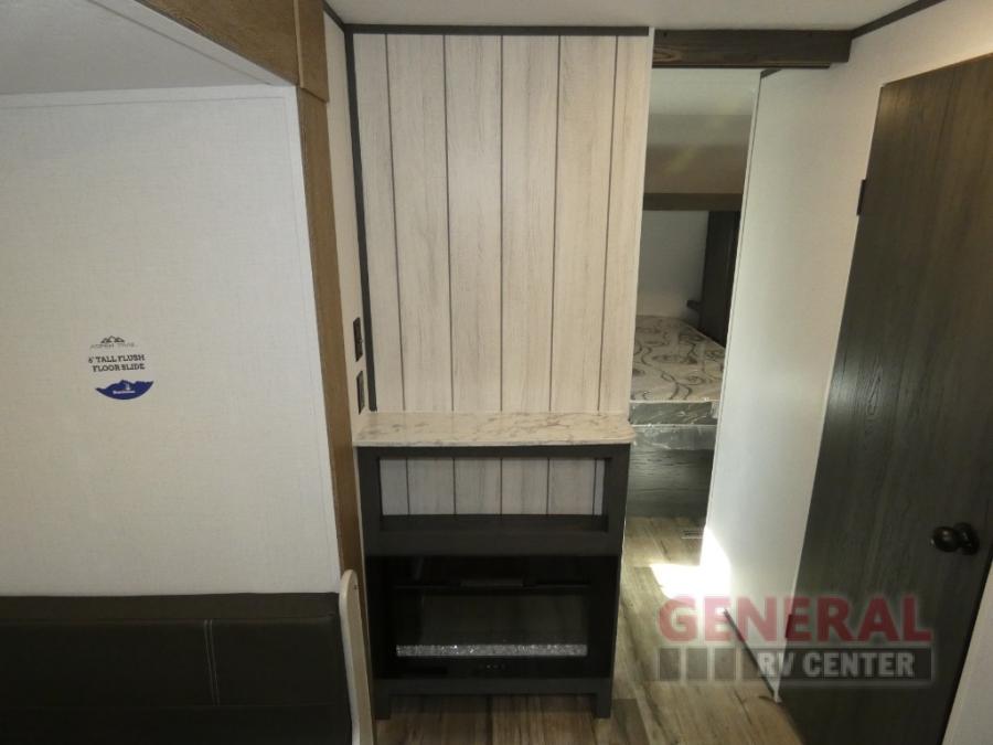 With dual entry doors, you can easily enter and exit this travel trailer! The jackknife sofa with footrest and booth dinette are next to each other near the fireplace, as well as two rear recliners allowing you to visit with other RVers or your family. The cook will have an ovenĀ and a microwave to make meals, and a 10 cu. ft. 12V refrigerator for cold items, plus a galley sink with high rise faucet to keep the dishes clean. Speaking of being clean, the full bathroom offers a shower with exhaust fan to eliminate unwanted steam as you clean yourself up after a fun day at the beach. The front private bedroom has a residential queen bed and one of the entrance/exit doors so you can slip out for an early morning fishing trip!