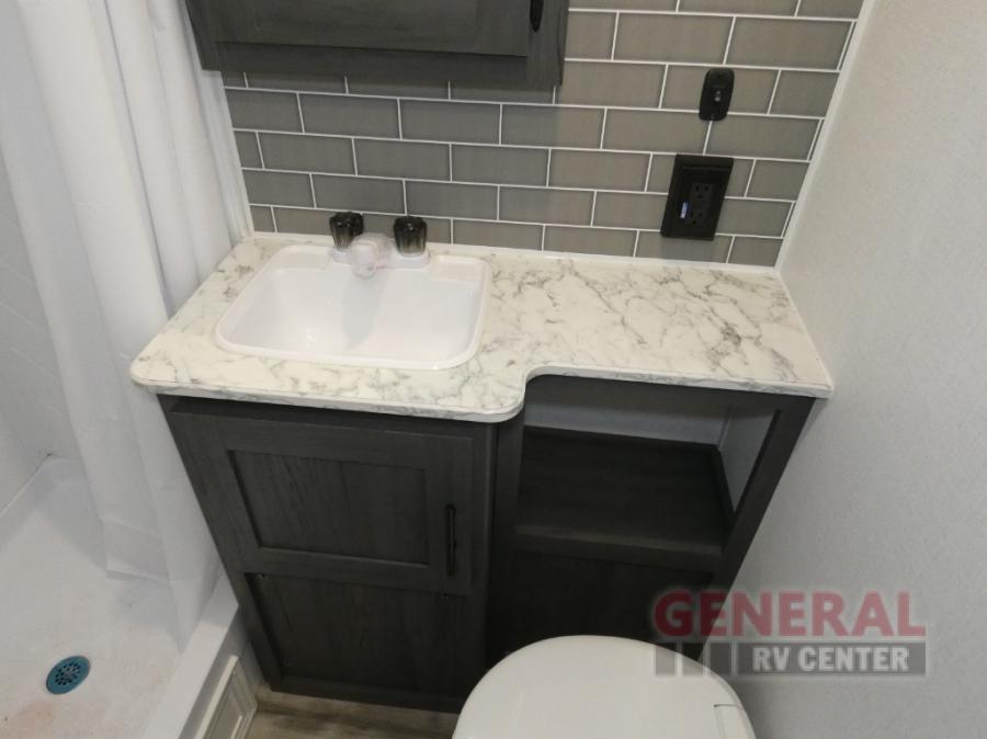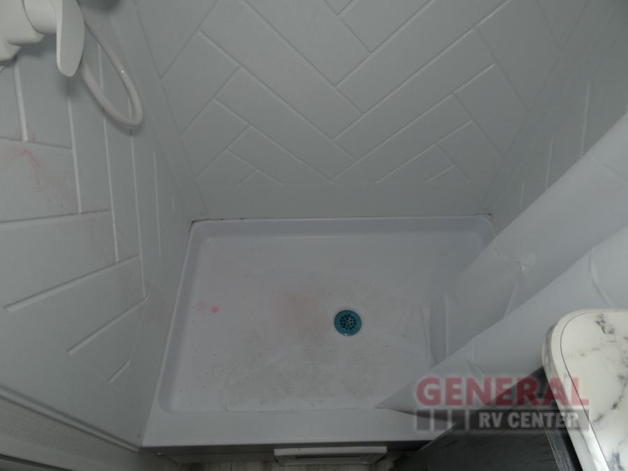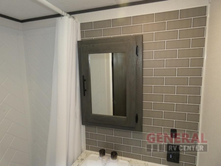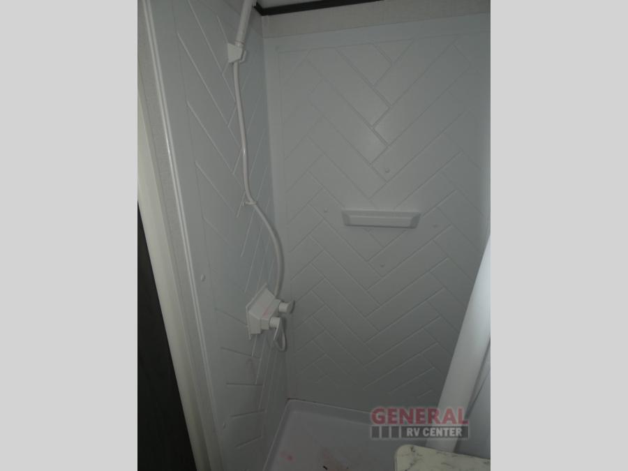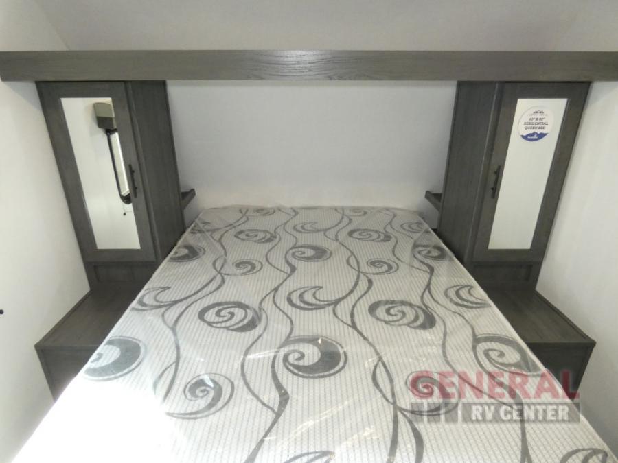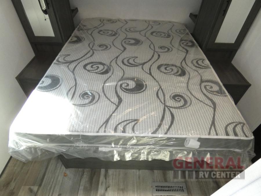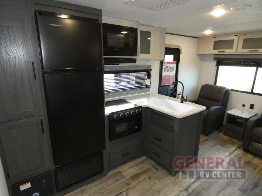 With dual entry doors, you can easily enter and exit this travel trailer! The jackknife sofa with footrest and booth dinette are next to each other near the fireplace, as well as two rear recliners allowing you to visit with other RVers or your family. The cook will have an ovenĀ and a microwave to make meals, and a 10 cu. ft. 12V refrigerator for cold items, plus a galley sink with high rise faucet to keep the dishes clean. Speaking of being clean, the full bathroom offers a shower with exhaust fan to eliminate unwanted steam as you clean yourself up after a fun day at the beach. The front private bedroom has a residential queen bed and one of the entrance/exit doors so you can slip out for an early morning fishing trip!