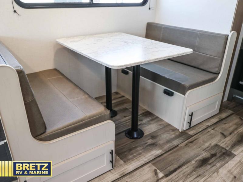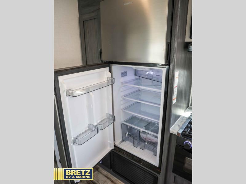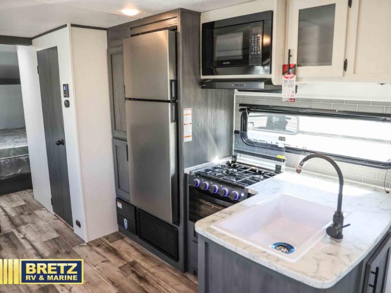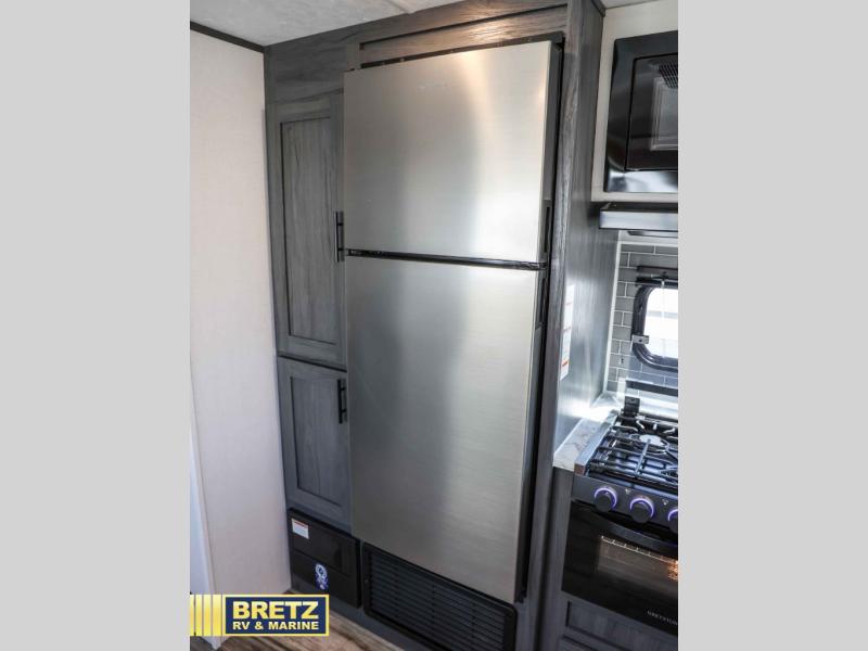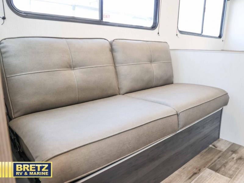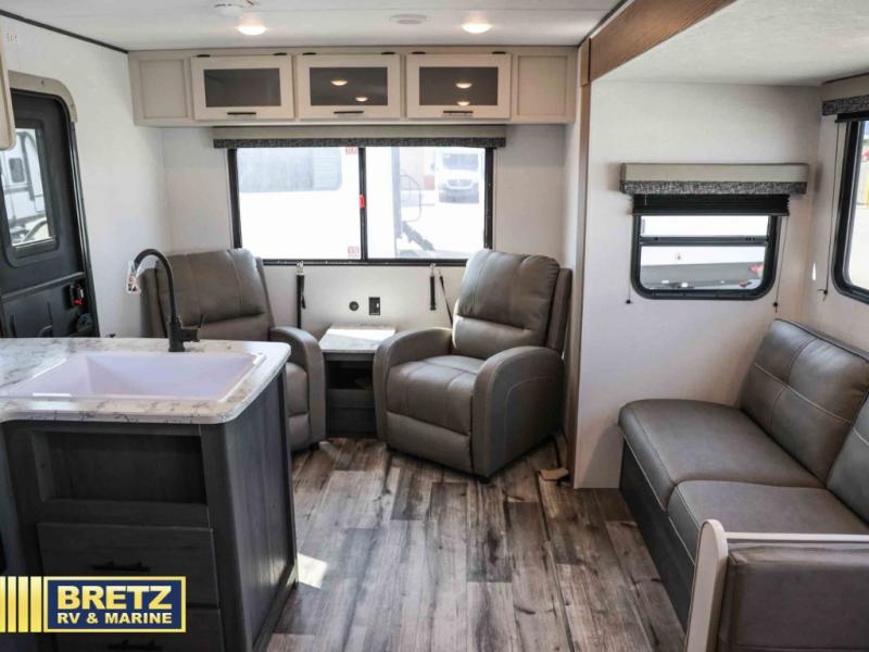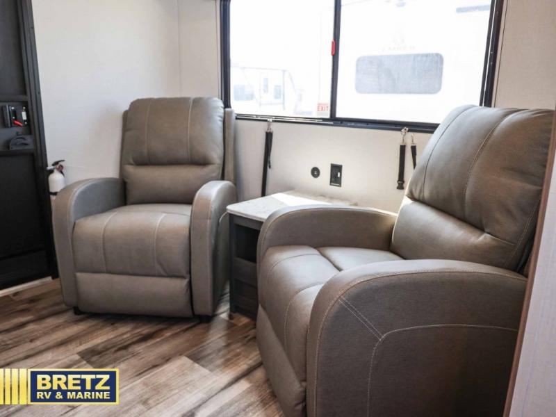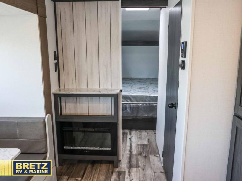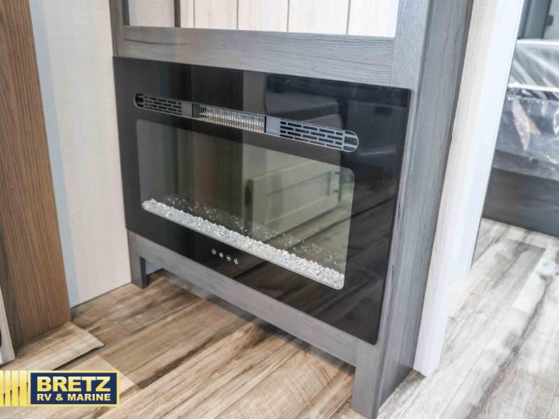 With dual entry doors, you can easily enter and exit this travel trailer! The jackknife sofa with footrest and booth dinette are next to each other near the fireplace, as well as two rear recliners allowing you to visit with other RVers or your family. The cook will have an ovenĀ and a microwave to make meals, and a 10 cu. ft. 12V refrigerator for cold items, plus a galley sink with high rise faucet to keep the dishes clean. Speaking of being clean, the full bathroom offers a shower with exhaust fan to eliminate unwanted steam as you clean yourself up after a fun day at the beach. The front private bedroom has a residential queen bed and one of the entrance/exit doors so you can slip out for an early morning fishing trip!