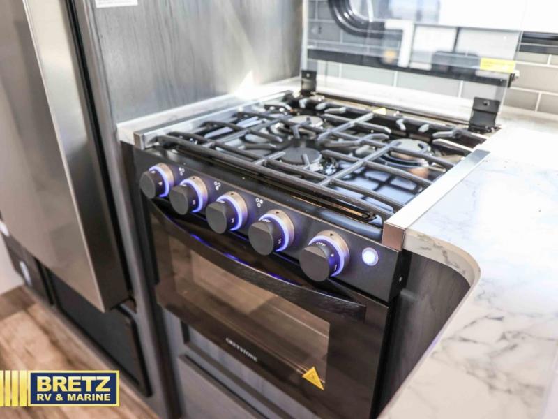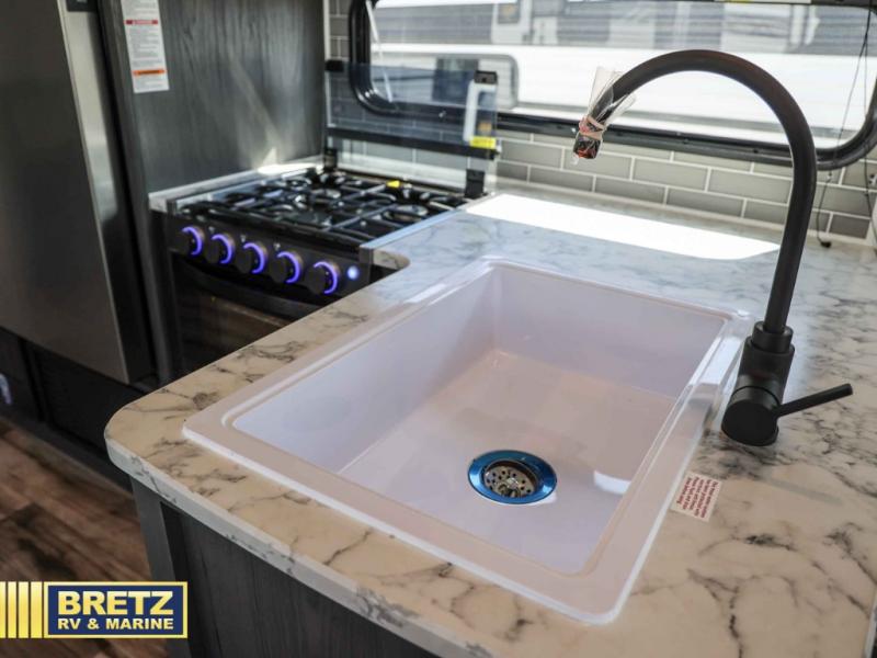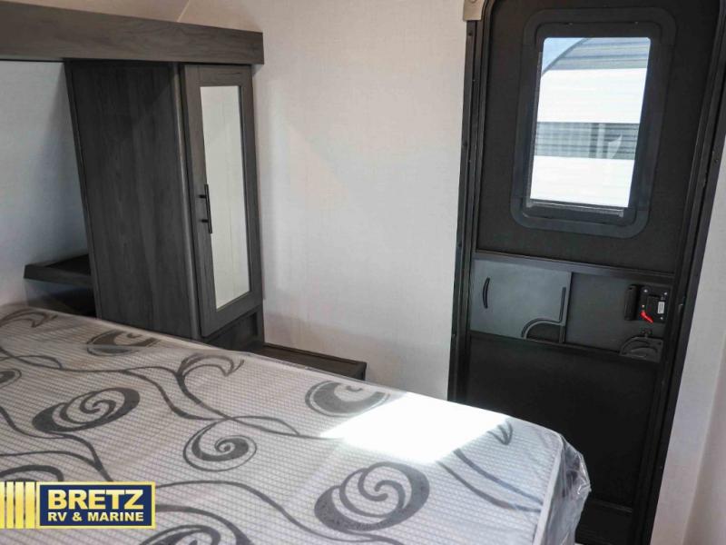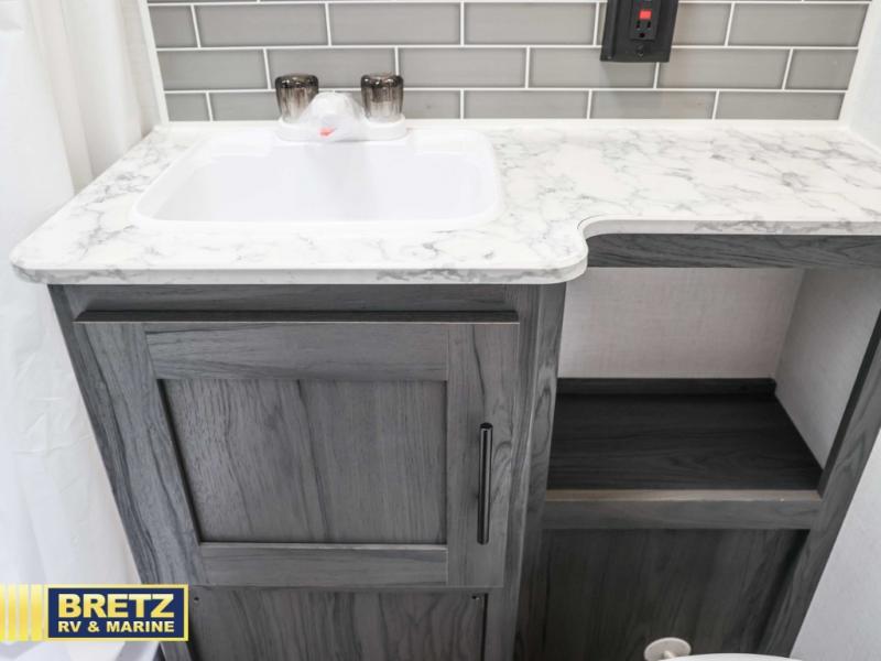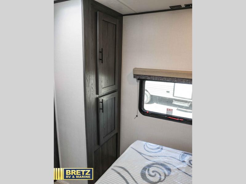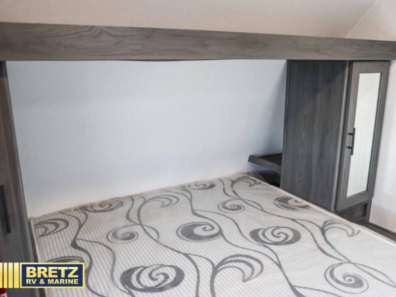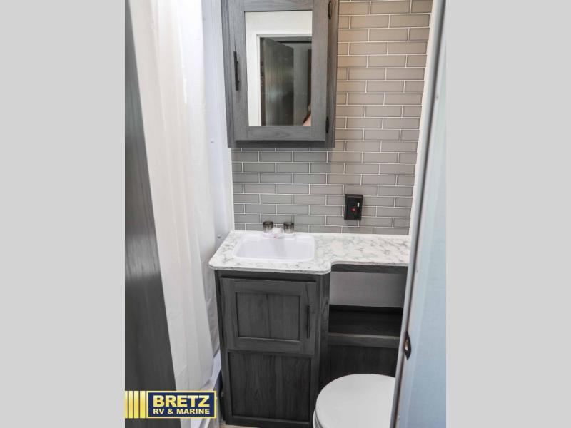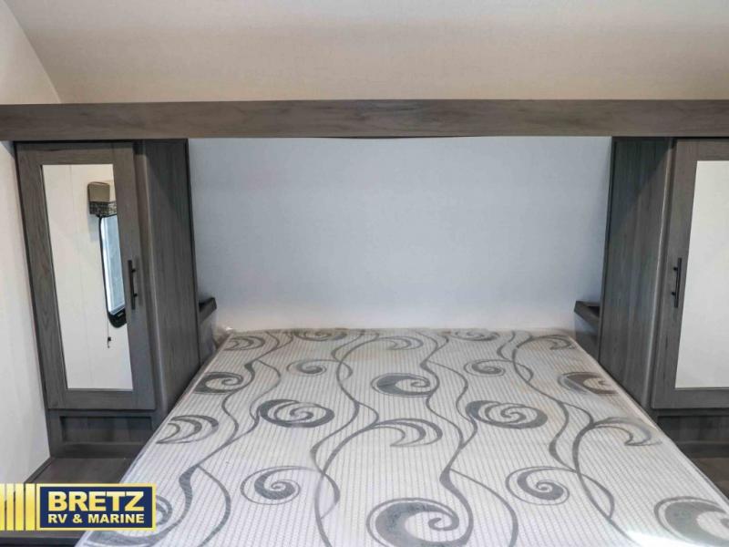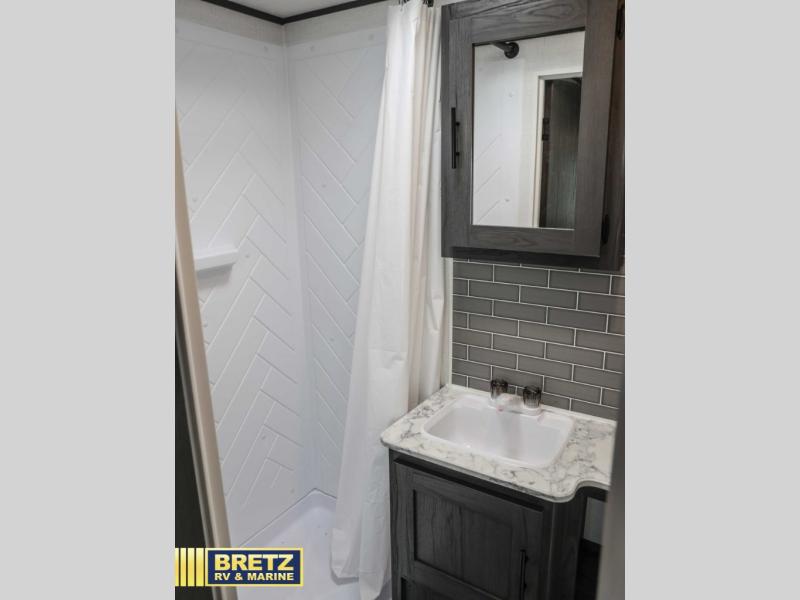 With dual entry doors, you can easily enter and exit this travel trailer! The jackknife sofa with footrest and booth dinette are next to each other near the fireplace, as well as two rear recliners allowing you to visit with other RVers or your family. The cook will have an ovenĀ and a microwave to make meals, and a 10 cu. ft. 12V refrigerator for cold items, plus a galley sink with high rise faucet to keep the dishes clean. Speaking of being clean, the full bathroom offers a shower with exhaust fan to eliminate unwanted steam as you clean yourself up after a fun day at the beach. The front private bedroom has a residential queen bed and one of the entrance/exit doors so you can slip out for an early morning fishing trip!