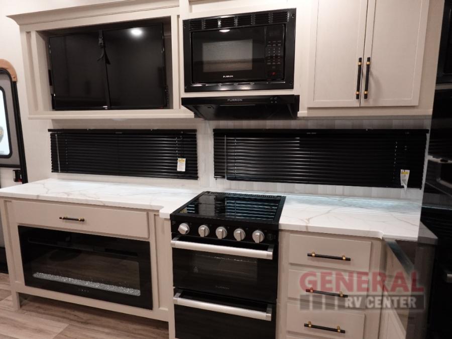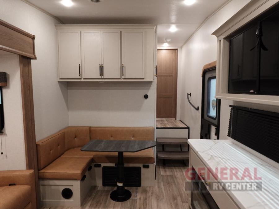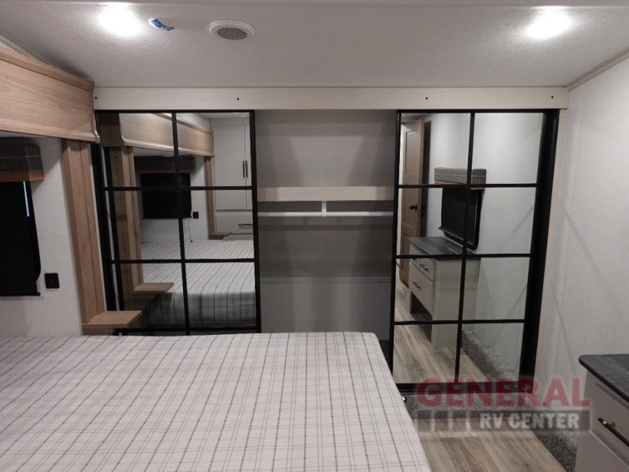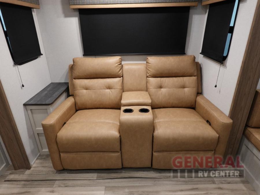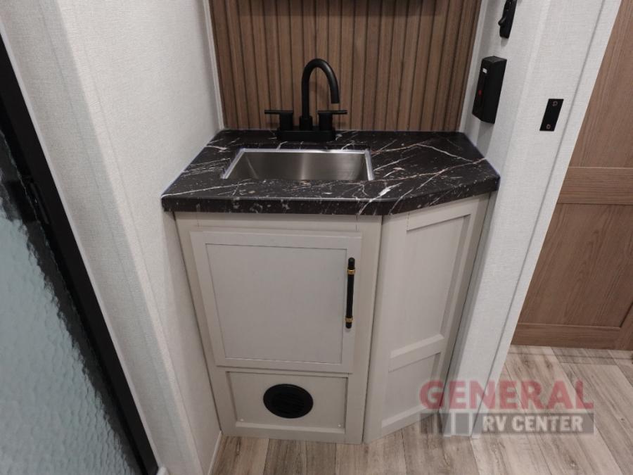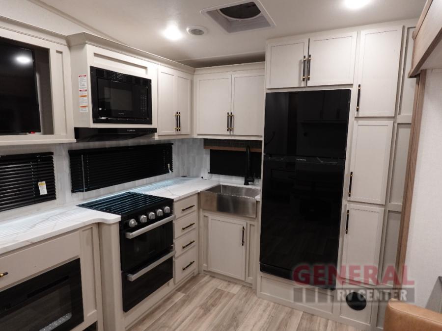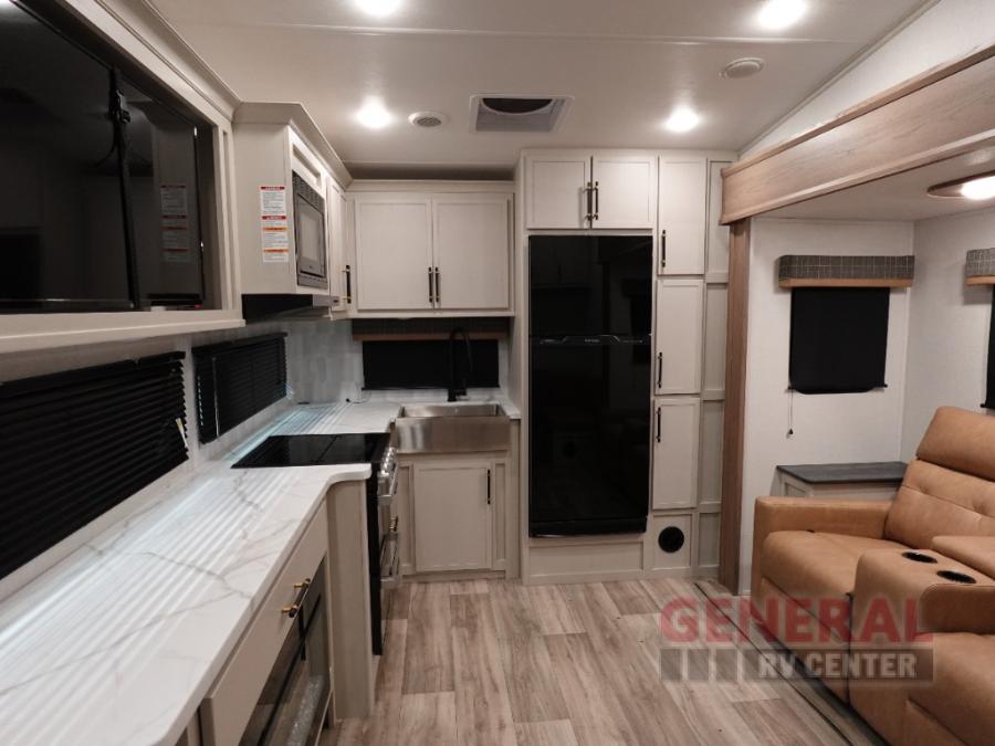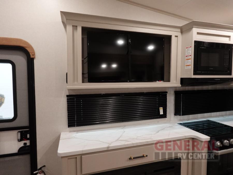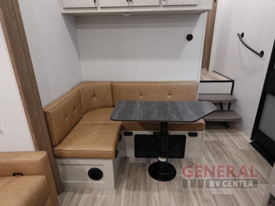 Plan to say awhile in this rear kitchen fifth wheel! You will fall in love with the front bedroom with a king bed slide out, large front closet, a dresser, plus a mounted TV for movies in bed. The rear kitchen includes plenty of space to prep meals, a farm style sink, plus a 10 cu. ft. 12V refrigerator and a pantry for food storage! You can get cozy on the theater seating slide out or at the cafe dinette, and the LED TV will ensure you'll never go bored on rainy days!