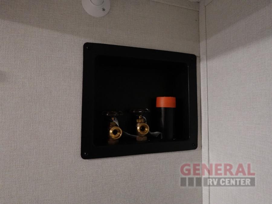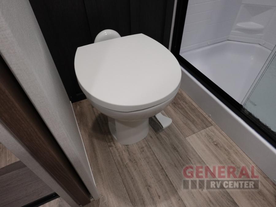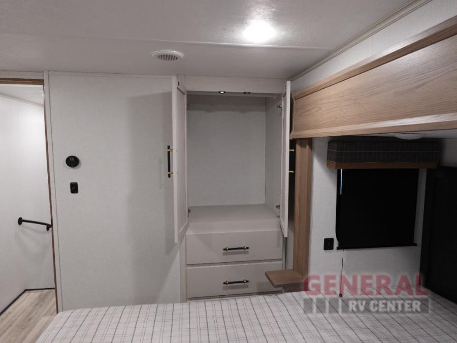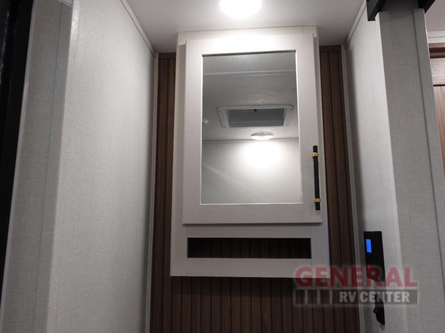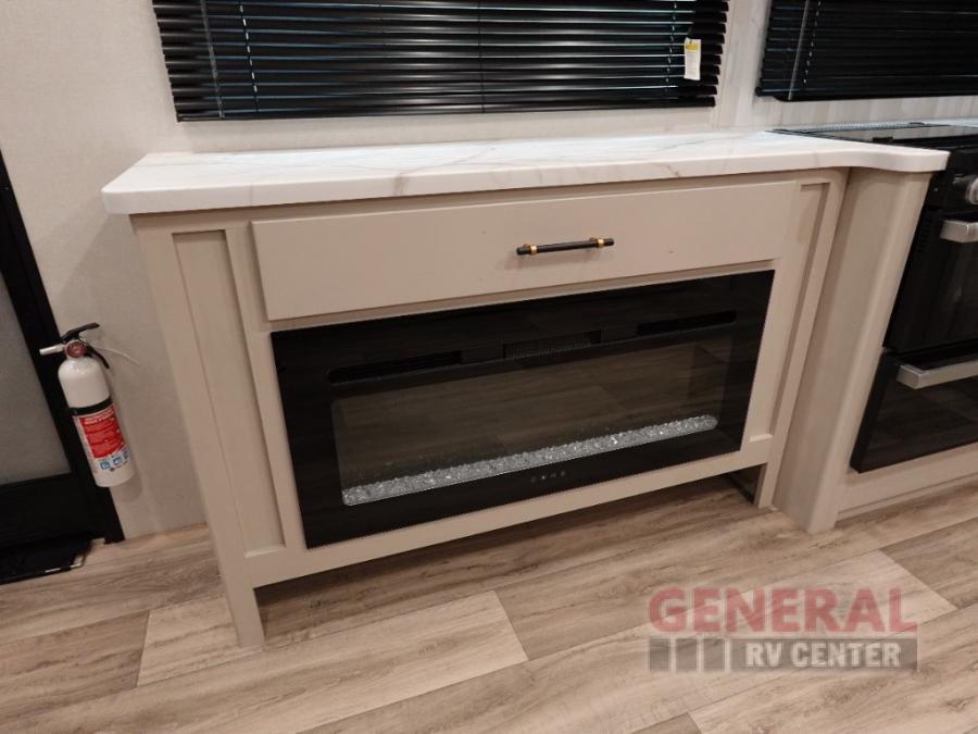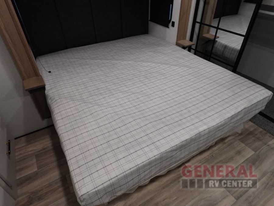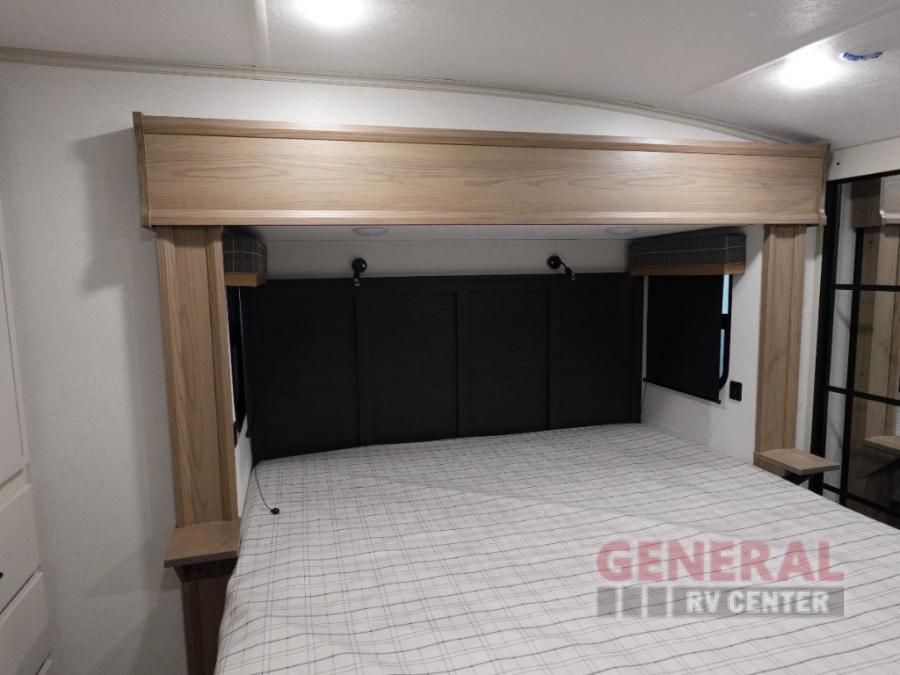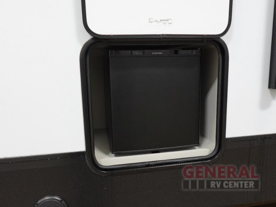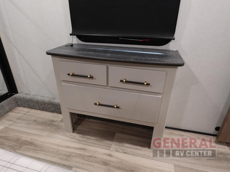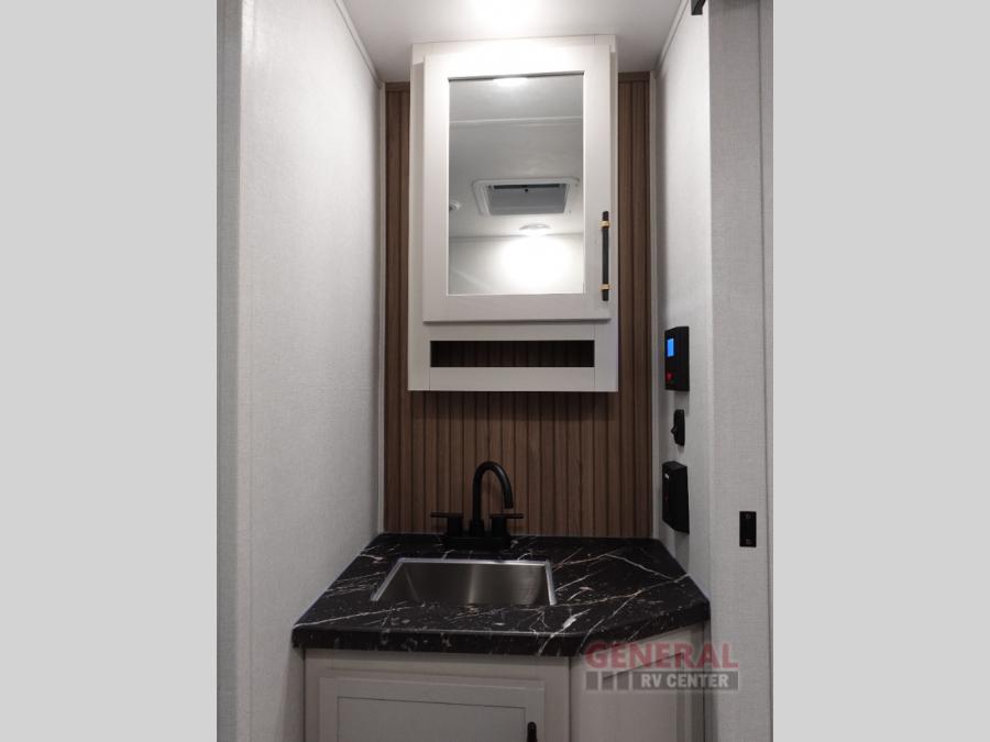 Plan to say awhile in this rear kitchen fifth wheel! You will fall in love with the front bedroom with a king bed slide out, large front closet, a dresser, plus a mounted TV for movies in bed. The rear kitchen includes plenty of space to prep meals, a farm style sink, plus a 10 cu. ft. 12V refrigerator and a pantry for food storage! You can get cozy on the theater seating slide out or at the cafe dinette, and the LED TV will ensure you'll never go bored on rainy days!