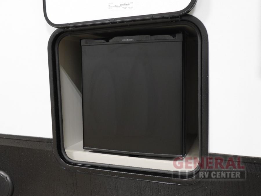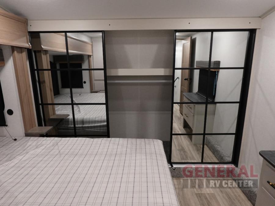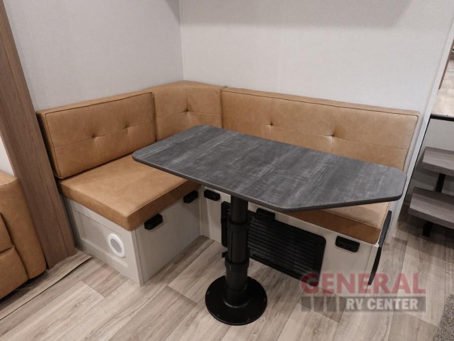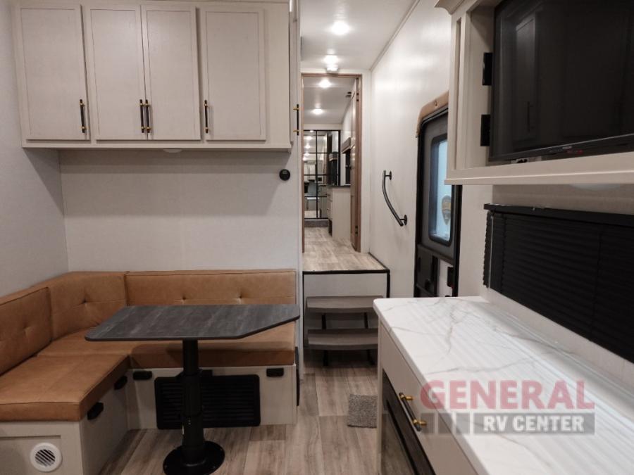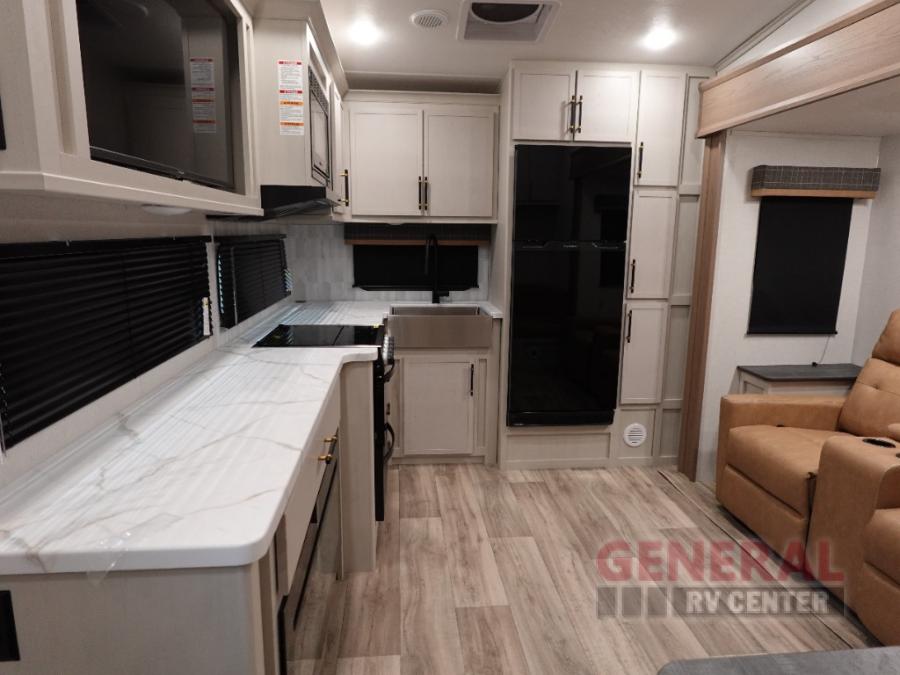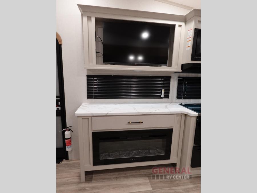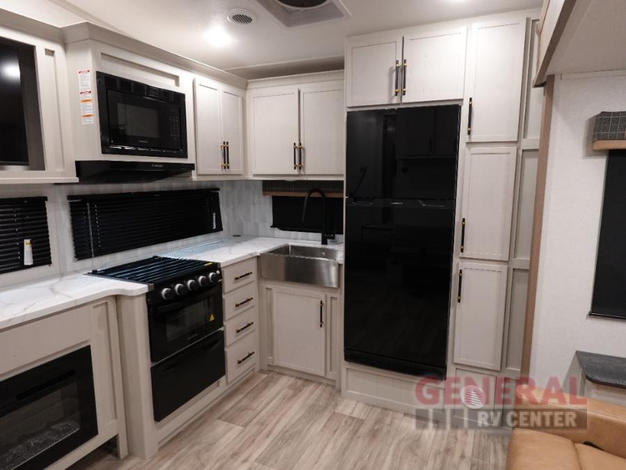 Plan to say awhile in this rear kitchen fifth wheel! You will fall in love with the front bedroom with a king bed slide out, large front closet, a dresser, plus a mounted TV for movies in bed. The rear kitchen includes plenty of space to prep meals, a farm style sink, plus a 10 cu. ft. 12V refrigerator and a pantry for food storage! You can get cozy on the theater seating slide out or at the cafe dinette, and the LED TV will ensure you'll never go bored on rainy days!