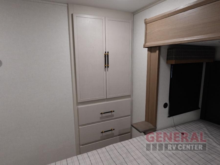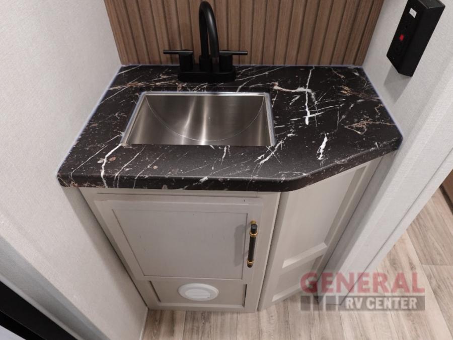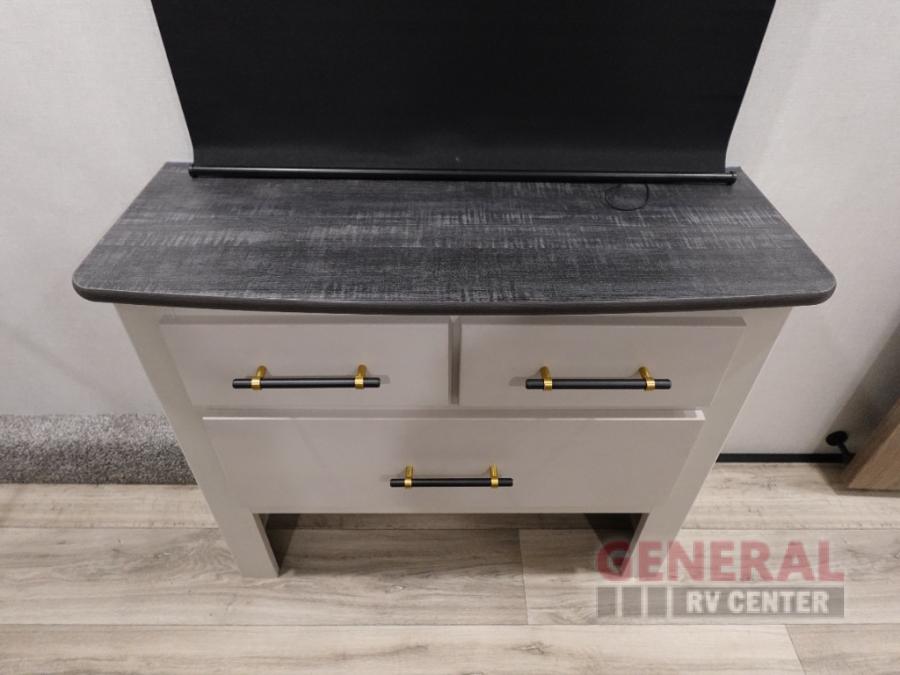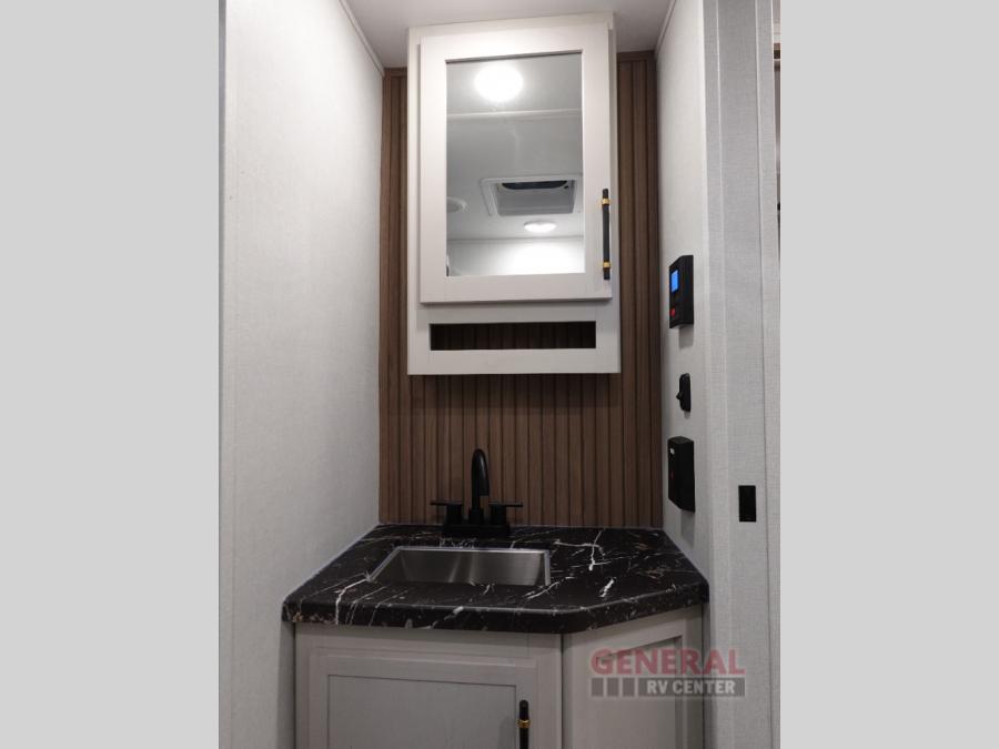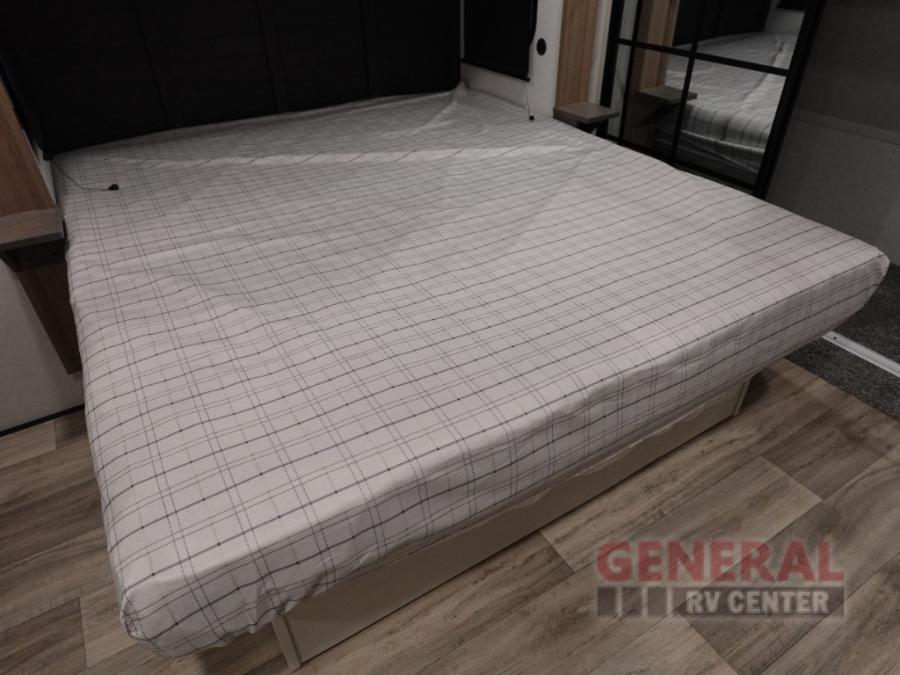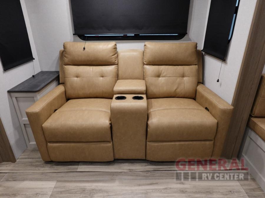 Plan to say awhile in this rear kitchen fifth wheel! You will fall in love with the front bedroom with a king bed slide out, large front closet, a dresser, plus a mounted TV for movies in bed. The rear kitchen includes plenty of space to prep meals, a farm style sink, plus a 10 cu. ft. 12V refrigerator and a pantry for food storage! You can get cozy on the theater seating slide out or at the cafe dinette, and the LED TV will ensure you'll never go bored on rainy days!