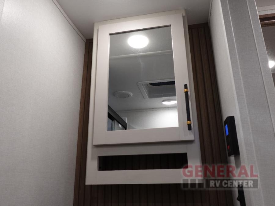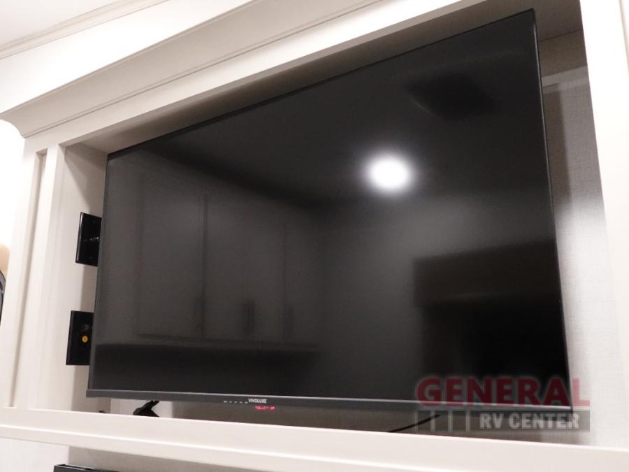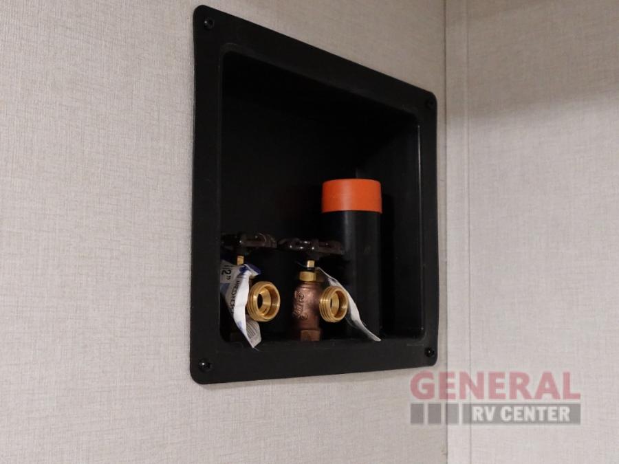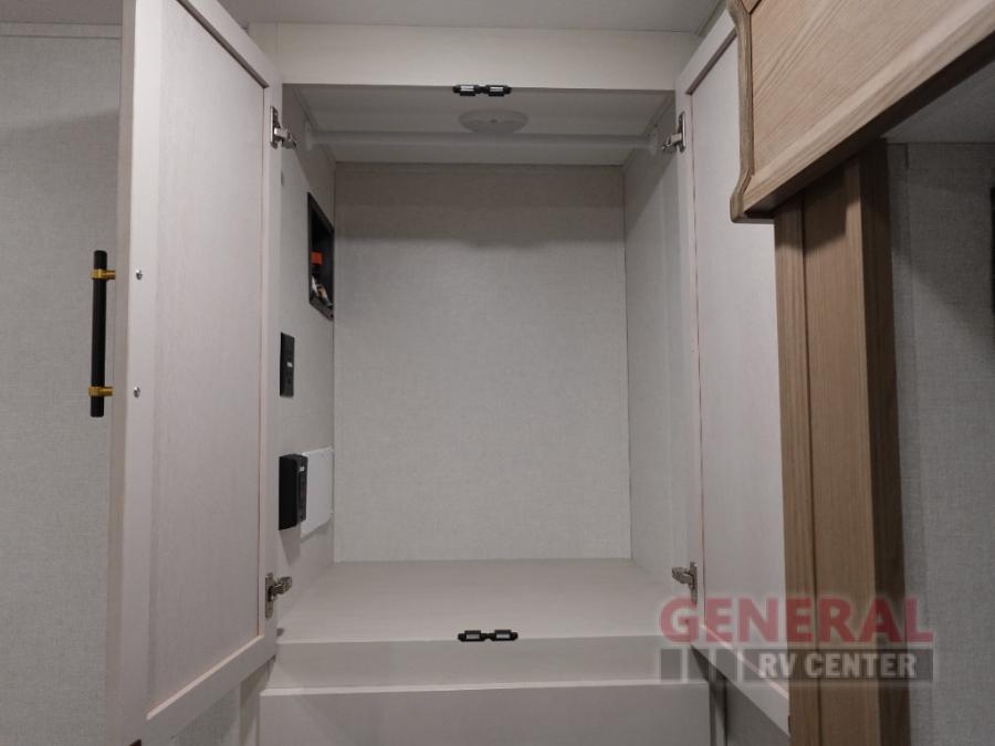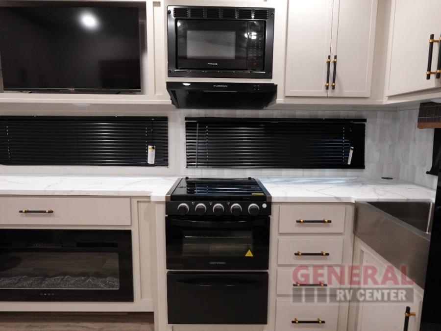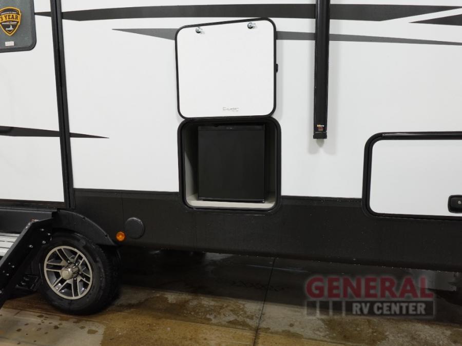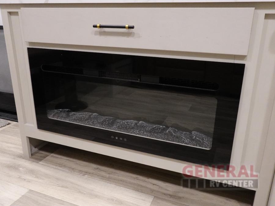 Plan to say awhile in this rear kitchen fifth wheel! You will fall in love with the front bedroom with a king bed slide out, large front closet, a dresser, plus a mounted TV for movies in bed. The rear kitchen includes plenty of space to prep meals, a farm style sink, plus a 10 cu. ft. 12V refrigerator and a pantry for food storage! You can get cozy on the theater seating slide out or at the cafe dinette, and the LED TV will ensure you'll never go bored on rainy days!