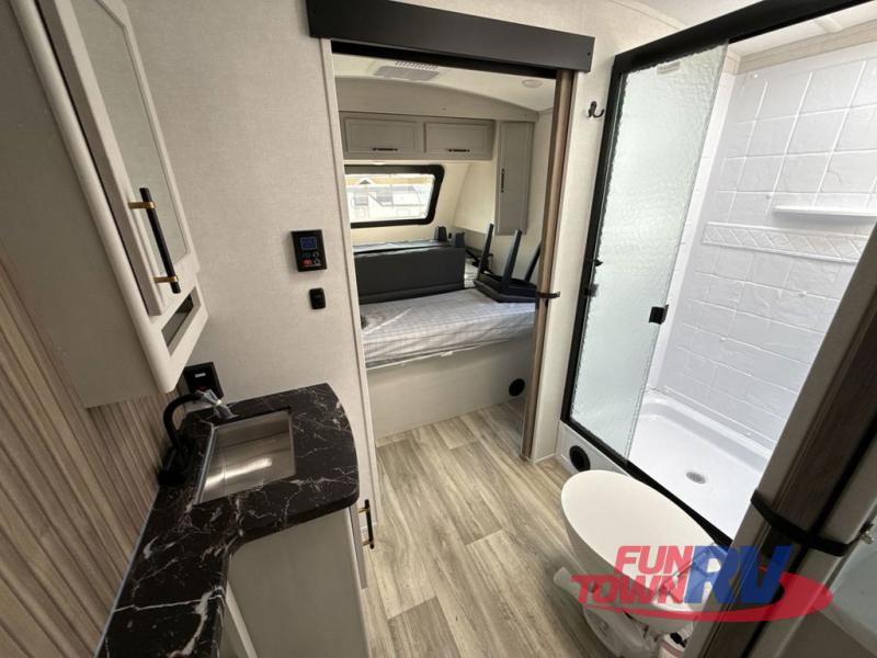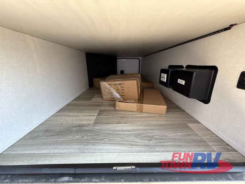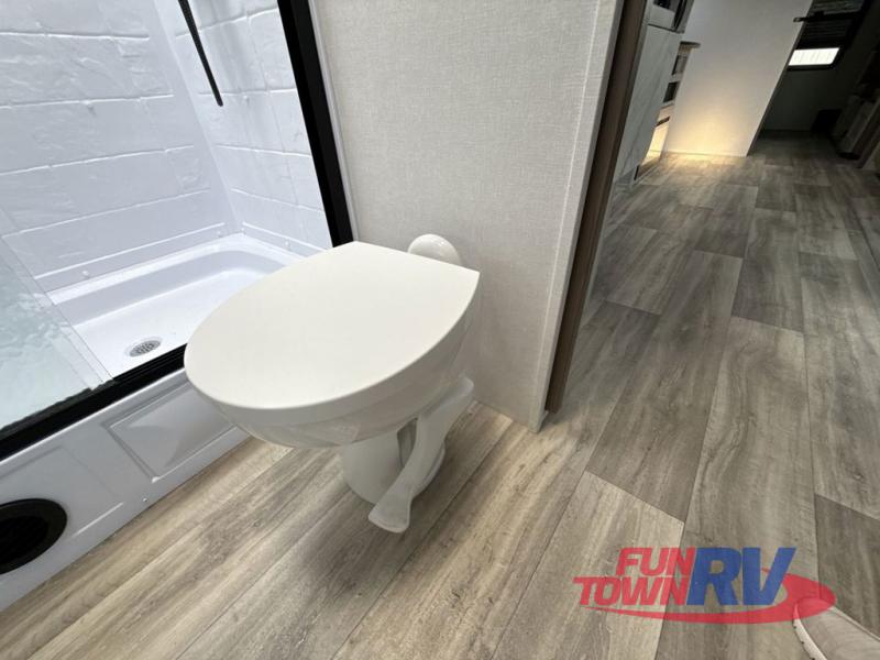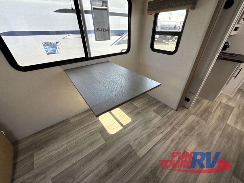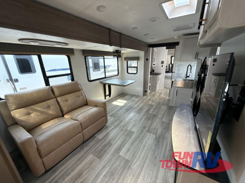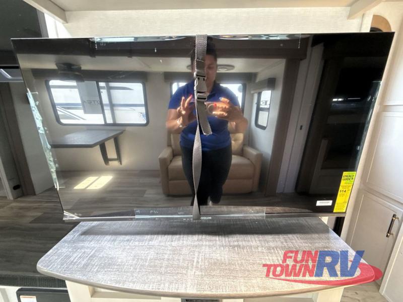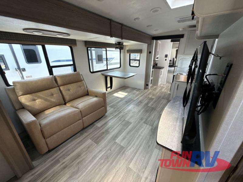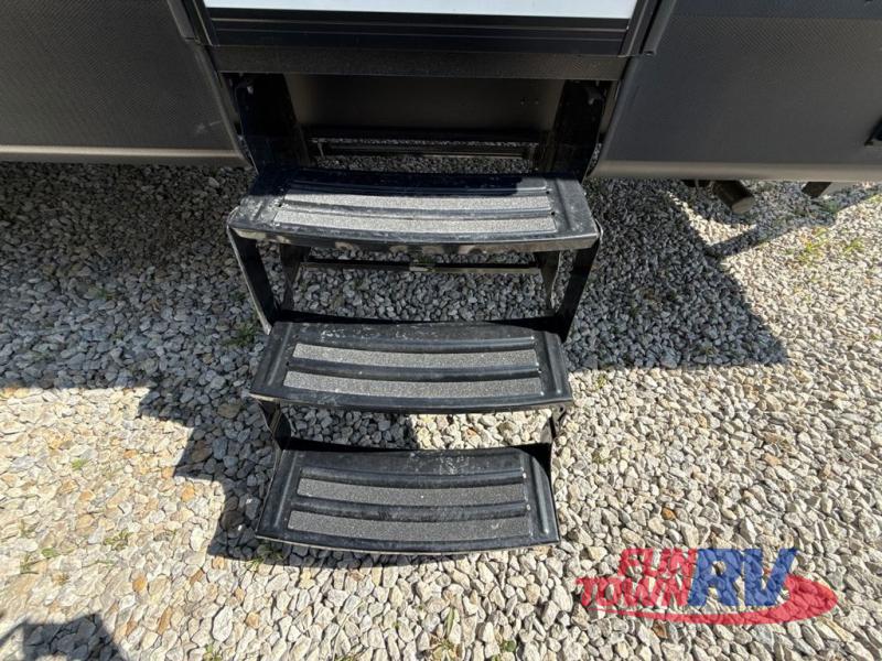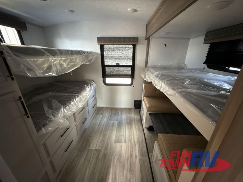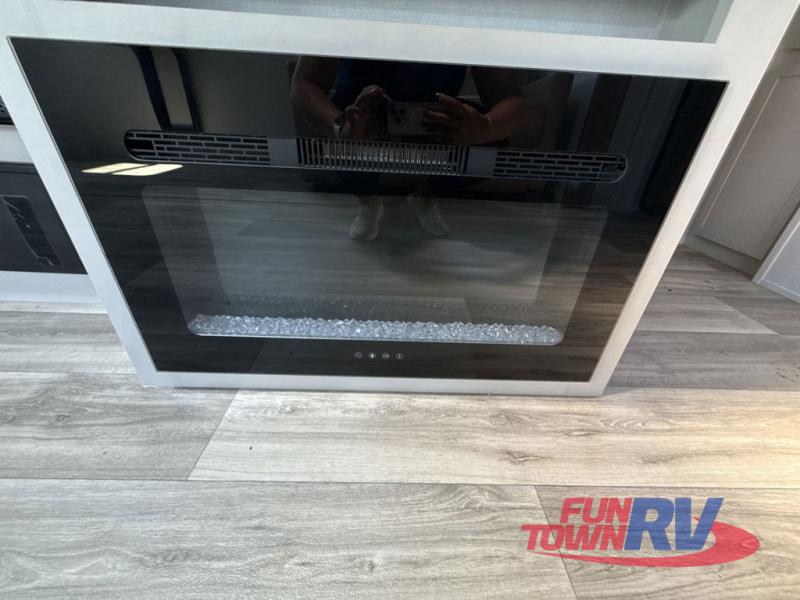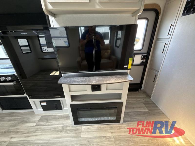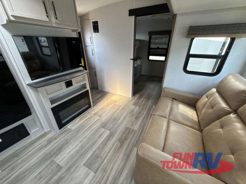 There are plenty of sleeping spaces for everyone in this travel trailer! From the rear private bunkhouse with a set of bunk beds along one side and a bunk bed above a sofa on the other to the front private bedroom with a king bed. You can even transform the tri-fold sofa and U-shaped dinette slide into extra sleeping spaces if needed. The walk-through bathroom has everything you will need to freshen up each morning. The chef will love cooking indoors with the glass top three burner cooktop with an oven, yet may love cooking at the outdoor kitchen even more. Grab a snack from the walk-in pantry behind the entertainment center and watch your favorite movie on the LED TV while a fire roars in the fireplace!