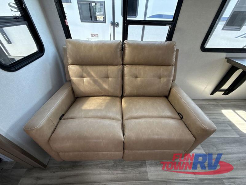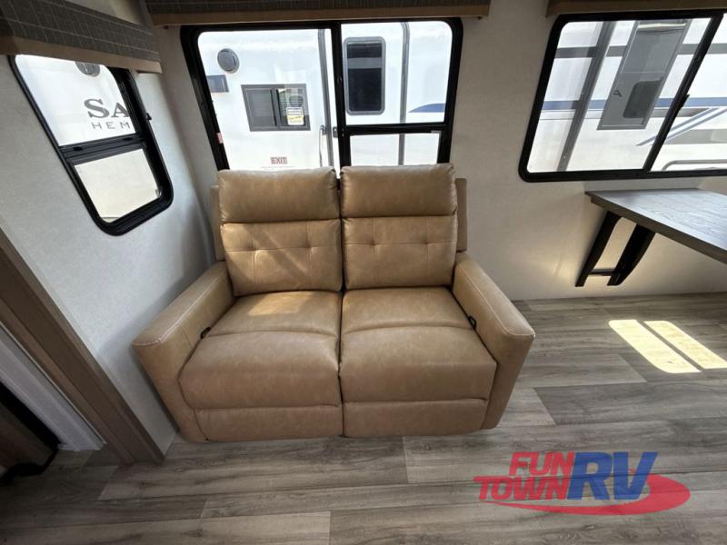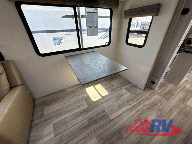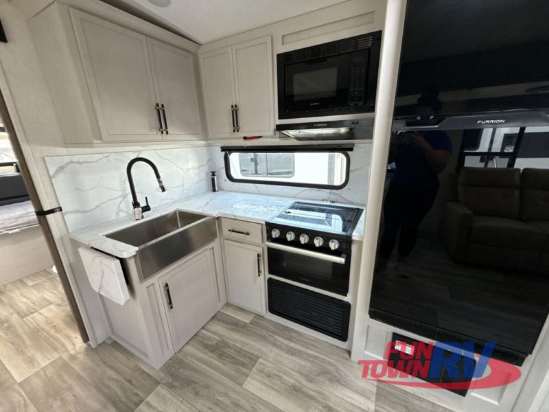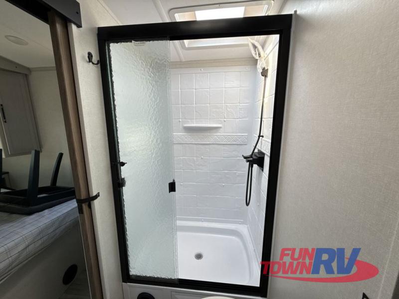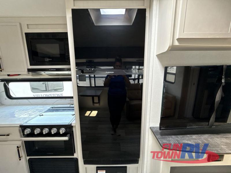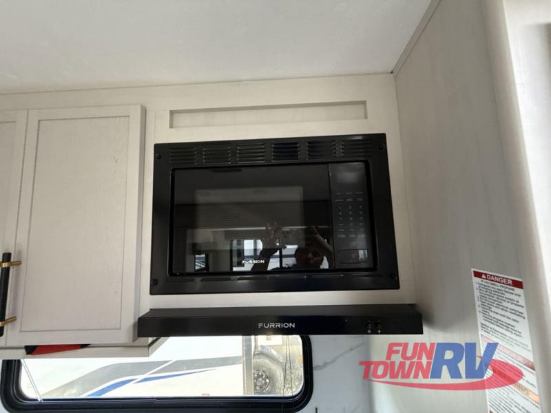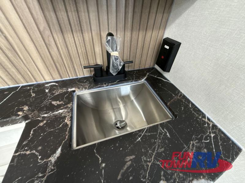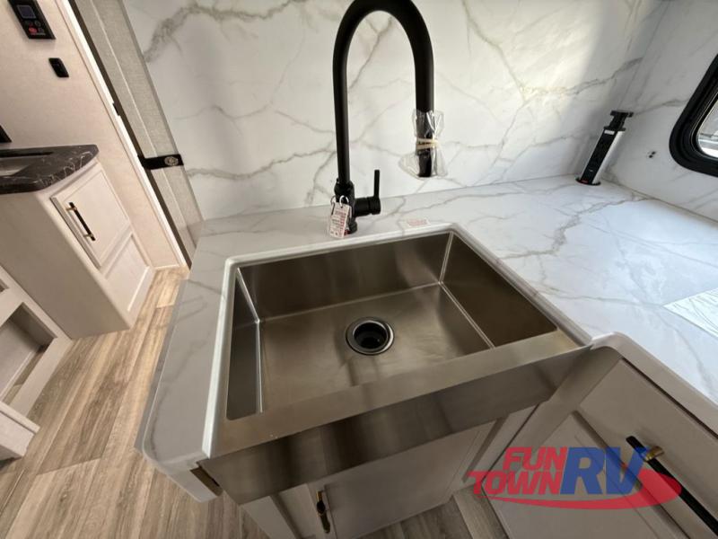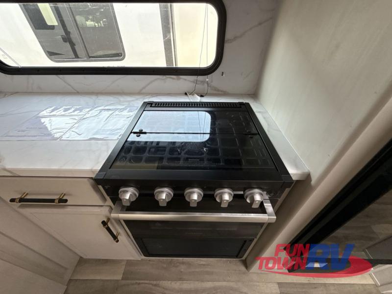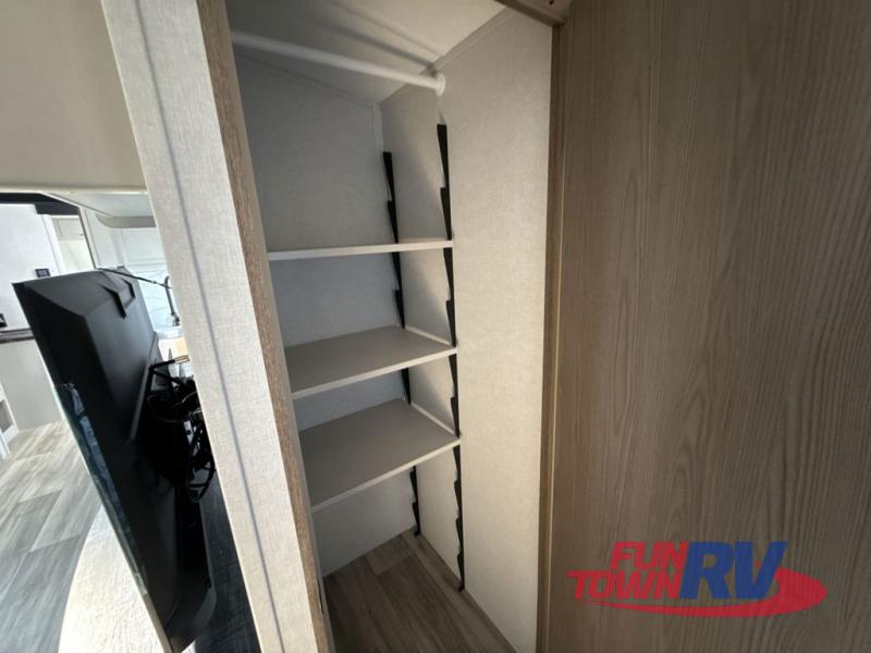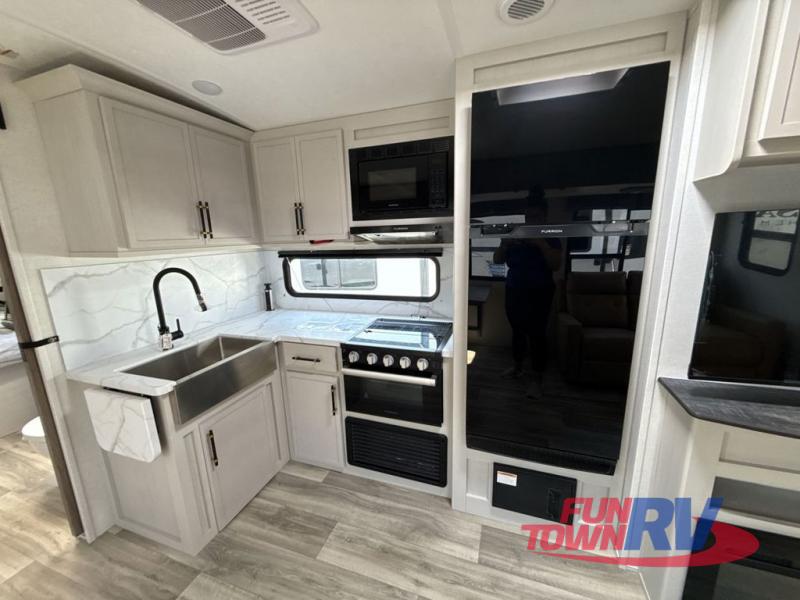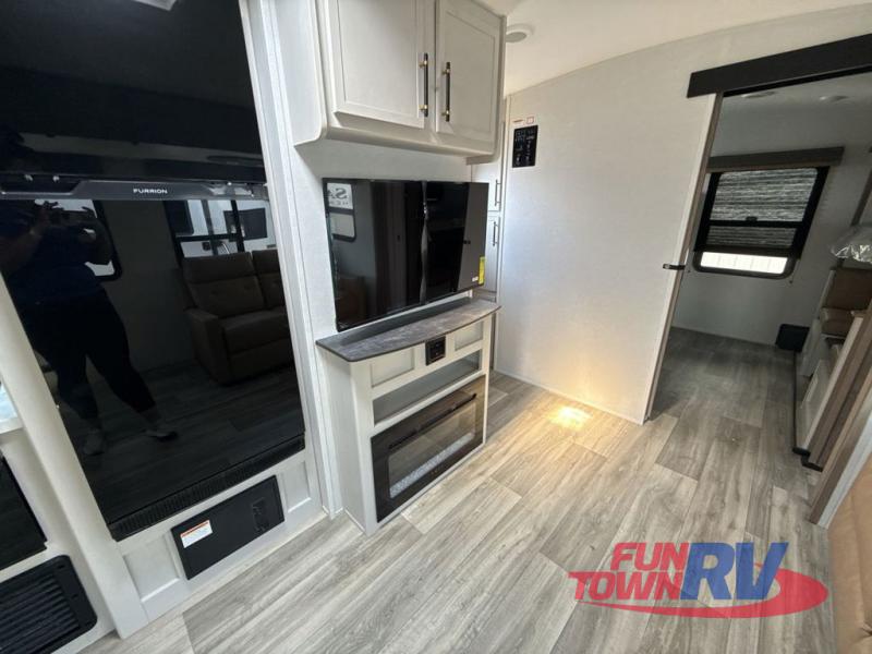 There are plenty of sleeping spaces for everyone in this travel trailer! From the rear private bunkhouse with a set of bunk beds along one side and a bunk bed above a sofa on the other to the front private bedroom with a king bed. You can even transform the tri-fold sofa and U-shaped dinette slide into extra sleeping spaces if needed. The walk-through bathroom has everything you will need to freshen up each morning. The chef will love cooking indoors with the glass top three burner cooktop with an oven, yet may love cooking at the outdoor kitchen even more. Grab a snack from the walk-in pantry behind the entertainment center and watch your favorite movie on the LED TV while a fire roars in the fireplace!