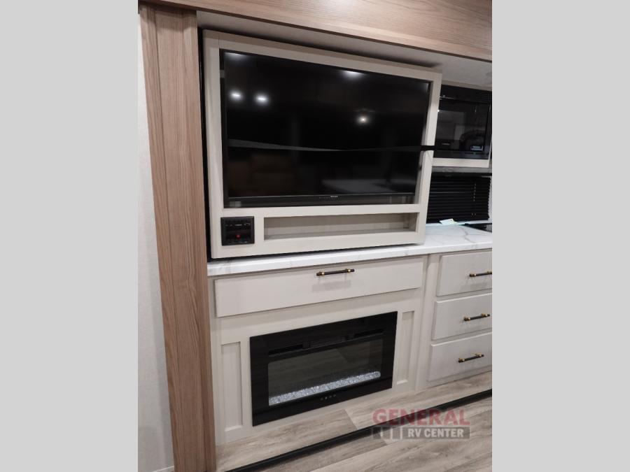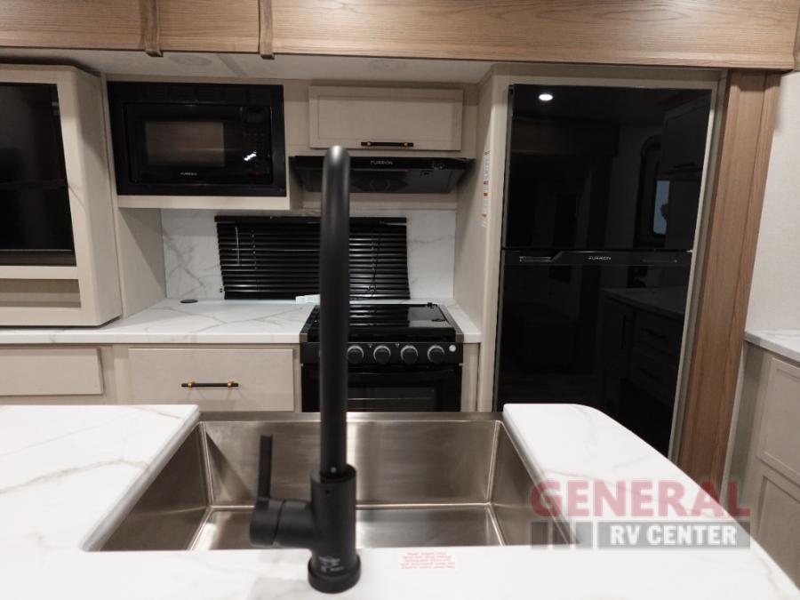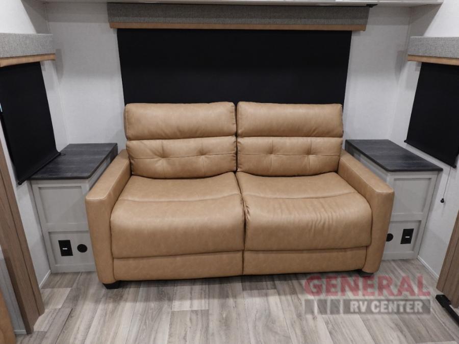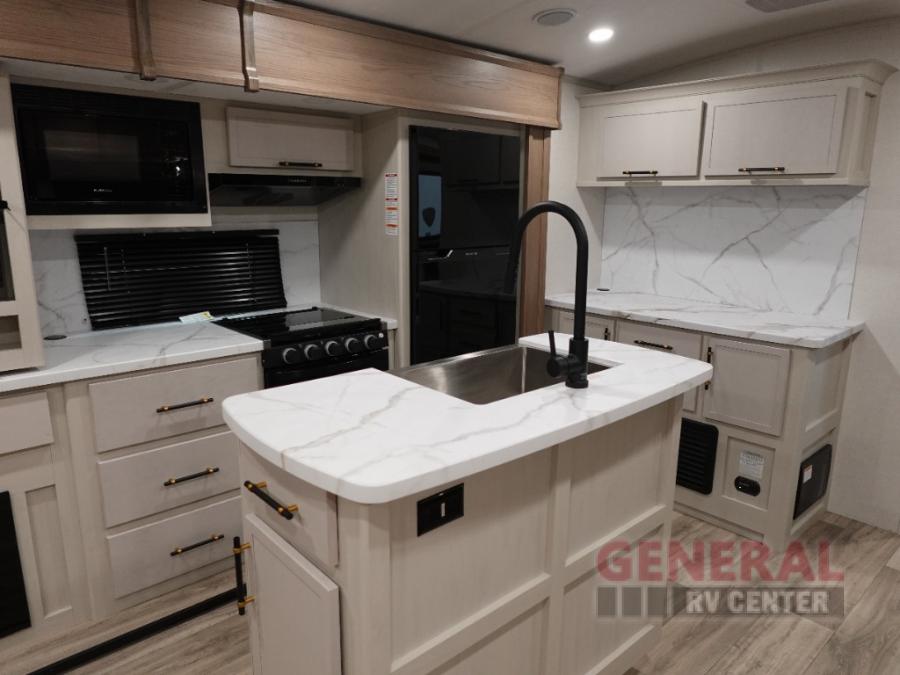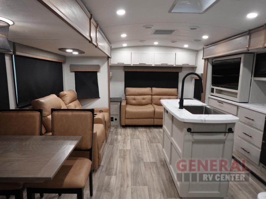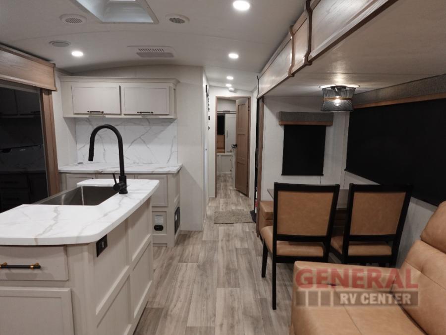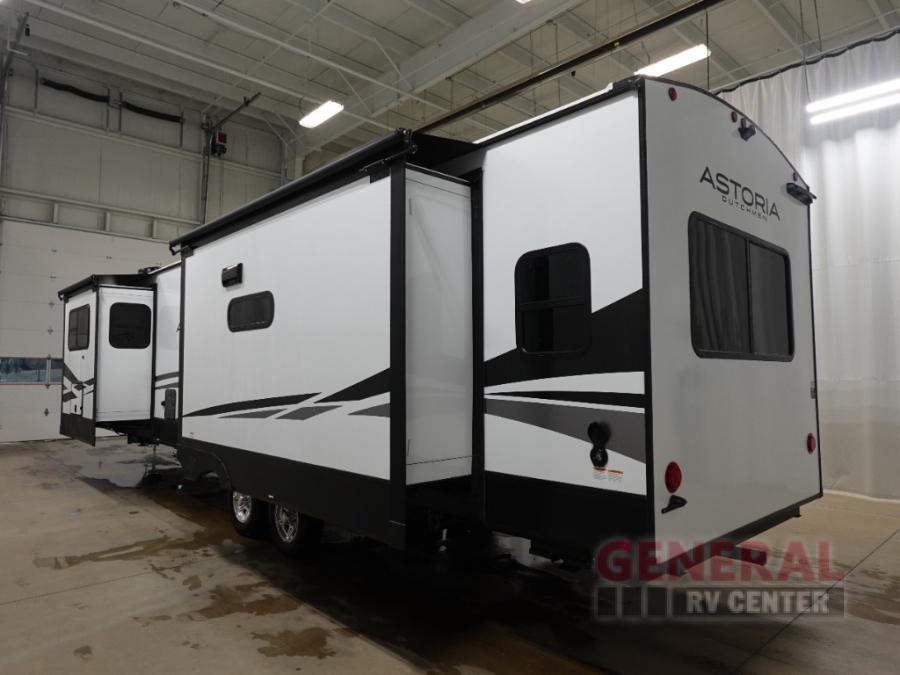 Feel at home the very first time you step into this triple slide Astoria travel trailer.  You will love the spacious feel with opposing slides in the main living/kitchen area to the left of the door. A booth dinette and theater seating can be found in the slide along the curbside, and a tri-fold sofa along the rear wall all providing ample seating for your family and friends to enjoy.  A kitchen island features a farm-style sink, and the upgraded kitchen also features stainless steel appliances which will provide all that you need for preparing and cooking while you travel. Rest easy at night on a comfortable king bed and find ample storage throughout. This all weather unit features an enclosed underbelly which makes full time RVing easy, and part-time travel something that you can do in any season, not just the summer!