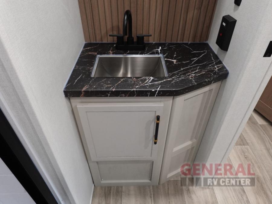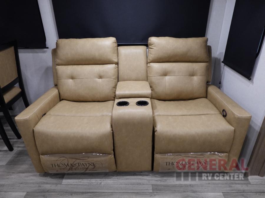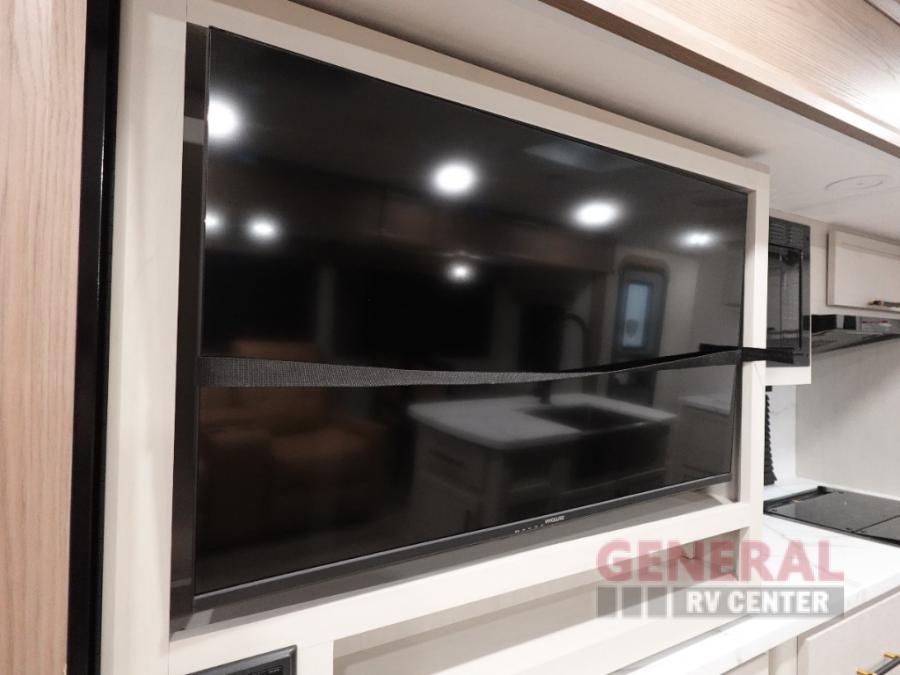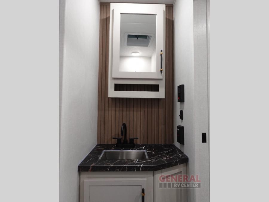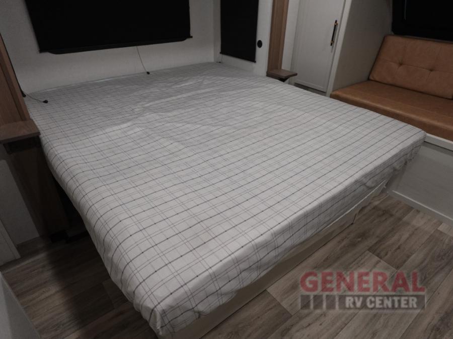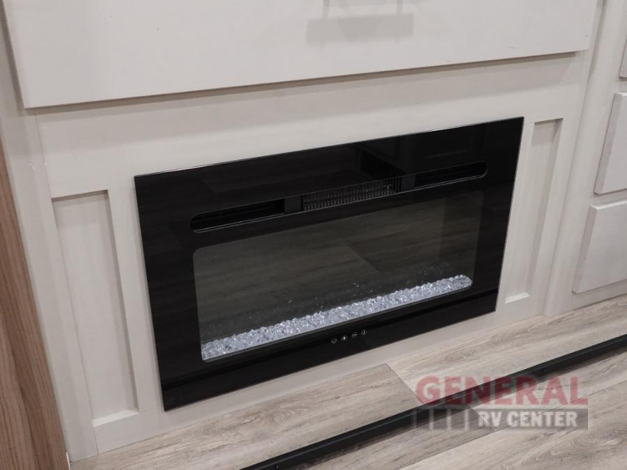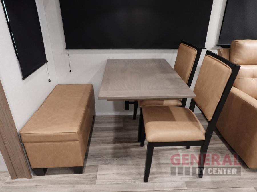 Feel at home the very first time you step into this triple slide Astoria travel trailer.  You will love the spacious feel with opposing slides in the main living/kitchen area to the left of the door. A booth dinette and theater seating can be found in the slide along the curbside, and a tri-fold sofa along the rear wall all providing ample seating for your family and friends to enjoy.  A kitchen island features a farm-style sink, and the upgraded kitchen also features stainless steel appliances which will provide all that you need for preparing and cooking while you travel. Rest easy at night on a comfortable king bed and find ample storage throughout. This all weather unit features an enclosed underbelly which makes full time RVing easy, and part-time travel something that you can do in any season, not just the summer!