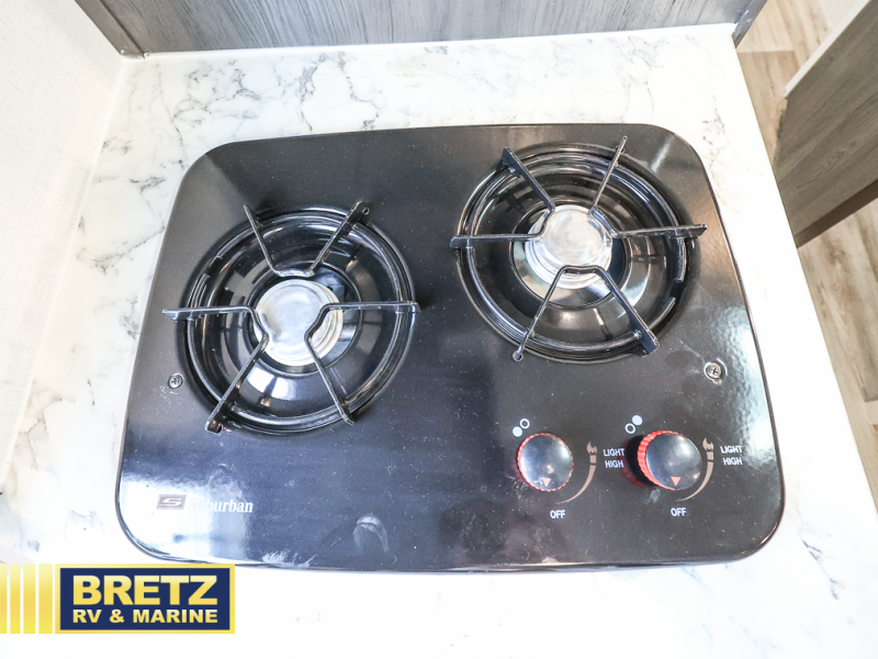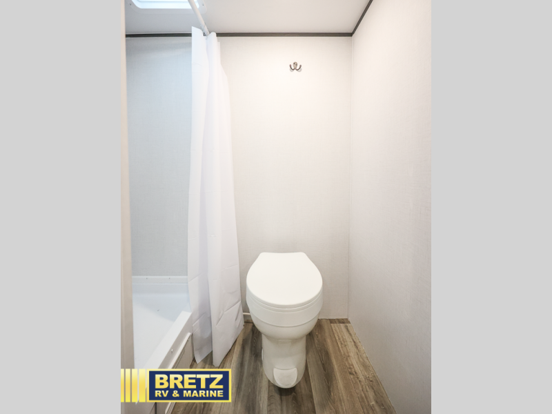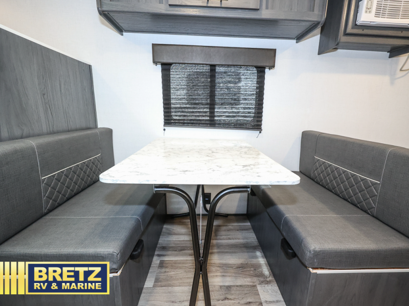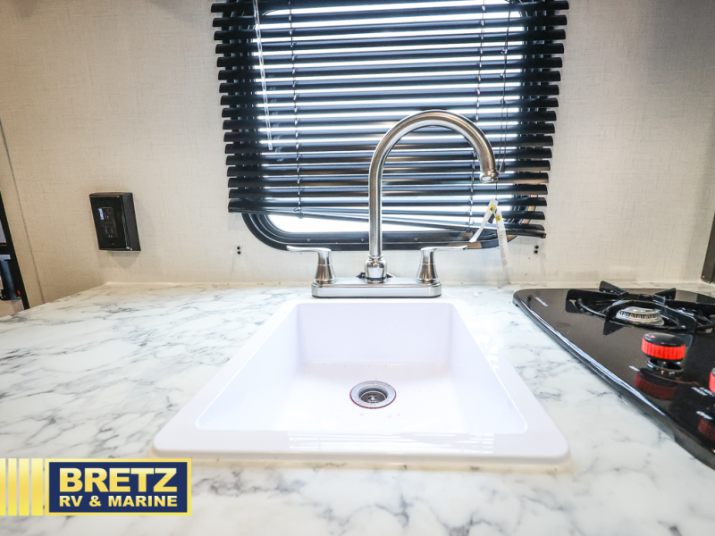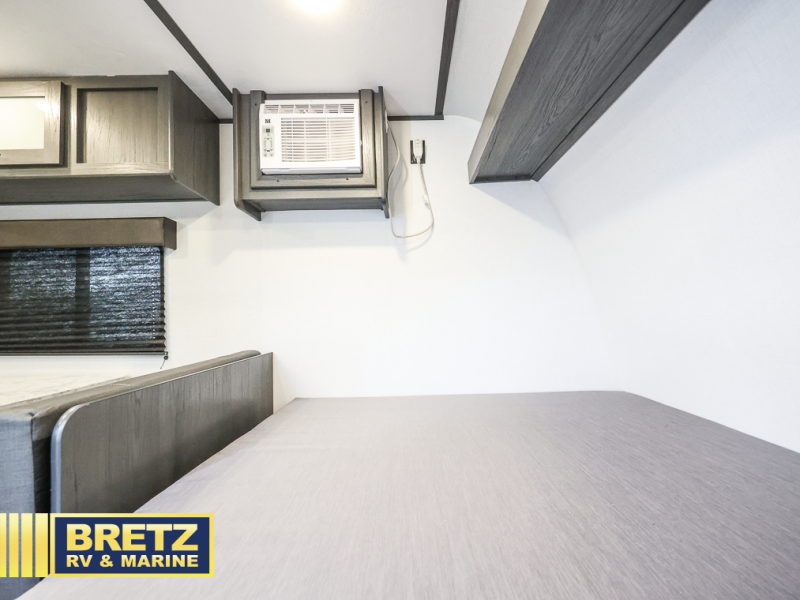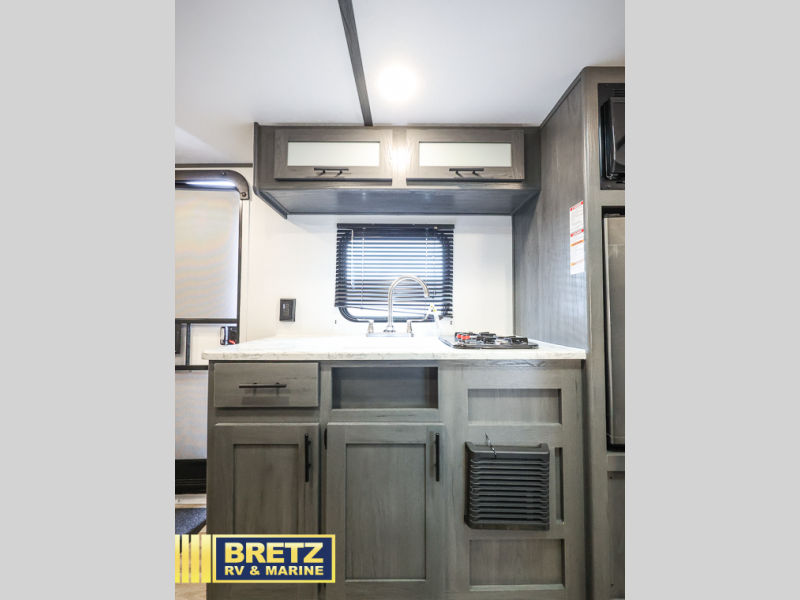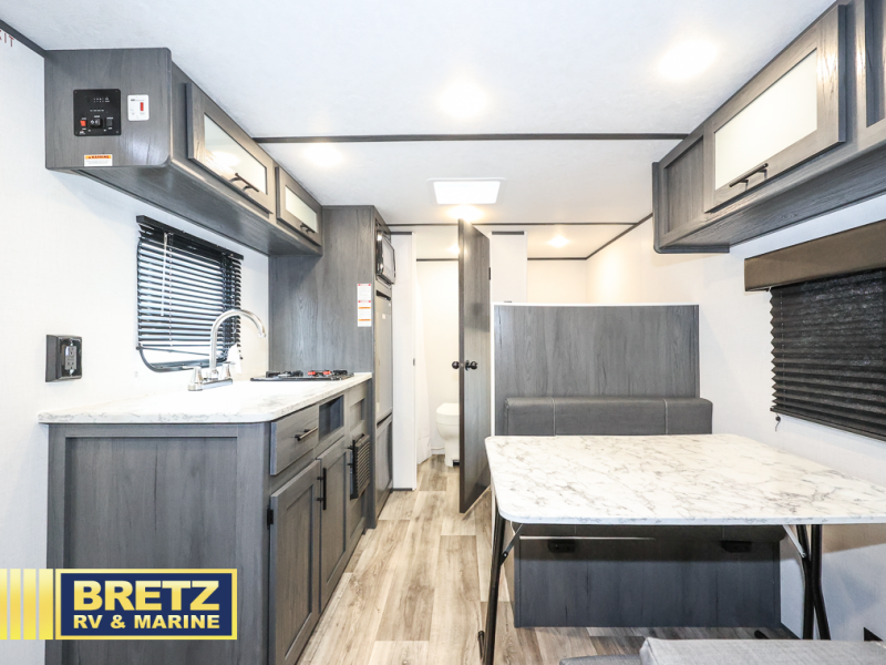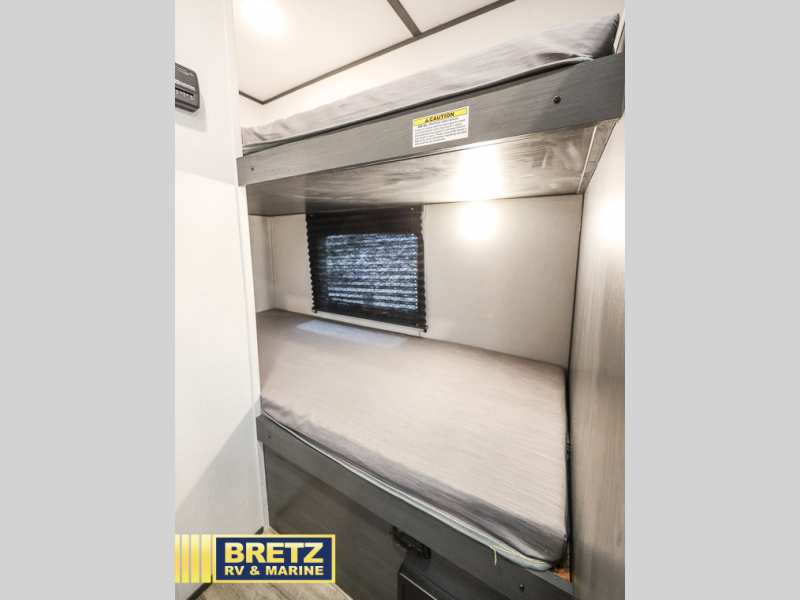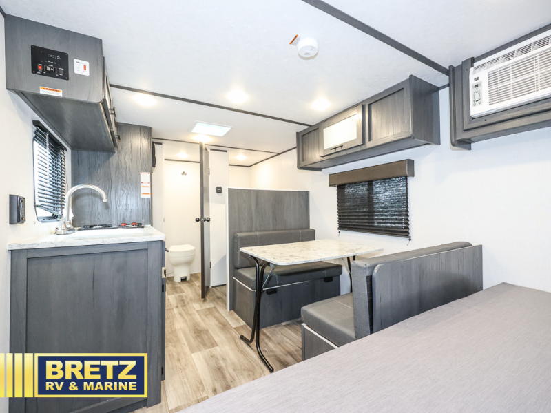A perfect trailer for your family of three to five featuring a set of bunk beds for the kids or guests, a queen bed up front for you, and the booth dinette can be converted to sleep one or two more depending on size. This unit is cozy and convenient providing you just what you need to enjoy a little adventure away from home. For meals, there is a cooktop and sink, plus a refrigerator for your perishables. You will all appreciate the convenience of having your own private bath so that you don't need to use the campground facilities at night. You will also enjoy spending time outside with an 8' awning to provide even more living space outdoors!