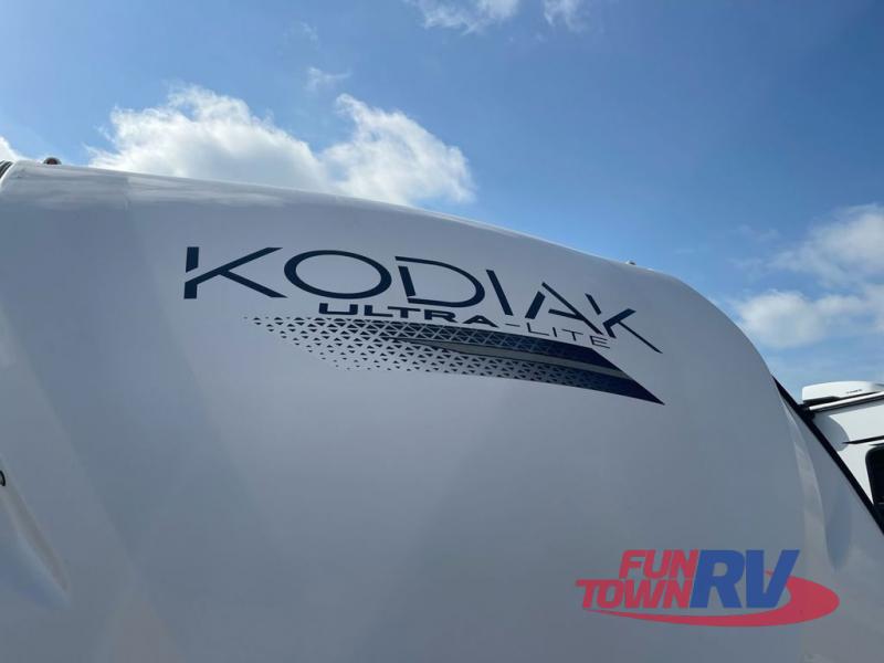 Each Kodiak travel trailer by Dutchmen includes a diamond front plate, easy lube axles, and a power tongue jack for hassle-free towing. The bear cave storage will allow you to bring along all the camp gear, and the power awning with an LED light will create an inviting outdoor space. Head inside to enjoy the designer valances, blackout roller shades, and seamless countertops. There is also HyperDeck flooring that will withstand your many adventures plus a 6' 8" interior height for more head room. A high output furnace and 13.5k BTU A/C will keep you comfortable, and the on-demand tankless water heater will provide instant hot water when you need it!