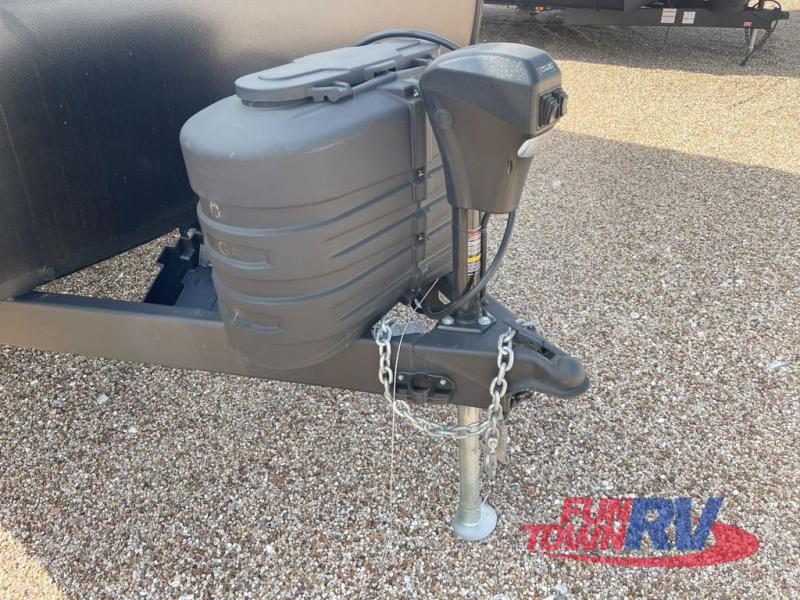 You'll love every minute spent in this spacious travel trailer. There is a front private bedroom with a king bed and dual bedside closets to keep your things organized. The jack knife sofa sits across from the fireplace so you can enjoy your evenings indoors, and the hidden convertible bunk is behind the entertainment center for a smart usage of space! The full kitchen features ample counter space, along with a concession style window, so while the chef is cooking, they can visit with those on the rear fold-down porch.
