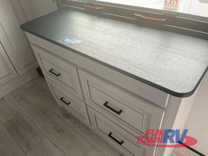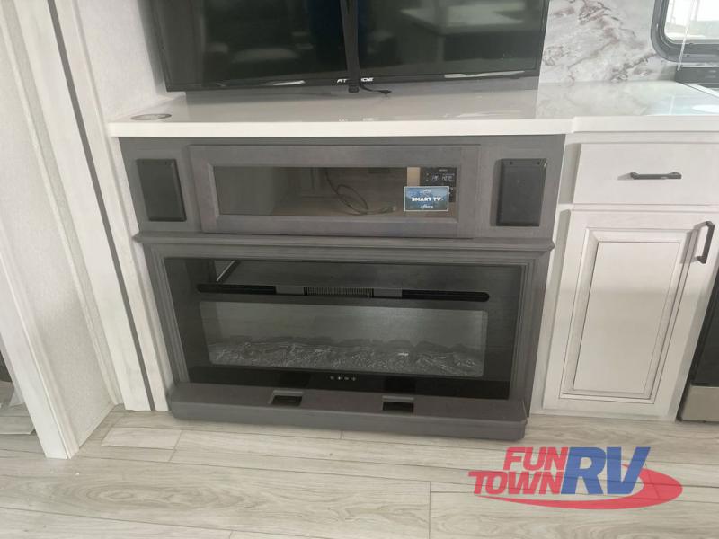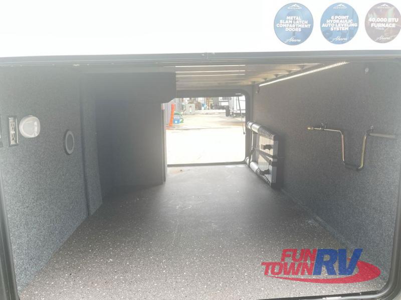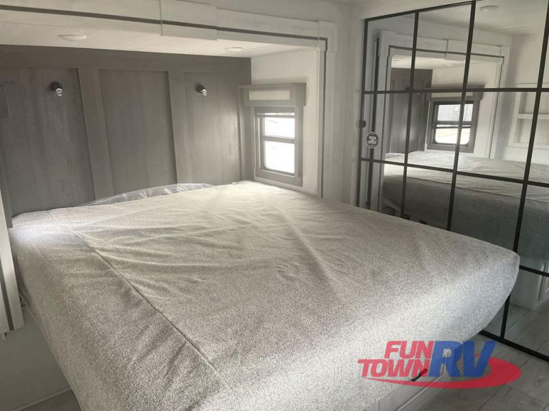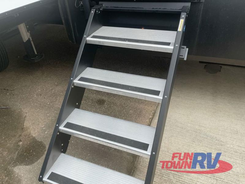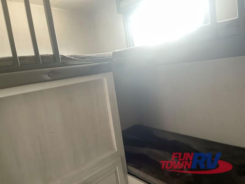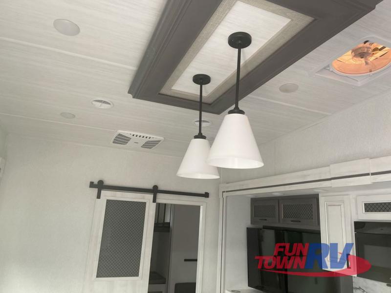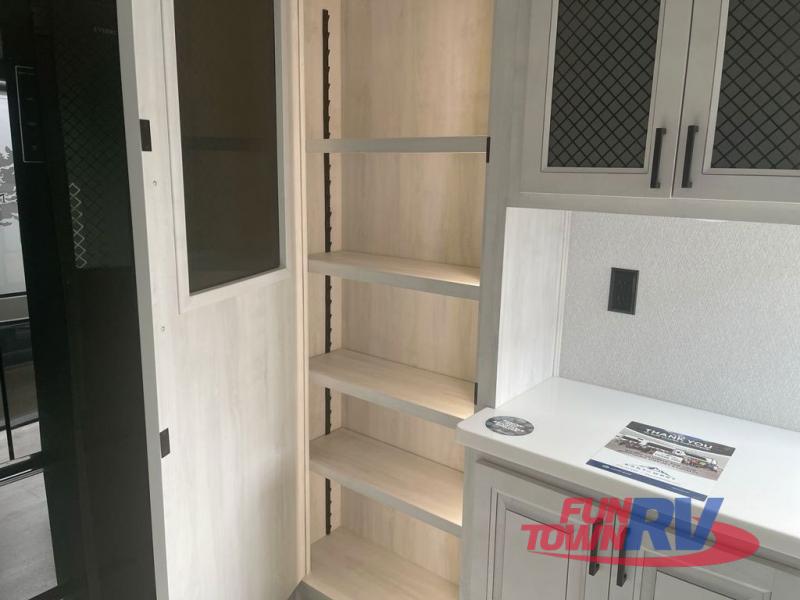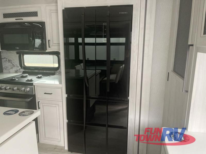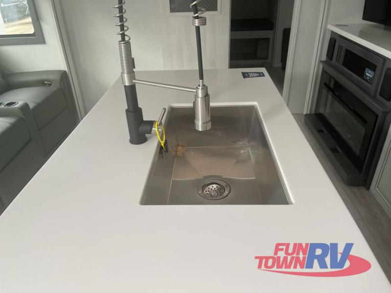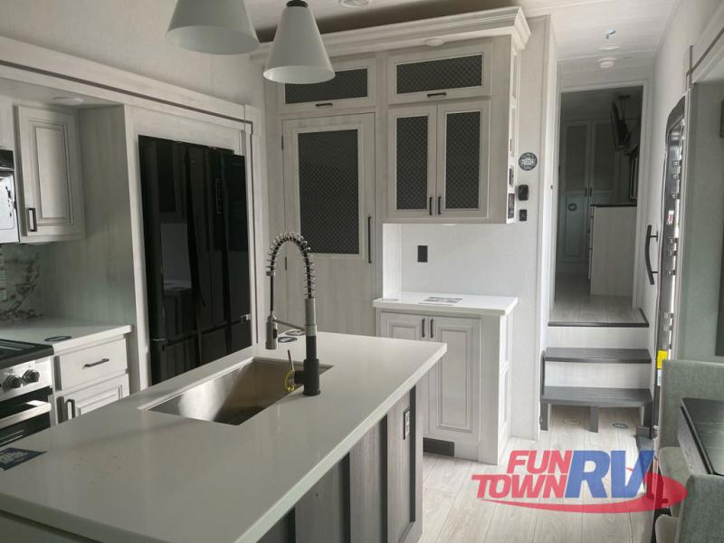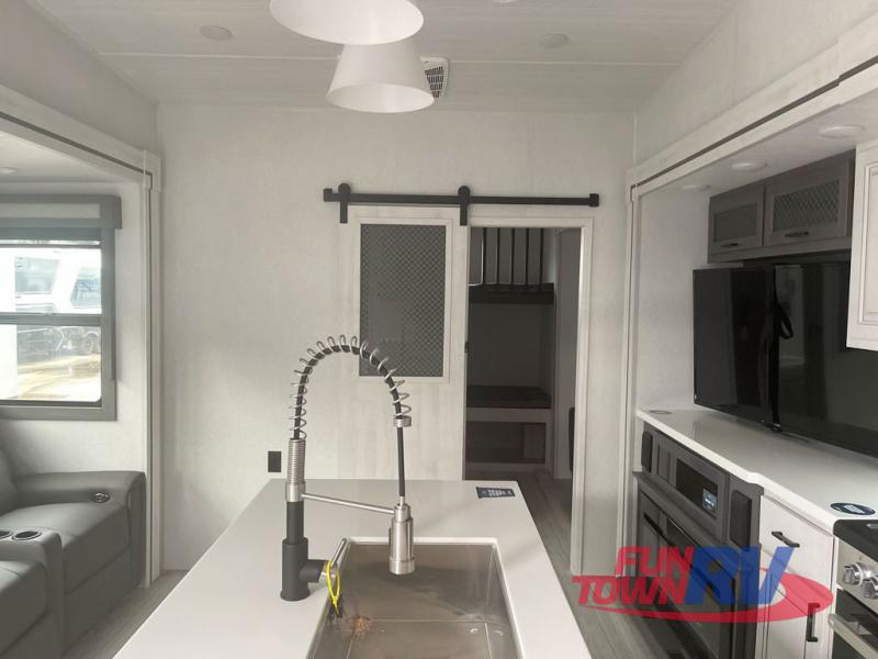 This Ahara fifth wheel is the exact answer to your prayers if you need an RV that provides you with a large private sleeping area for many children or guests! The rear bunkhouse suite has a fold-down bunk, EZ-out sofa, a set of 28" bunks, and a 54" x 72" bunk, so it can easily sleep five. Plus, it also has its very own half bathroom which makes it extremely easy for your kids to use the bathroom at night or get ready in the morning, and the second exterior entry door is also included in this space. You'll have your own bedroom to retreat to at the front, and this space includes a king bed slide with drawers under the bed, sliding dresser top with hidden storage and TV, closet to keep clothes tidy, plus a second closet with washer/dryer prep! The chef of your group will love the spacious kitchen with its kitchen island with countertops extensions, a 24" residential oven with a four burner cooktop, a spacious pantry, plus a 16 cu. ft. 12V French door refrigerator with a double drawer freezer.