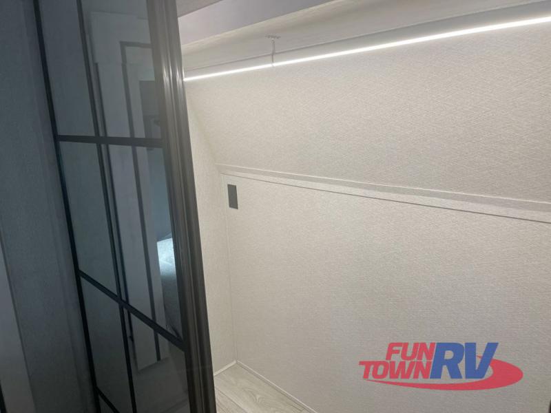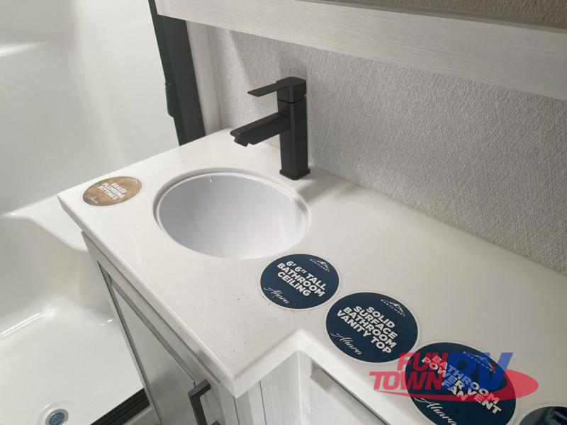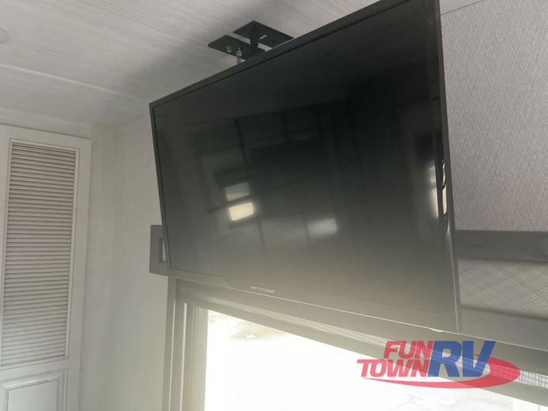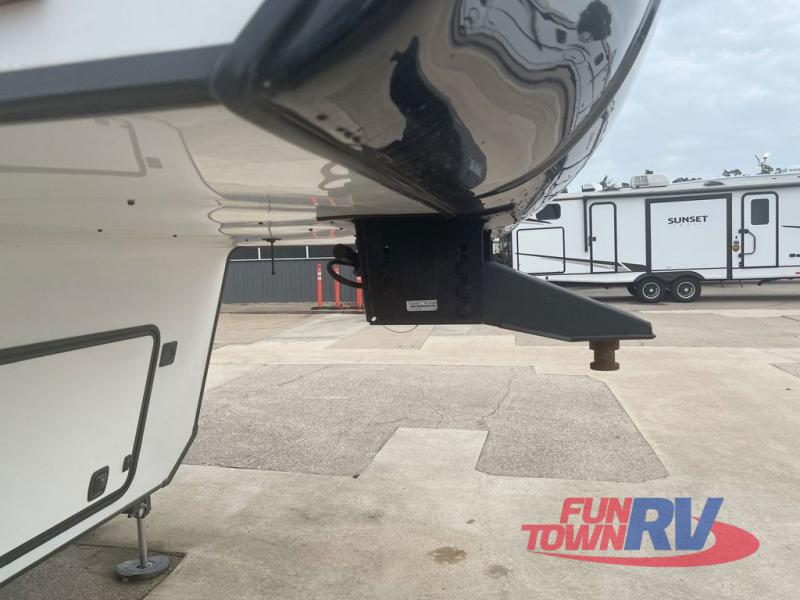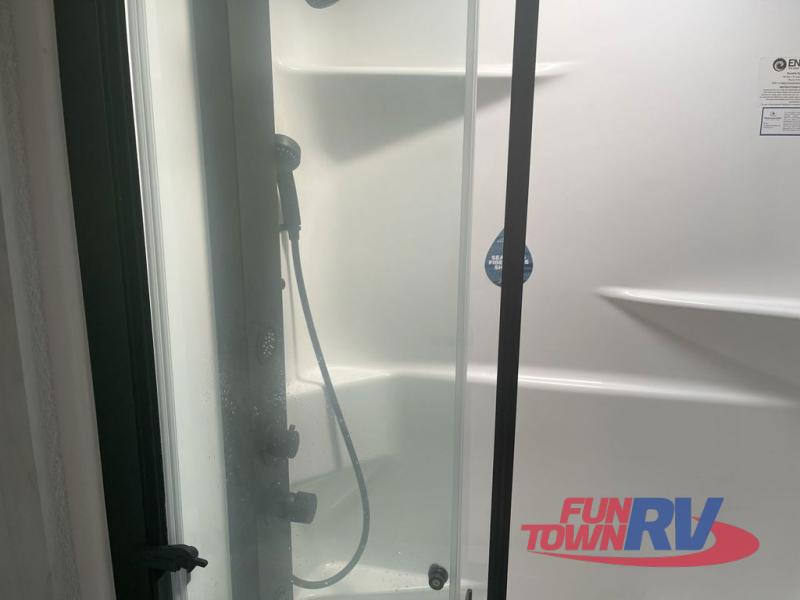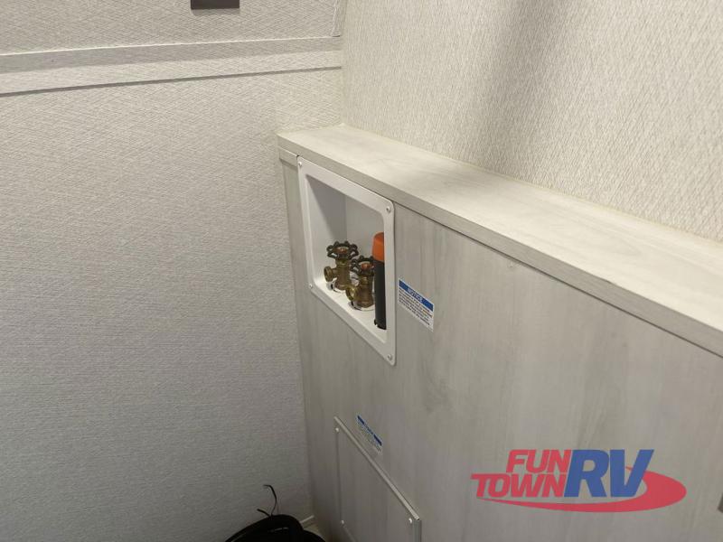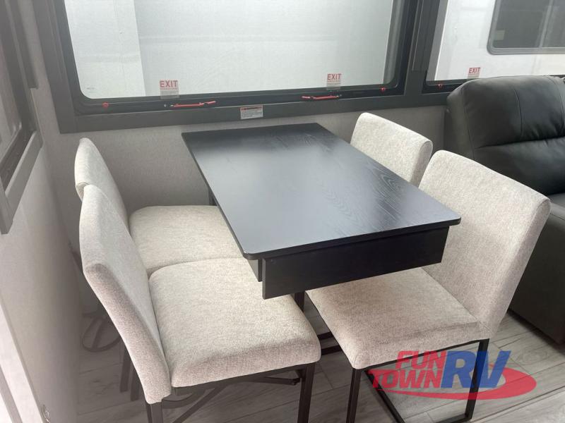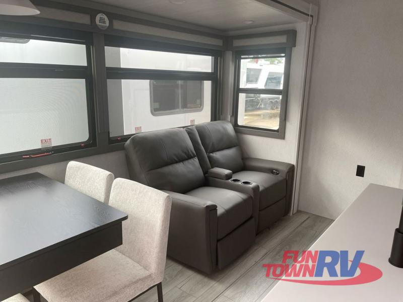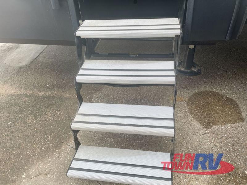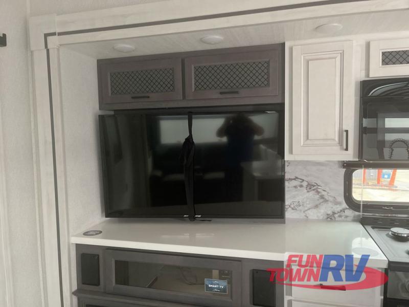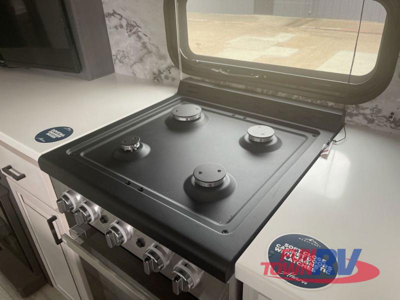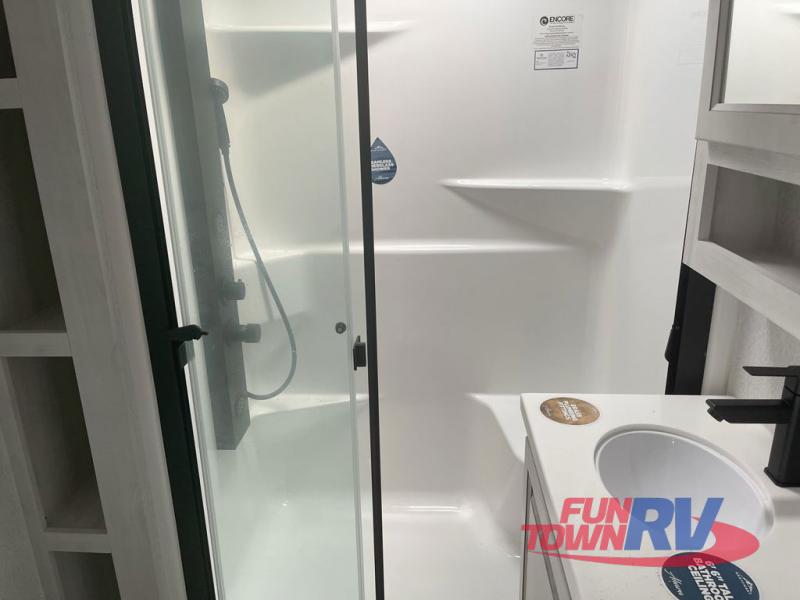 This Ahara fifth wheel is the exact answer to your prayers if you need an RV that provides you with a large private sleeping area for many children or guests! The rear bunkhouse suite has a fold-down bunk, EZ-out sofa, a set of 28" bunks, and a 54" x 72" bunk, so it can easily sleep five. Plus, it also has its very own half bathroom which makes it extremely easy for your kids to use the bathroom at night or get ready in the morning, and the second exterior entry door is also included in this space. You'll have your own bedroom to retreat to at the front, and this space includes a king bed slide with drawers under the bed, sliding dresser top with hidden storage and TV, closet to keep clothes tidy, plus a second closet with washer/dryer prep! The chef of your group will love the spacious kitchen with its kitchen island with countertops extensions, a 24" residential oven with a four burner cooktop, a spacious pantry, plus a 16 cu. ft. 12V French door refrigerator with a double drawer freezer.