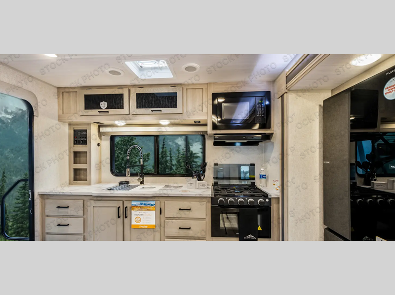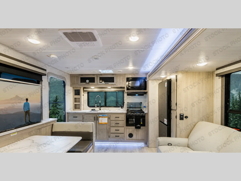 You can comfortably sleep four in this travel trailer thanks to the Tri- Fold Sofa and a king bed. There is also additional space as in the overhead cabinets, dual wardrobes and night stands. The combined living area and kitchen includes a Tri-fold Sofa with optional theater seats, a booth dinette with storage under it, plus a 50" TV. Great accessibility thanks to the two entry doors. In the exterior, there is also a 19' awning and a pass-trough storage. Finally after a long day take a comfortable and relaxing shower in our walk trough bathroom.