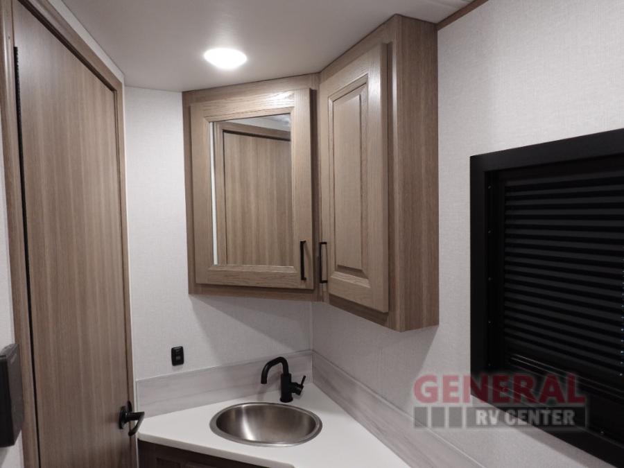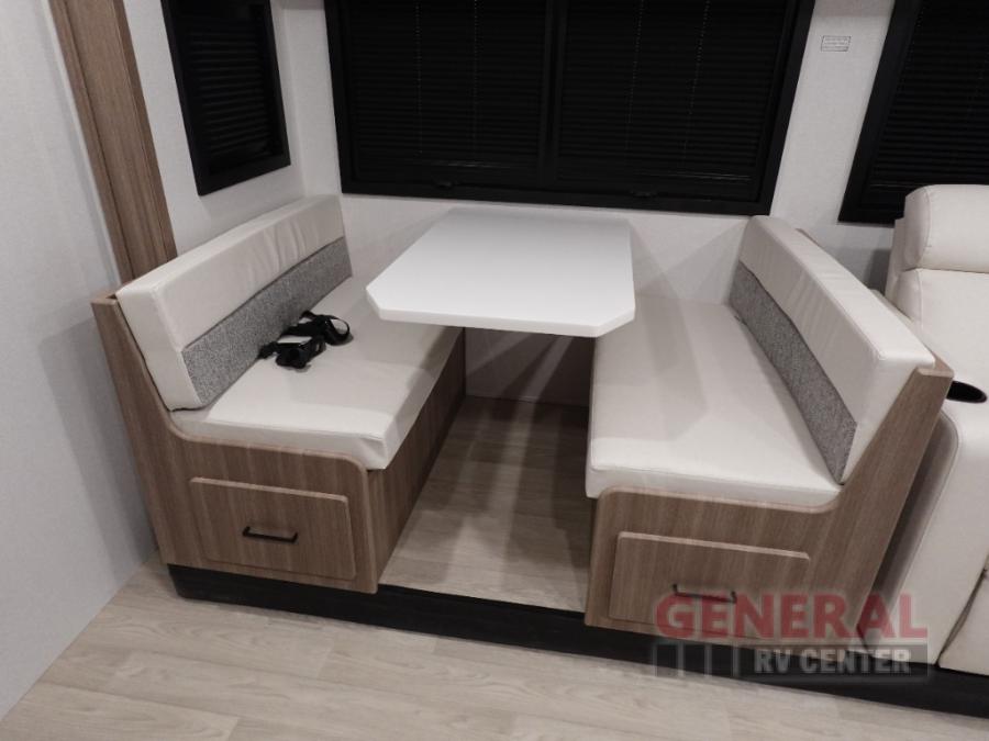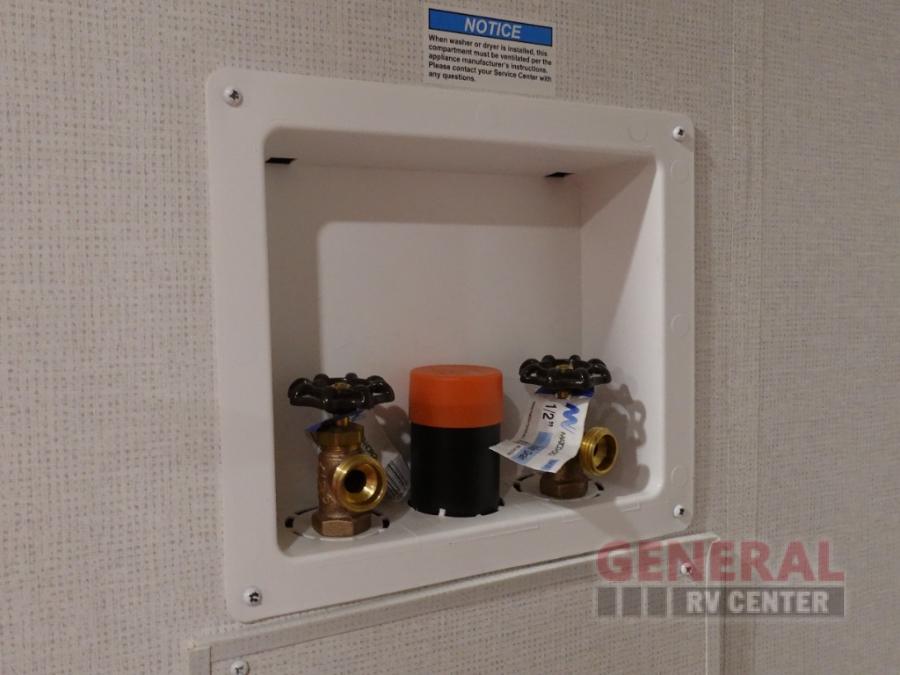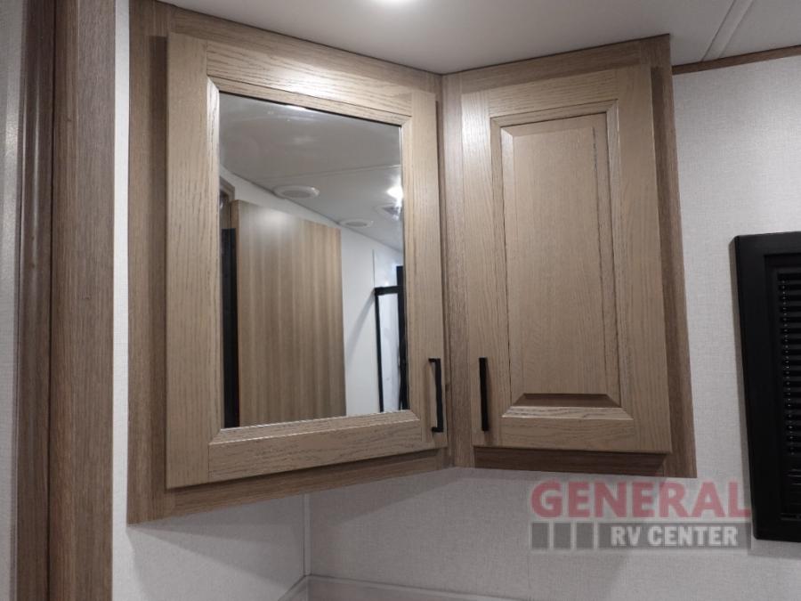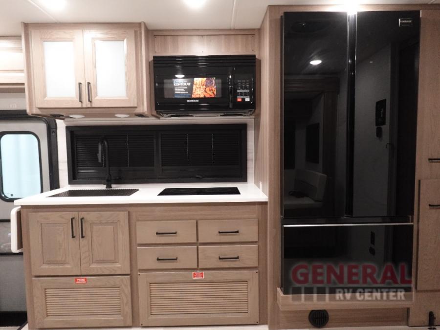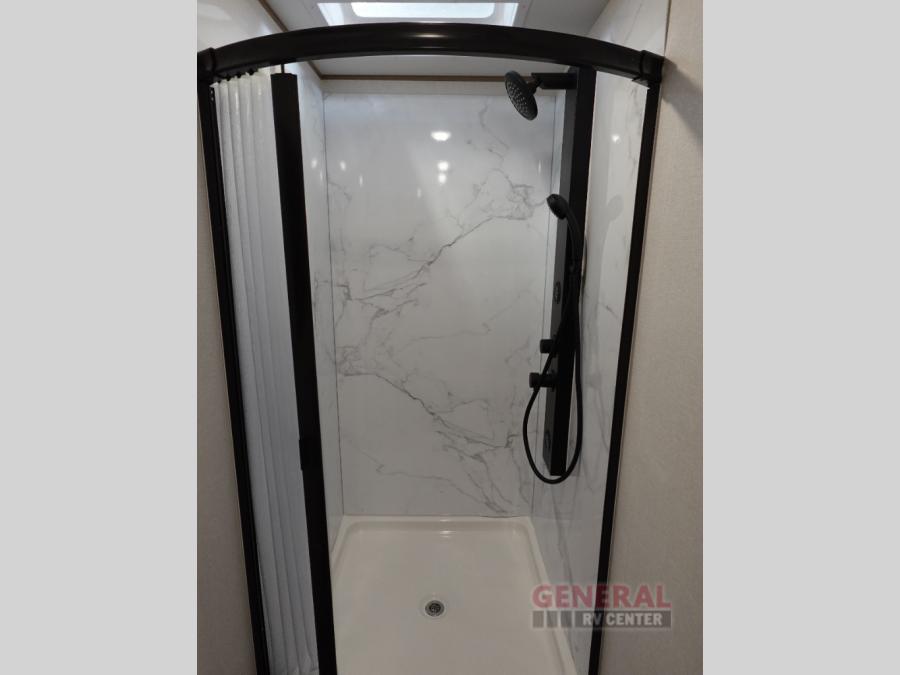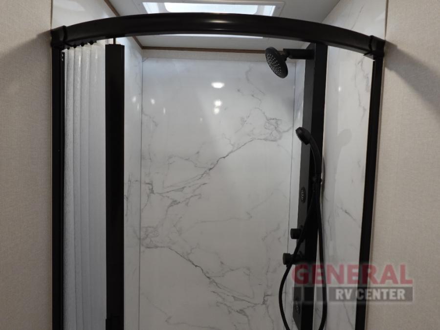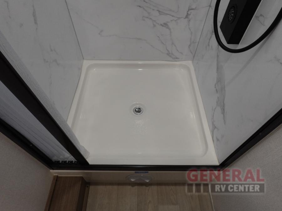 Traveling in this coach is sure to bring great memories! Once you arrive at your destination, you can make lunch in the full kitchen, and there is a large 16 cu. ft. 12V refrigerator and pantry for food storage. The booth dinette and power theater seat will provide a place to relax, and the 40" TV will keep you entertained on rainy days. The rear corner bedroom features a queen bed slide out, an overhead cabinet, wardrobe, plus washer and dryer prep if you choose to add those appliances. And the full bath is found in the opposite rear corner where you'll find a spacious shower, toilet, and nice-sized vanity to easily get ready each morning.
