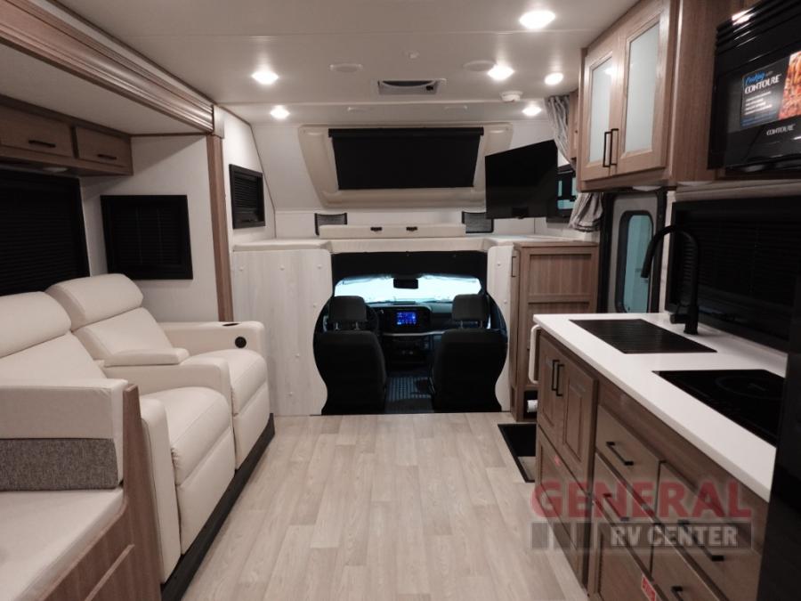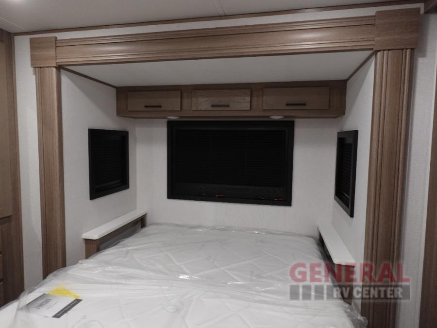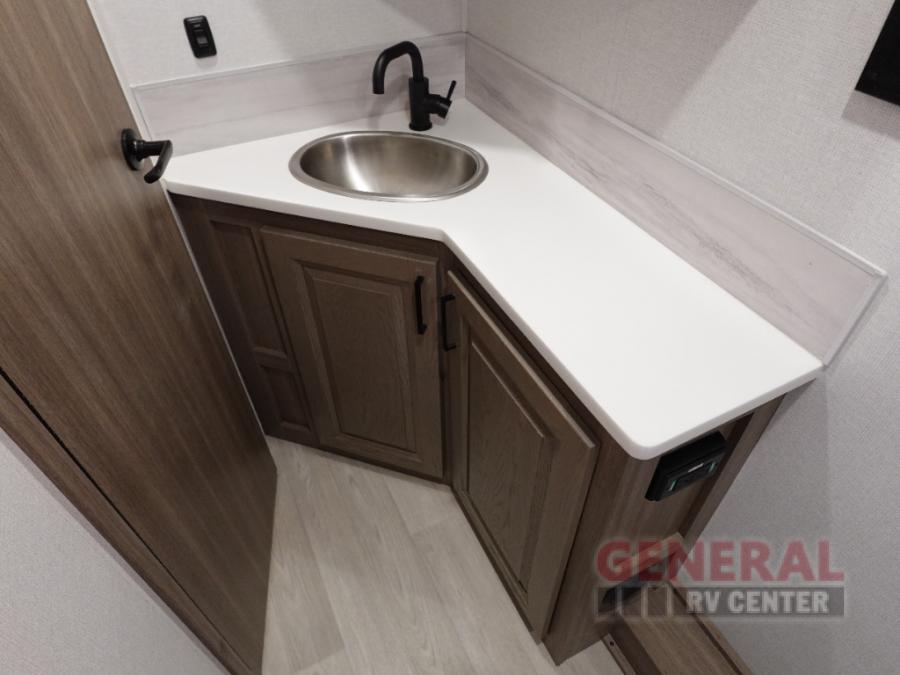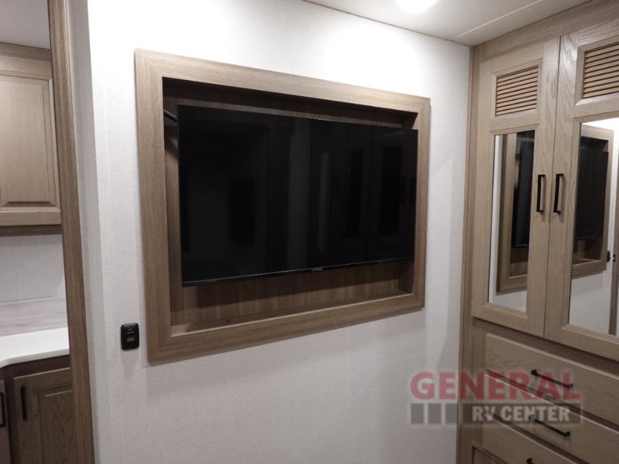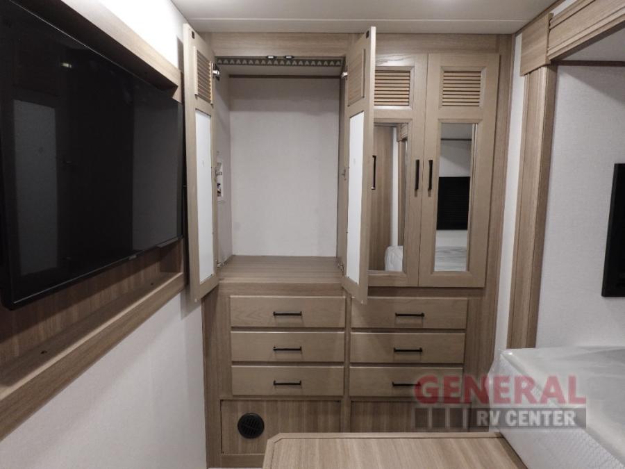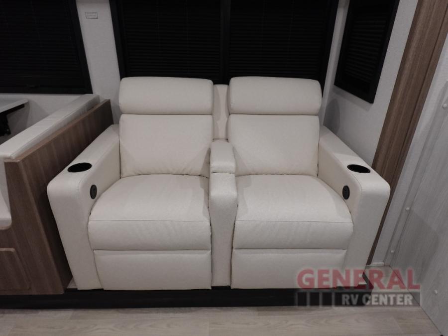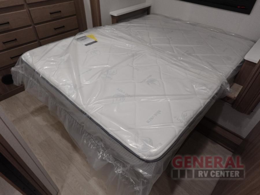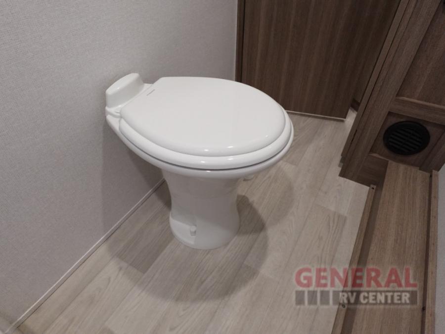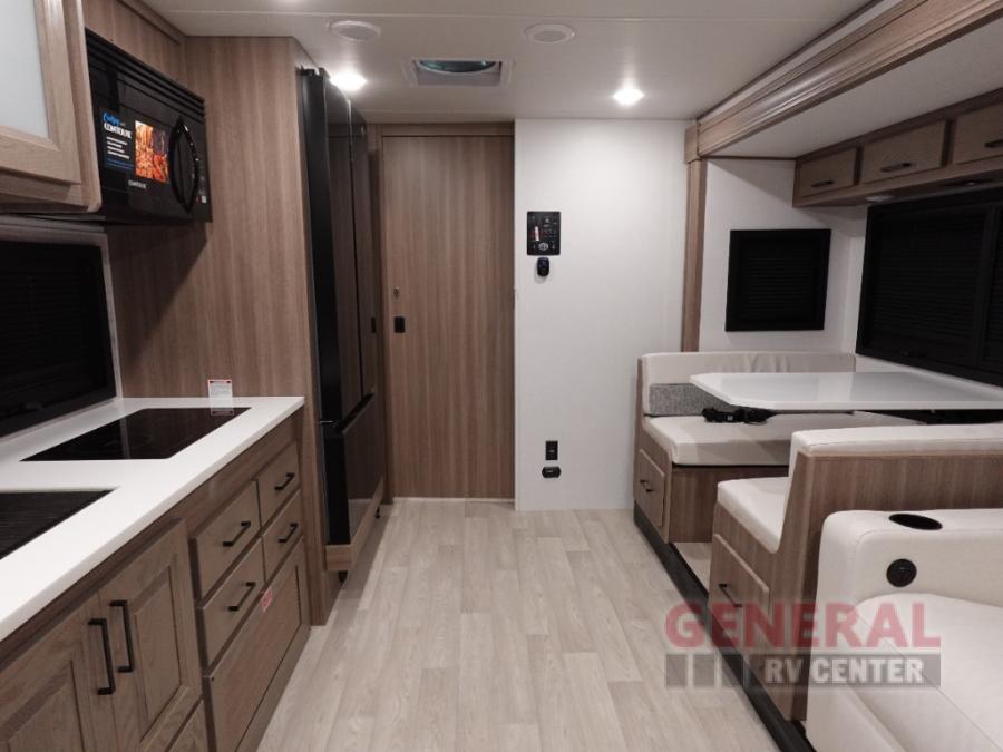 Traveling in this coach is sure to bring great memories! Once you arrive at your destination, you can make lunch in the full kitchen, and there is a large 16 cu. ft. 12V refrigerator and pantry for food storage. The booth dinette and power theater seat will provide a place to relax, and the 40" TV will keep you entertained on rainy days. The rear corner bedroom features a queen bed slide out, an overhead cabinet, wardrobe, plus washer and dryer prep if you choose to add those appliances. And the full bath is found in the opposite rear corner where you'll find a spacious shower, toilet, and nice-sized vanity to easily get ready each morning.