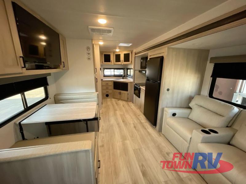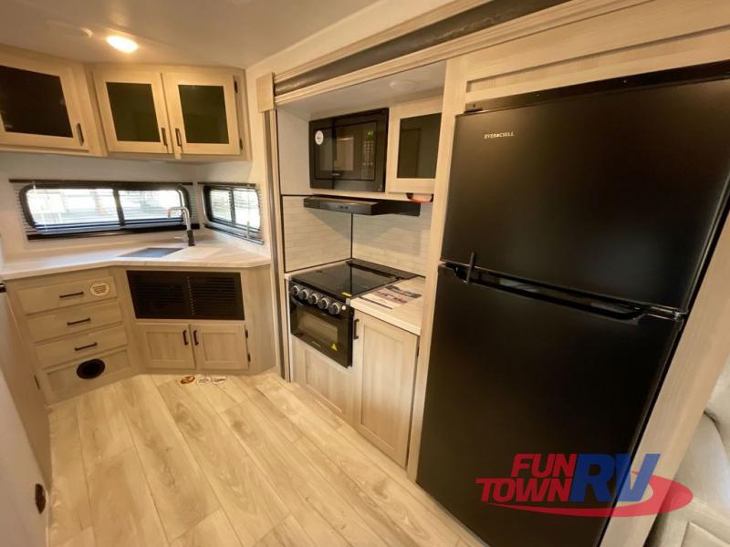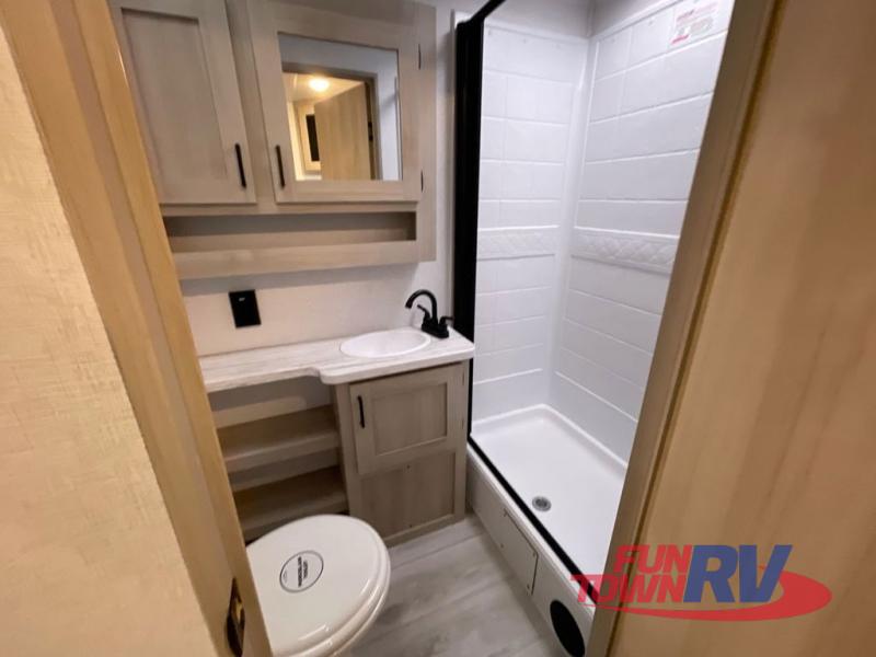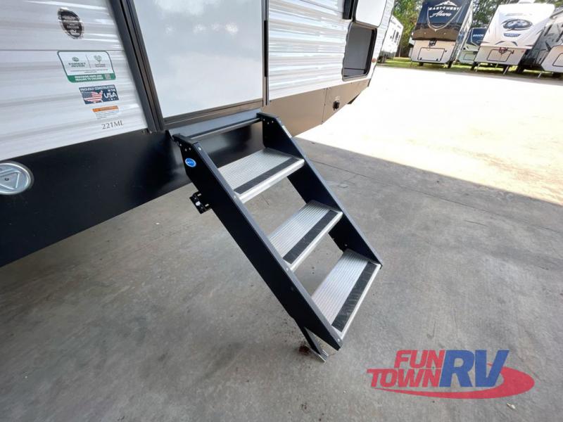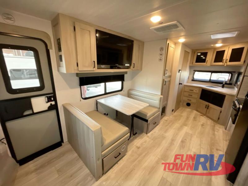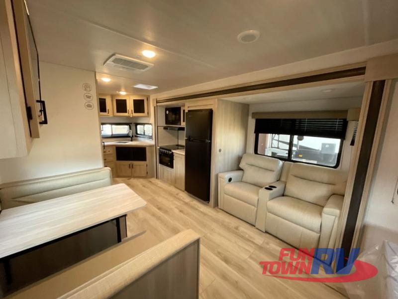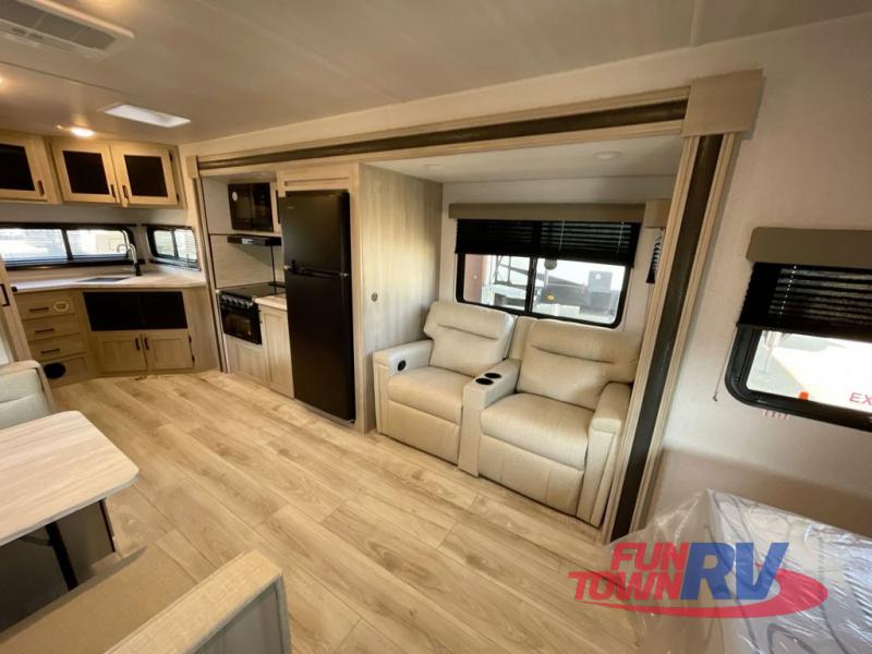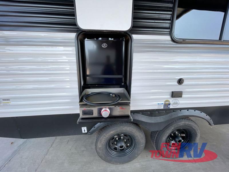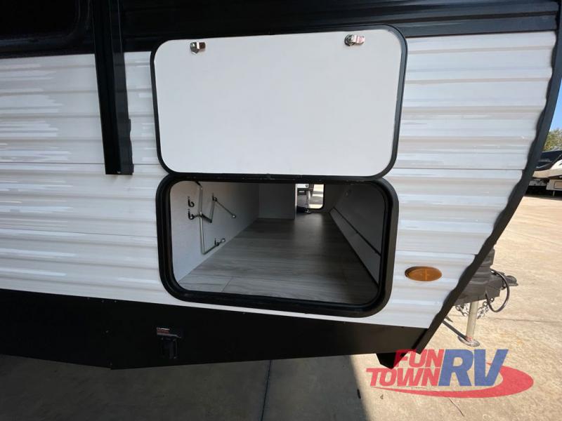 Head to the lake in this travel trailer with a large slide out for more space and comfort! Once you arrive, you can put out the 18' power awning, unload the pass-through storage, and make lunch on the outdoor kitchen with a pull-out griddle and refrigerator. The booth dinette inside can be used as dining space, and there is storage underneath here for added convenience. A jiffy sofa within the slide can be switched out for an optional theater seat if you don't need the extra sleeping space. You will also find a full interior kitchen in the rear corner, and the full bath in the other rear corner is sure to come in handy. When you're ready for some shut-eye, the king bed in the front bedroom will feel just like home. There are also dual wardrobes and nightstands to keep your things tidy!
