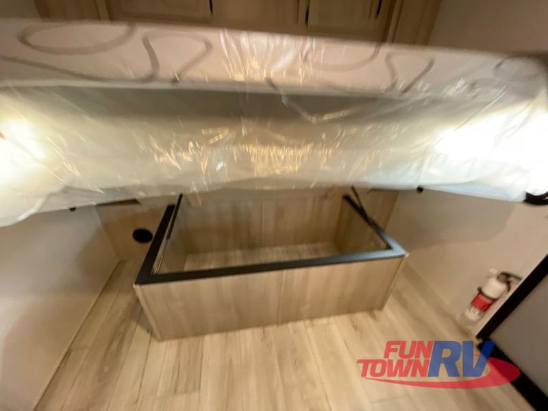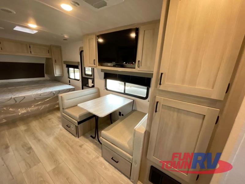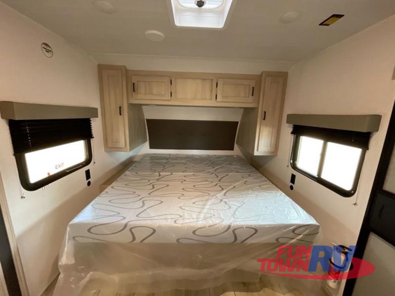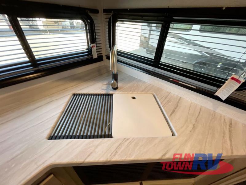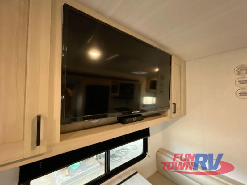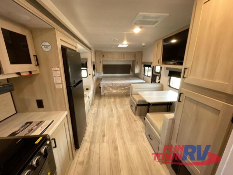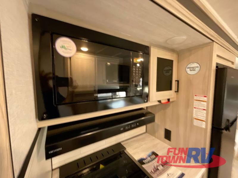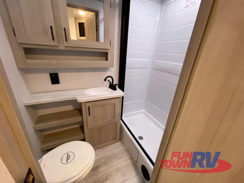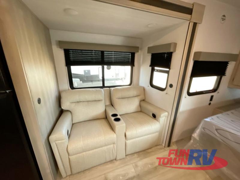 Head to the lake in this travel trailer with a large slide out for more space and comfort! Once you arrive, you can put out the 18' power awning, unload the pass-through storage, and make lunch on the outdoor kitchen with a pull-out griddle and refrigerator. The booth dinette inside can be used as dining space, and there is storage underneath here for added convenience. A jiffy sofa within the slide can be switched out for an optional theater seat if you don't need the extra sleeping space. You will also find a full interior kitchen in the rear corner, and the full bath in the other rear corner is sure to come in handy. When you're ready for some shut-eye, the king bed in the front bedroom will feel just like home. There are also dual wardrobes and nightstands to keep your things tidy!
