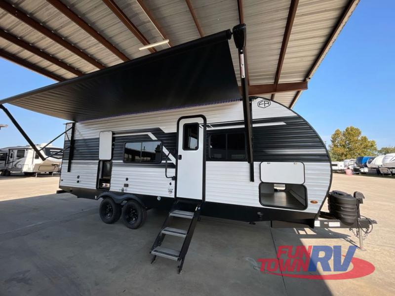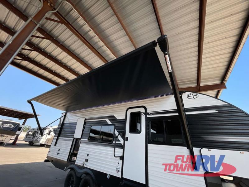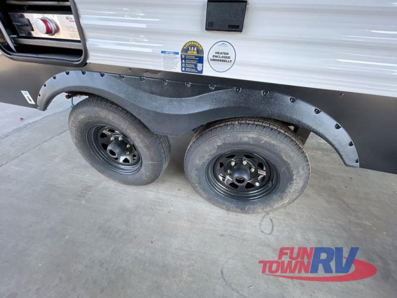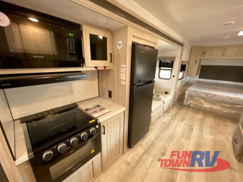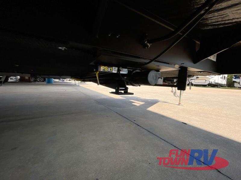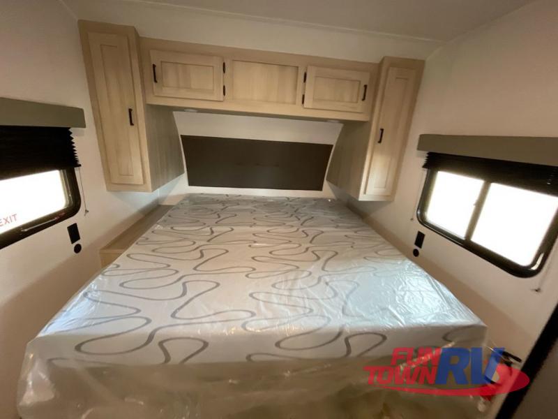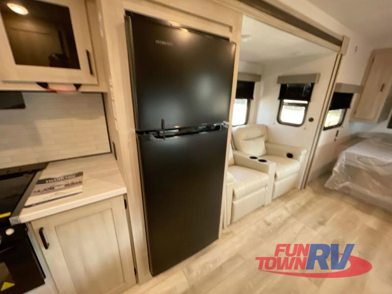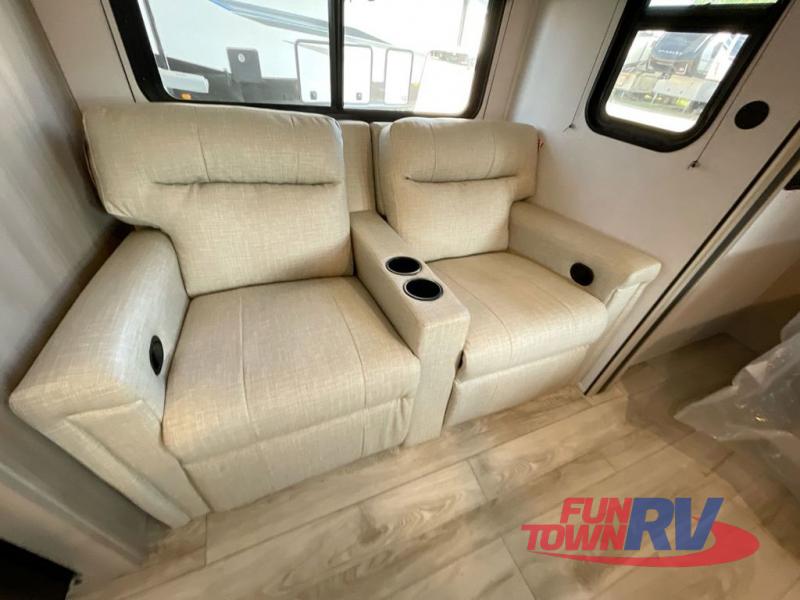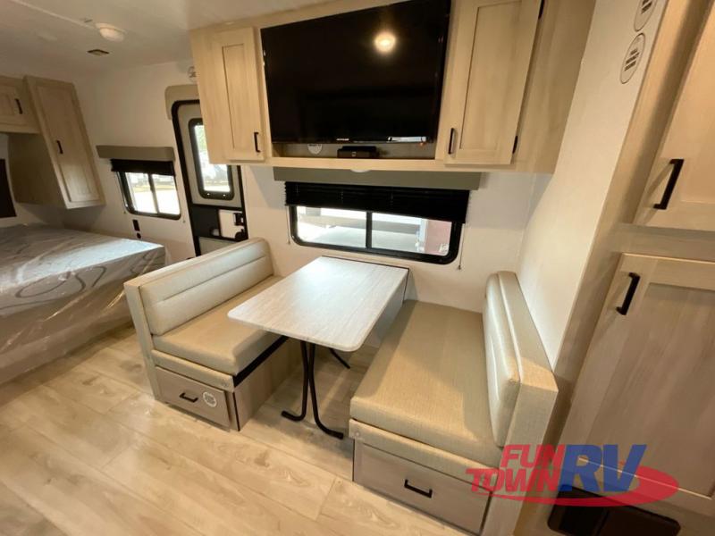 Head to the lake in this travel trailer with a large slide out for more space and comfort! Once you arrive, you can put out the 18' power awning, unload the pass-through storage, and make lunch on the outdoor kitchen with a pull-out griddle and refrigerator. The booth dinette inside can be used as dining space, and there is storage underneath here for added convenience. A jiffy sofa within the slide can be switched out for an optional theater seat if you don't need the extra sleeping space. You will also find a full interior kitchen in the rear corner, and the full bath in the other rear corner is sure to come in handy. When you're ready for some shut-eye, the king bed in the front bedroom will feel just like home. There are also dual wardrobes and nightstands to keep your things tidy!