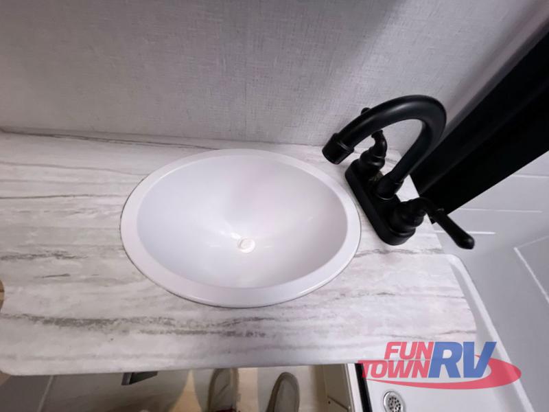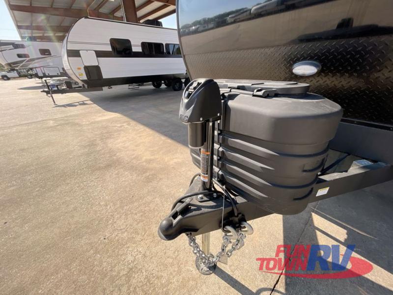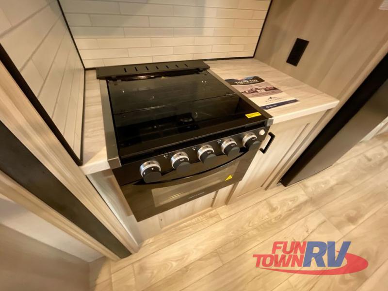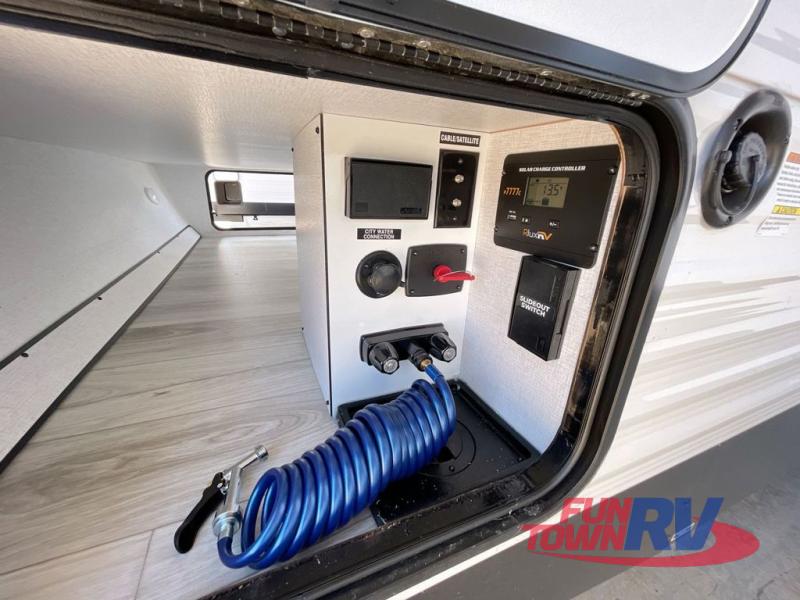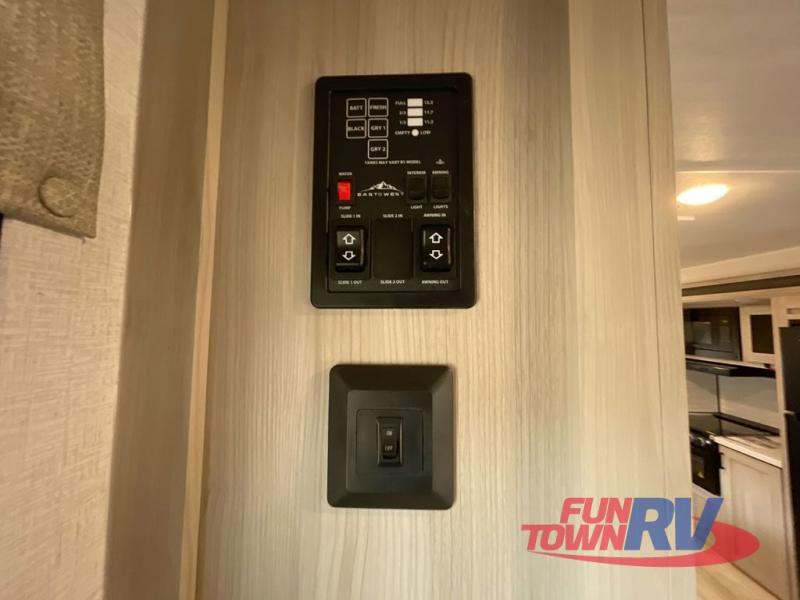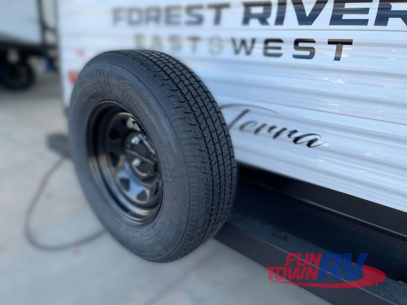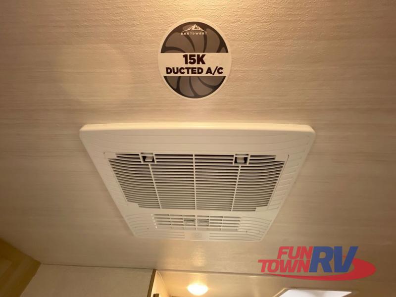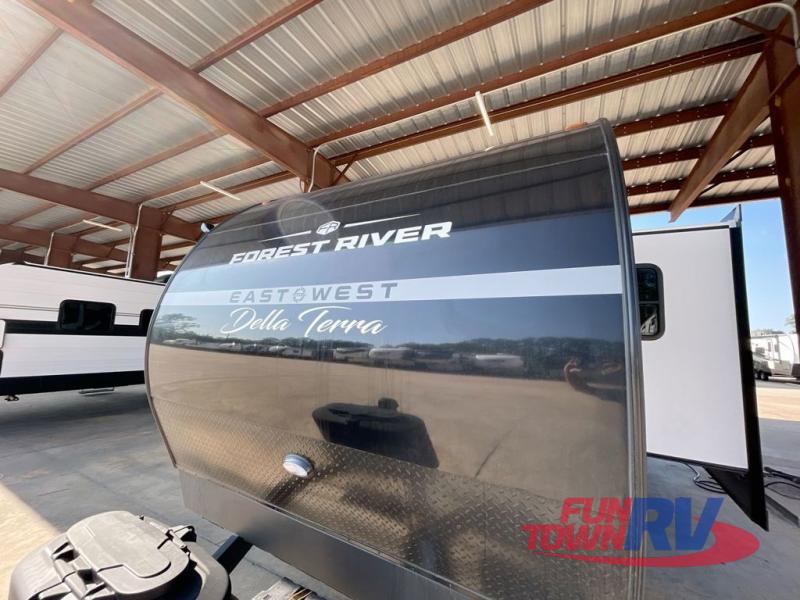 Each Della Terra travel trailer by EAST TO WEST is constructed with an enclosed and heated underbelly and enclosed holding tanks so you can camp all year long. There is also a power tongue jack with an LED light for easy set up and a power awning with LED lights you can rest under after you've unpacked. The Explore Comfort Package comes seamless pressed countertops, kitchen backsplash, window valance package with black night shades, and many more comforts. You will also appreciate the Adventure Outdoor Package with backup camera prep and solar prep, a tankless water heater, an RV grill quick disconnect, and a universal docking station with battery disconnect.