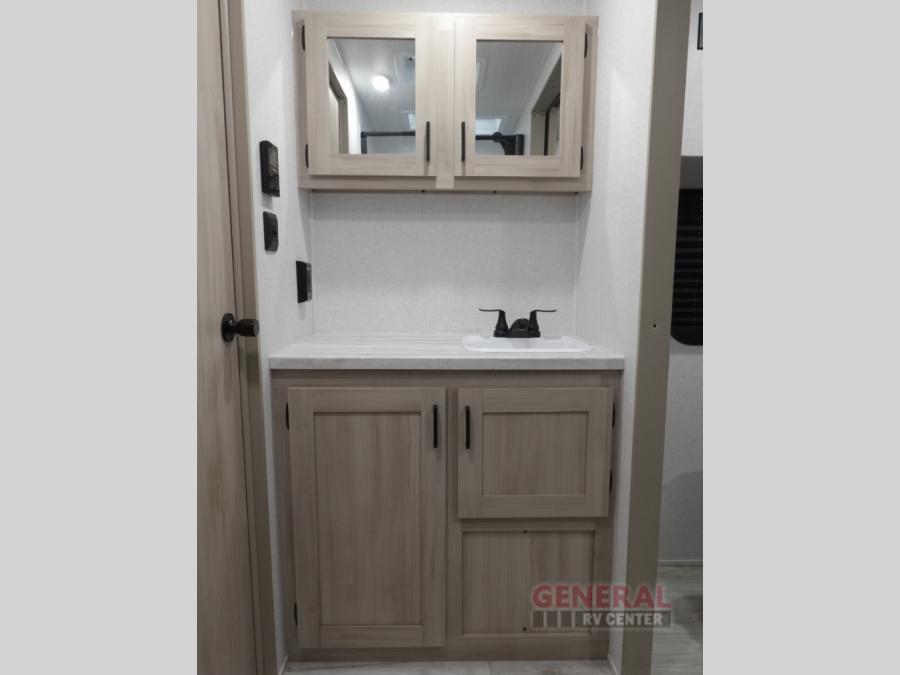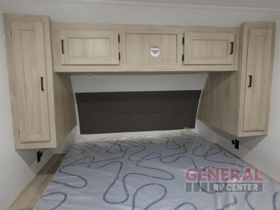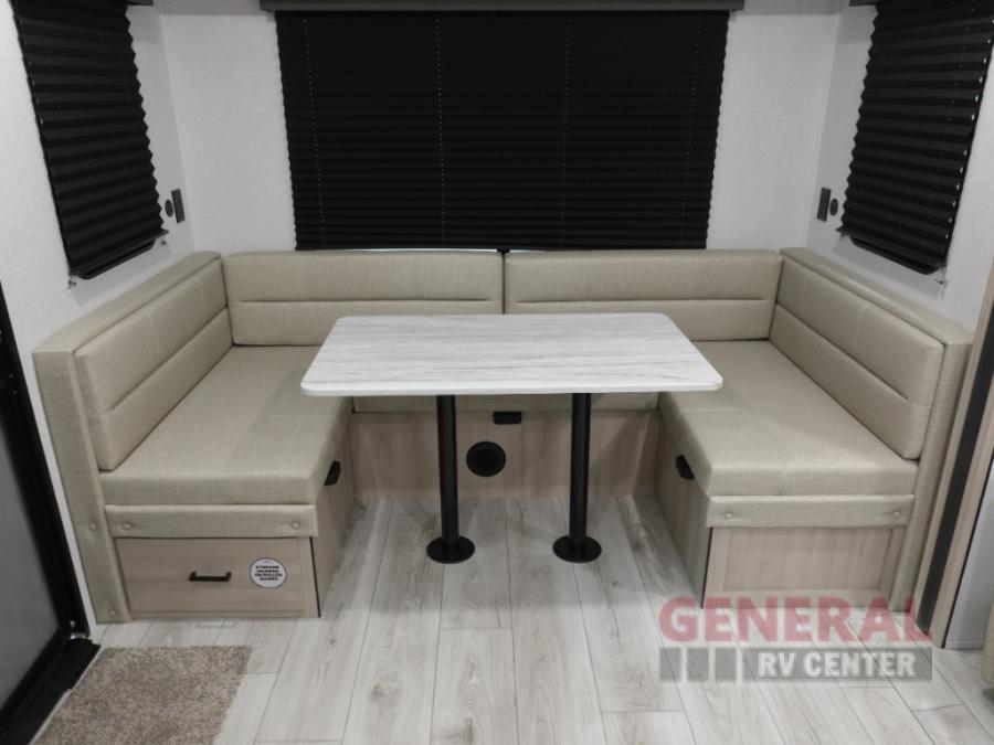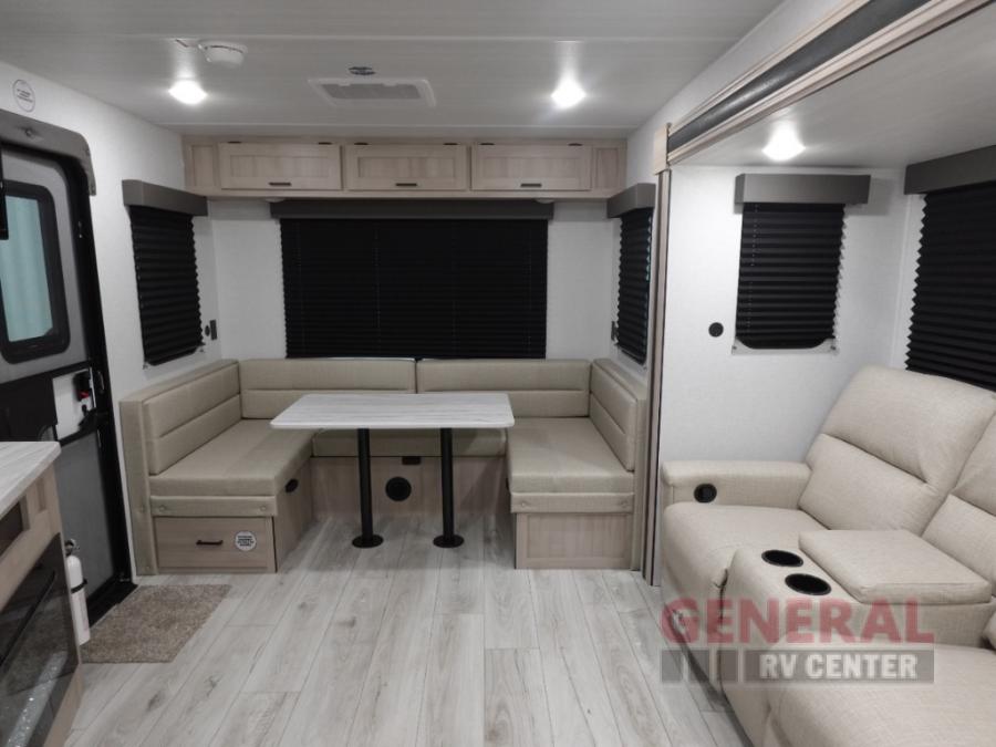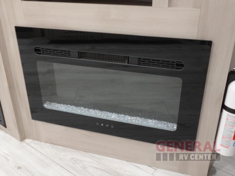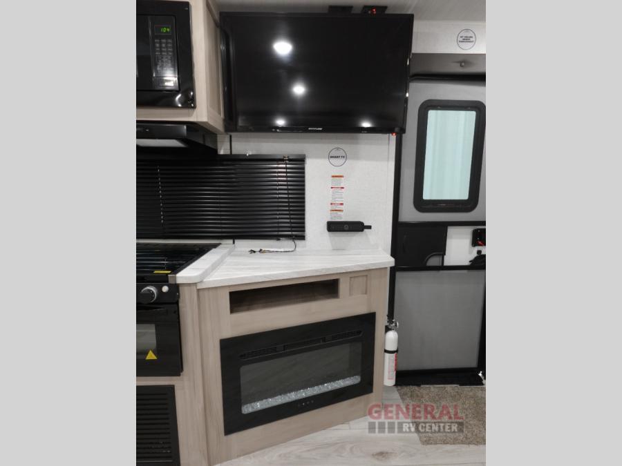 When you are wanting a little more interior space in your next travel trailer, take a look inside! This large slide out widens the main living space so you can easily make meals using full amenities without having to move for someone walking from the front bedroom and walk-through bath to the U-shaped dinette in the back. For sleeping, there is a king-size bed with storage on both sides at the very front of this unit giving you privacy from the rest, and even a private second entry/exit door from within the bedroom. You will find storage beneath the bed for larger items or extra blankets, plus a space saving sliding door. The U-shaped dinette and jackknife sofa offer comfortable seating as well as extra sleeping space for overnight guests, and the fireplace is just a nice feature to enjoy. On the outside, an 18' awning provides a large outdoor living area protected from the elements, and the oversized pass-through will house all of your exterior gear like lawn chairs, outdoor games and rugs, plus so much more!