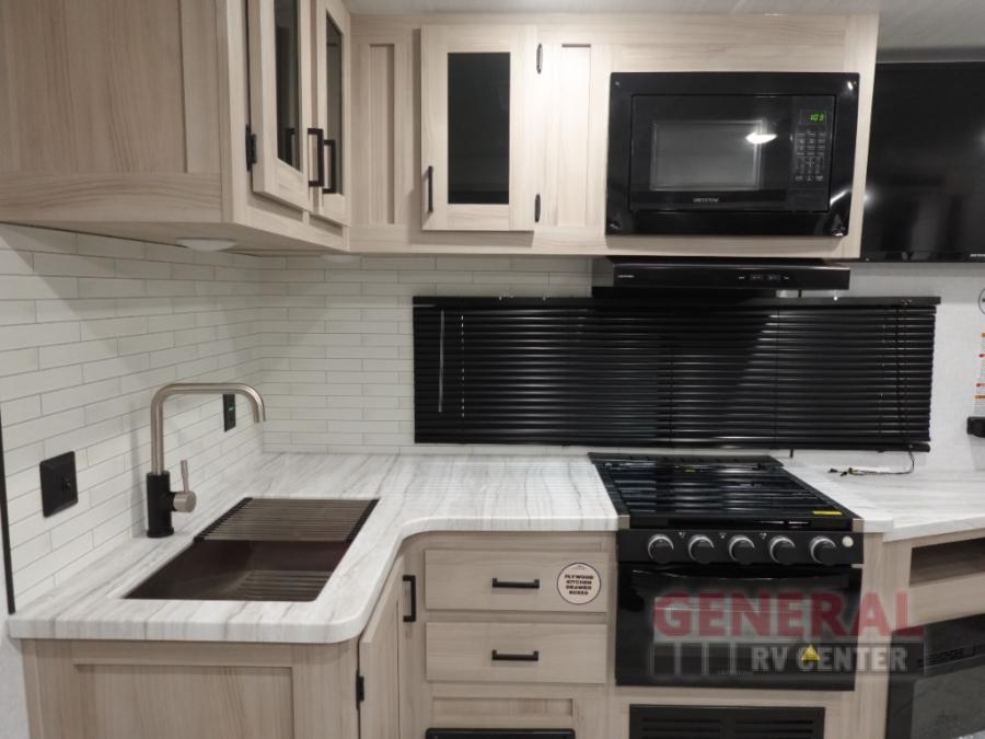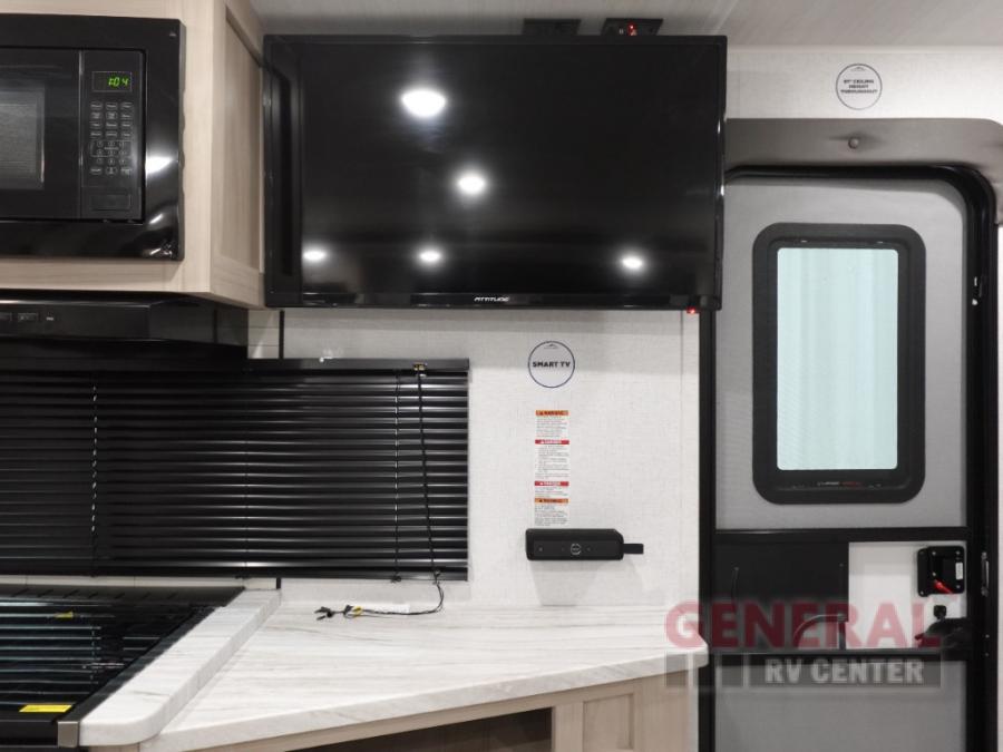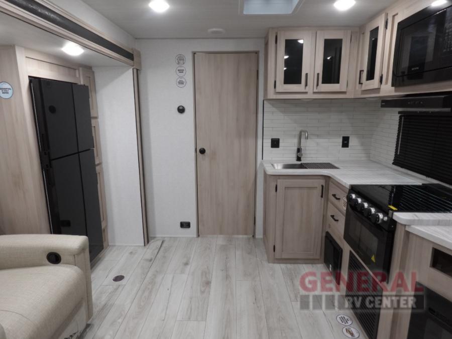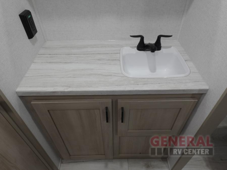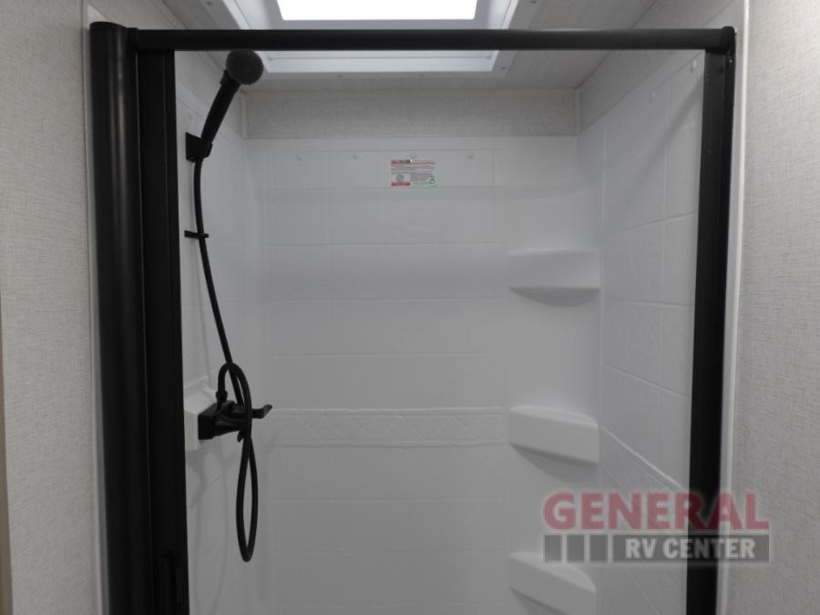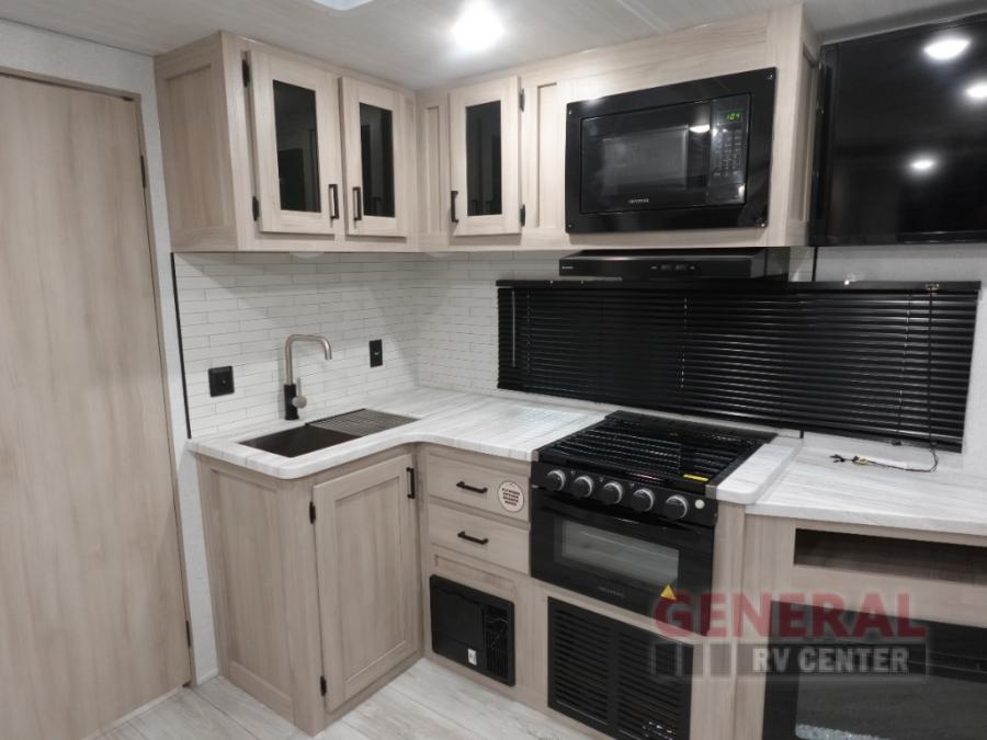When you are wanting a little more interior space in your next travel trailer, take a look inside! This large slide out widens the main living space so you can easily make meals using full amenities without having to move for someone walking from the front bedroom and walk-through bath to the U-shaped dinette in the back. For sleeping, there is a king-size bed with storage on both sides at the very front of this unit giving you privacy from the rest, and even a private second entry/exit door from within the bedroom. You will find storage beneath the bed for larger items or extra blankets, plus a space saving sliding door. The U-shaped dinette and jackknife sofa offer comfortable seating as well as extra sleeping space for overnight guests, and the fireplace is just a nice feature to enjoy. On the outside, an 18' awning provides a large outdoor living area protected from the elements, and the oversized pass-through will house all of your exterior gear like lawn chairs, outdoor games and rugs, plus so much more!
