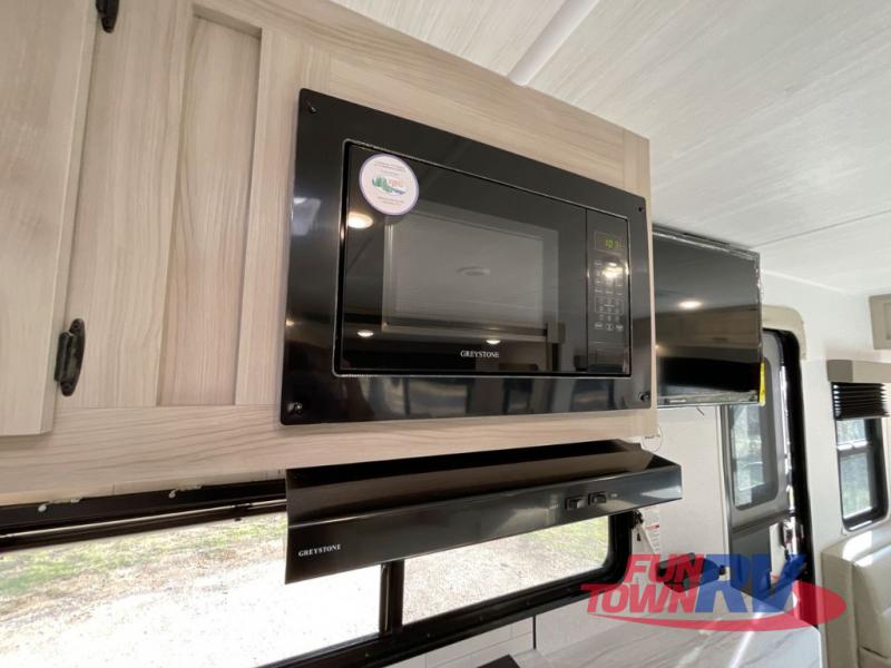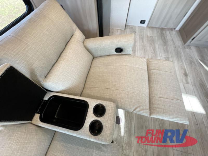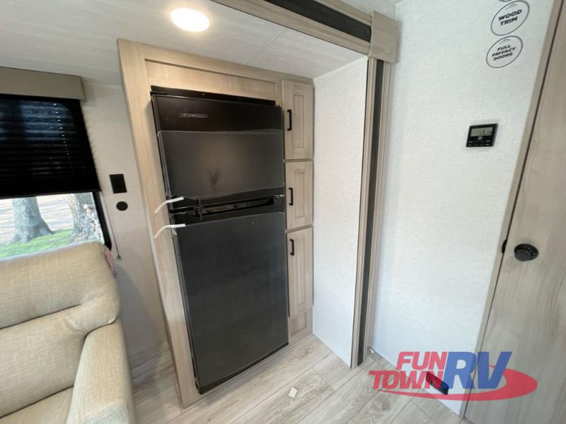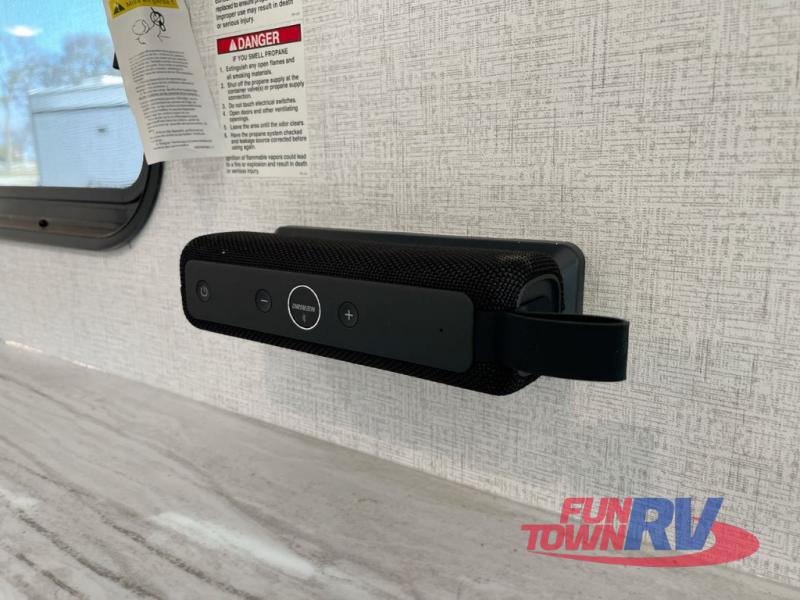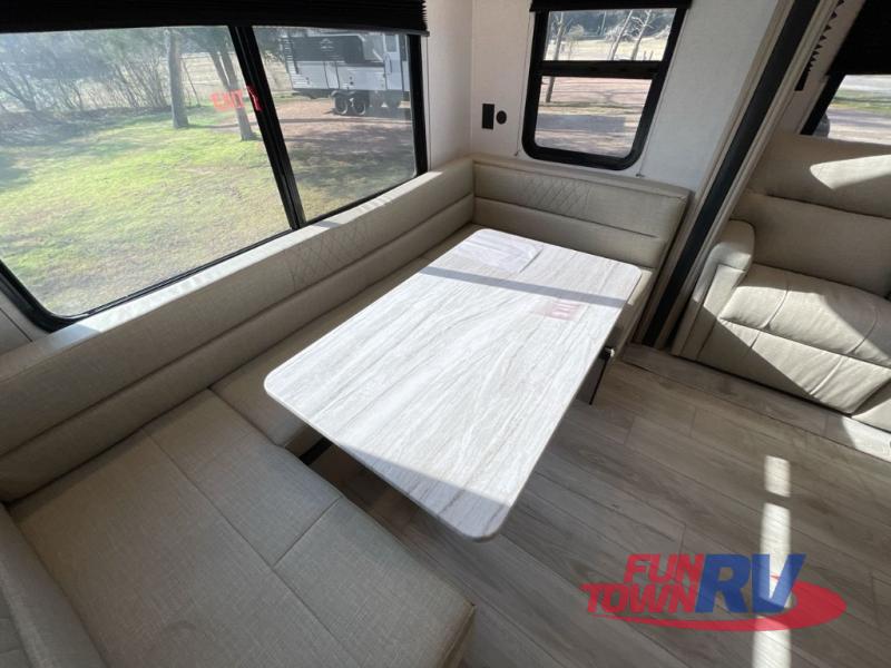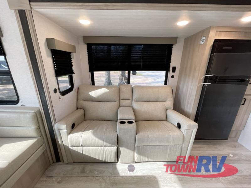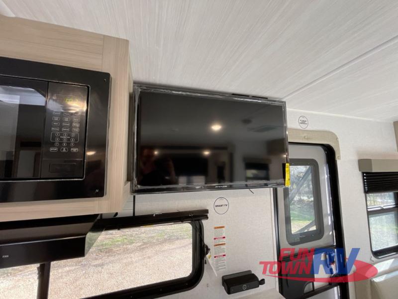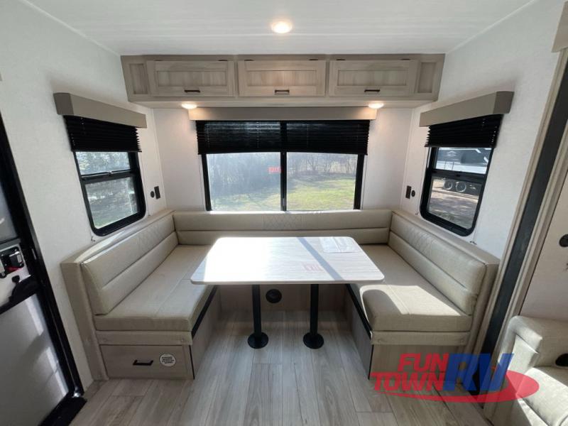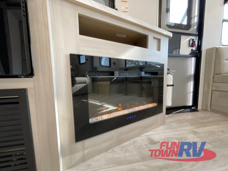 When you are wanting a little more interior space in your next travel trailer, take a look inside! This large slide out widens the main living space so you can easily make meals using full amenities without having to move for someone walking from the front bedroom and walk-through bath to the u-shaped dinette in the back. For sleeping, there is a king-size bed with storage on both sides at the very front of this unit giving you privacy from the rest, and even a private second entry/exit door from within the bedroom. You will find storage beneath the bed for larger items or extra blankets, plus a space saving sliding door. The U-shaped dinette and jack knife sofa offer comfortable seating as well as extra sleeping space for overnight guests, and the fireplace is just a nice feature to enjoy. On the outside, an 18' awning provides a large outdoor living area protected from the elements, and the oversized pass-through will house all of your exterior gear like lawn chairs, outdoor games and rugs, plus so much more!
