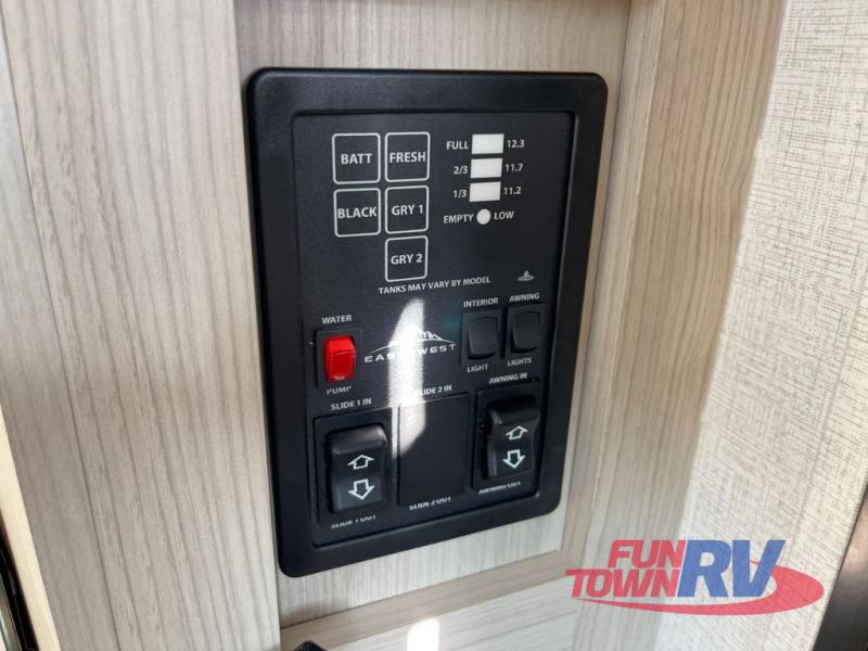 Each Della Terra travel trailer by EAST TO WEST is constructed with an enclosed and heated underbelly and enclosed holding tanks so you can camp all year long. There is also a power tongue jack with an LED light for easy set up and a power awning with LED lights you can rest under after you've unpacked. The Explore Comfort Package comes seamless pressed countertops, kitchen backsplash, window valance package with black night shades, and many more comforts. You will also appreciate the Adventure Outdoor Package with backup camera prep and solar prep, a tankless water heater, an RV grill quick disconnect, and a universal docking station with battery disconnect.
