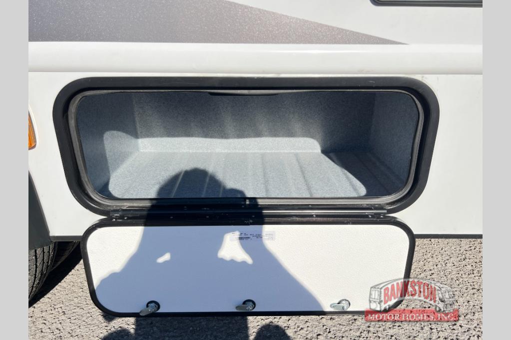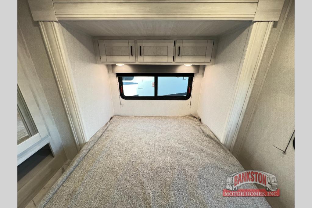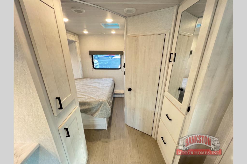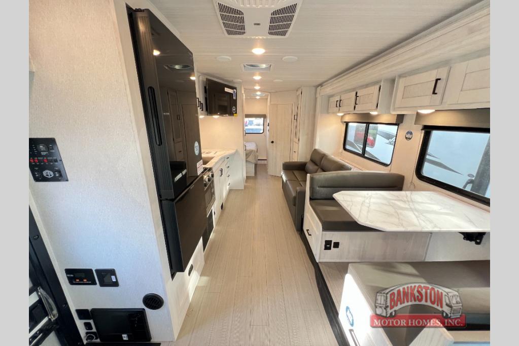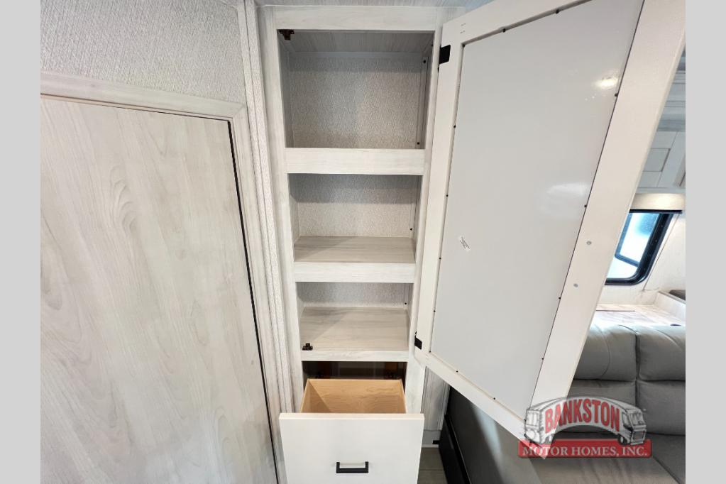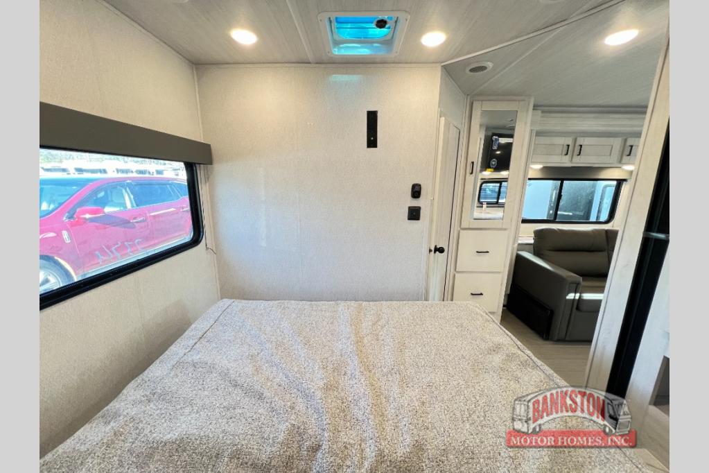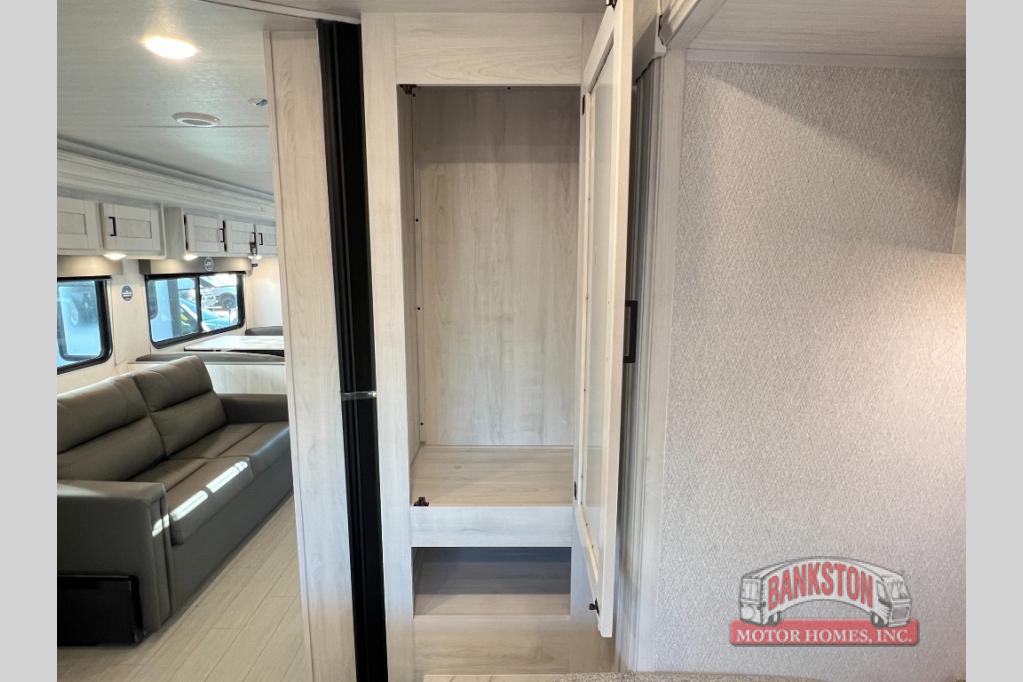 You can explore and discover so many new destinations with this Entrada Class C gas motorhome! The first thing that you'll notice about this coach is that it has extra interior living space because of the two slides. One of those slides holds the queen-size bed back in the private bedroom, and the bedroom is sectioned off from the rest of the coach with an accordion door. The full bathroom is right next to the bedroom so that you can quickly and effortlessly hop in the shower each morning. Outside of the bathroom, you'll find a linen closet which can hold your towels or toiletries, and the kitchen pantry can hold your snacks. This coach even has an TV for inside entertainment, so you can sit back on the sofa or booth dinette and watch with pleasure.