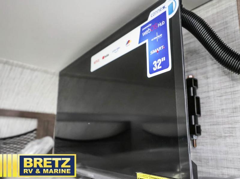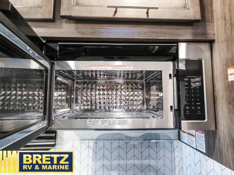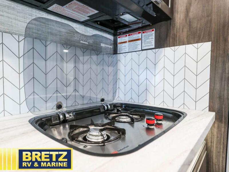 Pack your bags and head to your favorite camping destination in this cozy coach! You can sleep four to six between the RV queen bed, U-shaped dinette, and overhead bunk with a 750 lb. capacity. And if you don't need the extra sleeping space, just choose the entertainment center with overhead storage option in place of the bunk, and the theater seating option in place of the dinette! You can prepare meals each day on the two burner drop-in cooktop or in the convection microwave, and there is a 10 cu. ft. 12V refrigerator for perishables. A full bath, complete with a foot flush toilet, powered roof vent, and shower skylight will let you stay clean throughout each trip. You will also find plenty of storage space, including a wardrobe by the bed, a pantry, plus overhead cabinets!