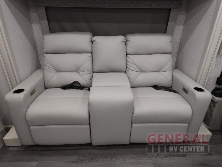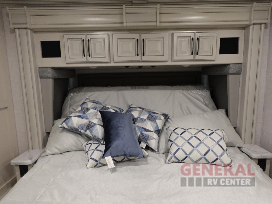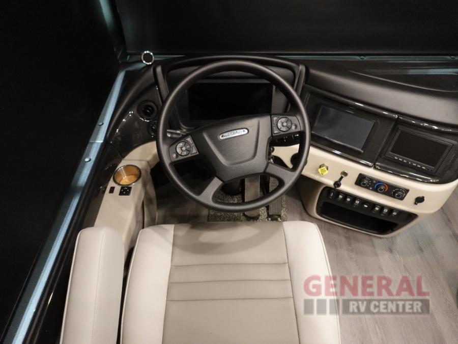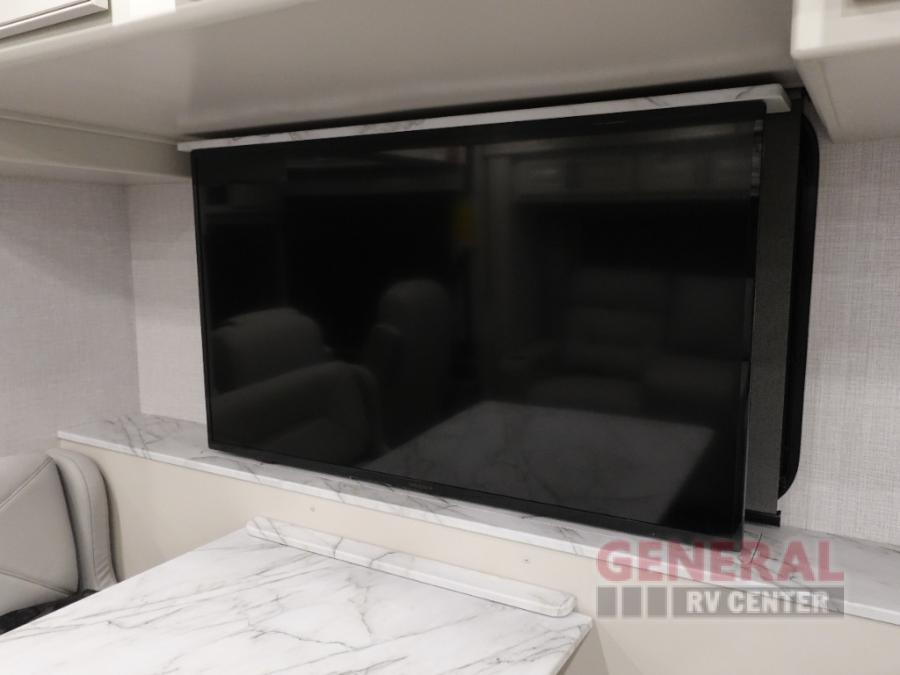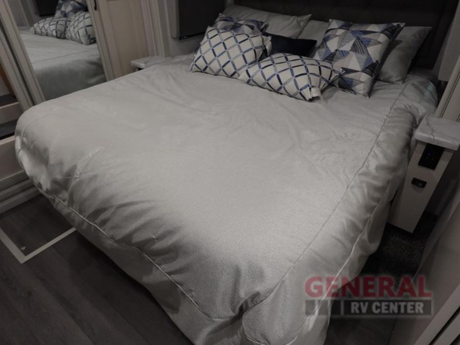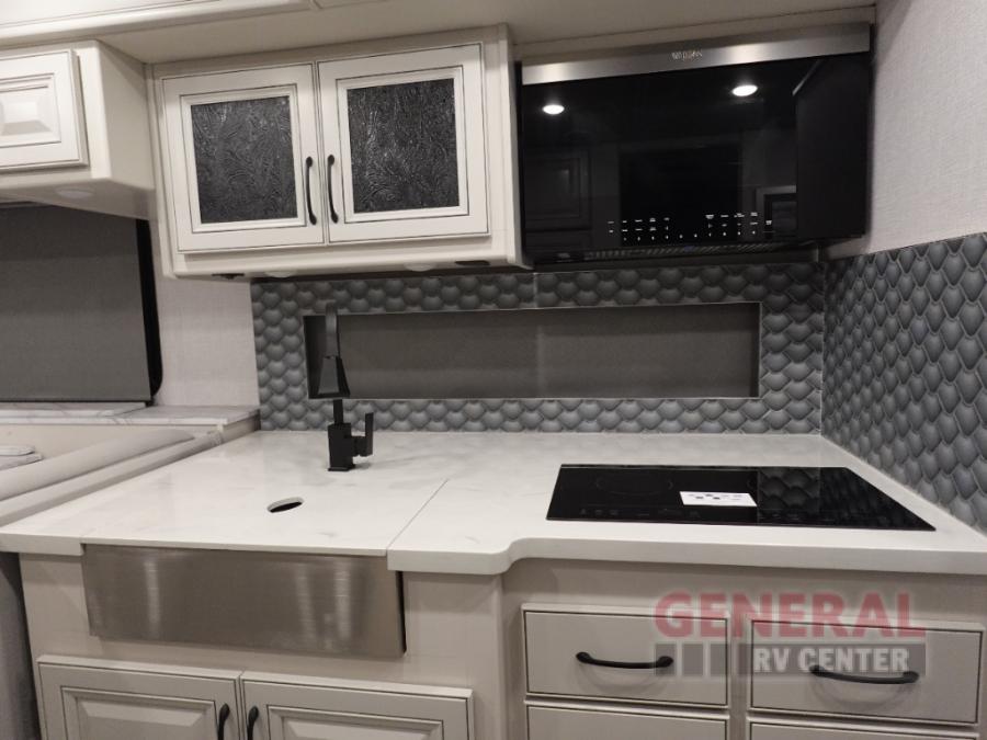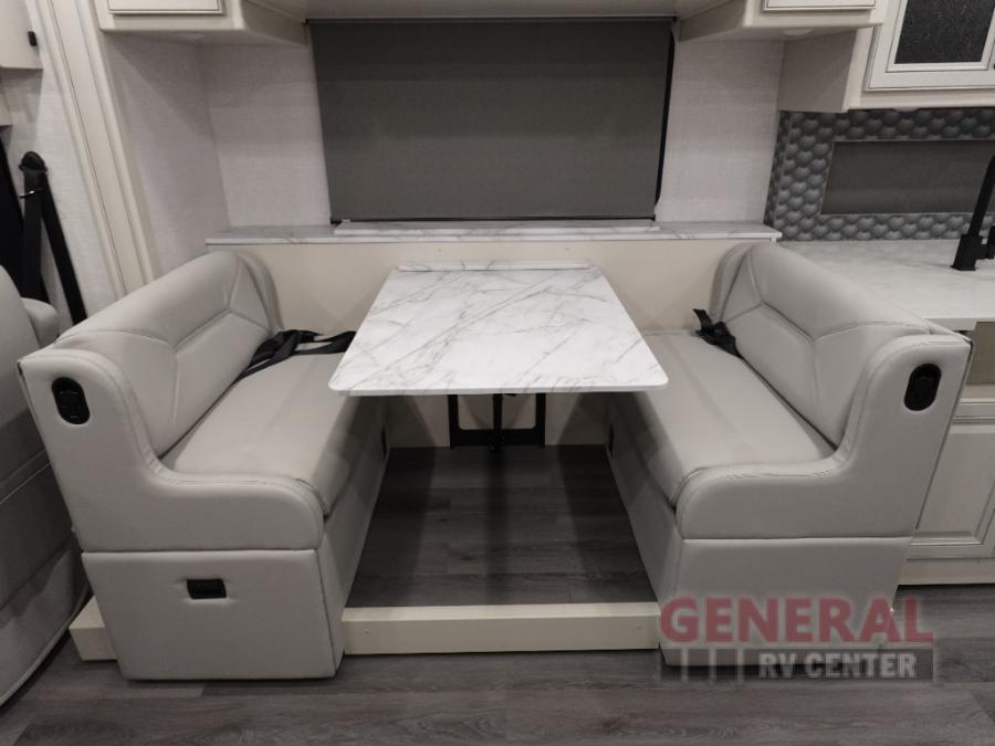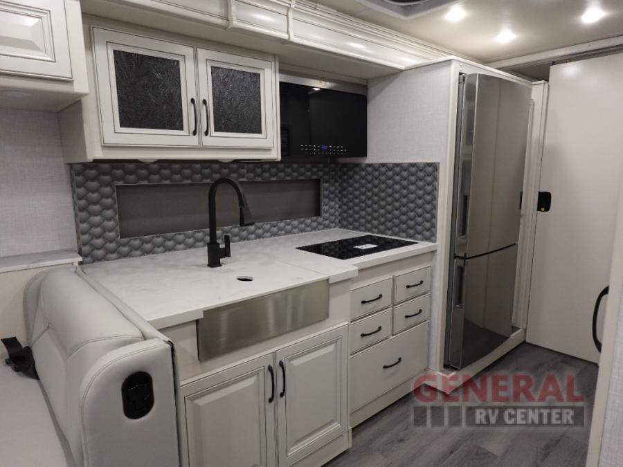 Looking for a couples coach or a family RV that offers everything you want plus more? Look no further! You can travel in style with the beautiful interior and exterior, and relax in comfort on the sofa sleeper with pull-out queen bed and the dinette as well as captain's chairs. Everyone can visit and watch the pop-up LED TV and stay cozy from the fireplace while the cook makes a meal in the kitchen using the induction cooktop and convection microwave. No problem with beverage and leftover storage with a residential refrigerator, and your snacks will fit nicely in the pantry. The full bathroom offers a seated shower and pocket door. The kids or your guests can sleep on the furniture once setup for bedtime, and you will have your own privacy in the rear bedroom with a Encore Series king bed, as well as plenty of storage in the full-length wardrobe, and dresser.
