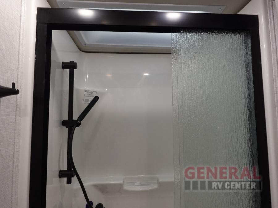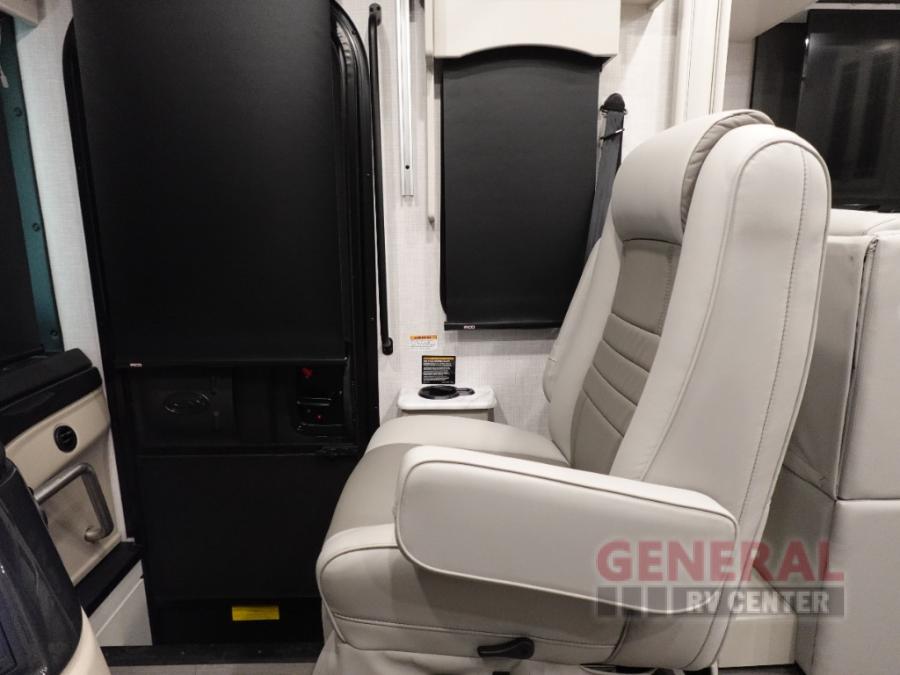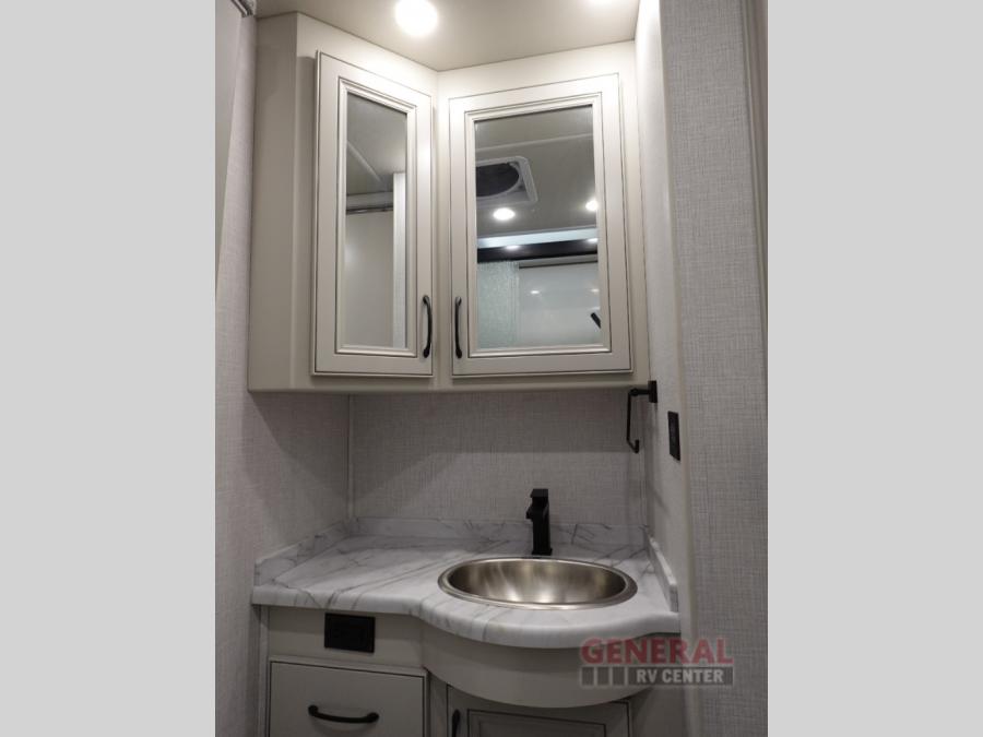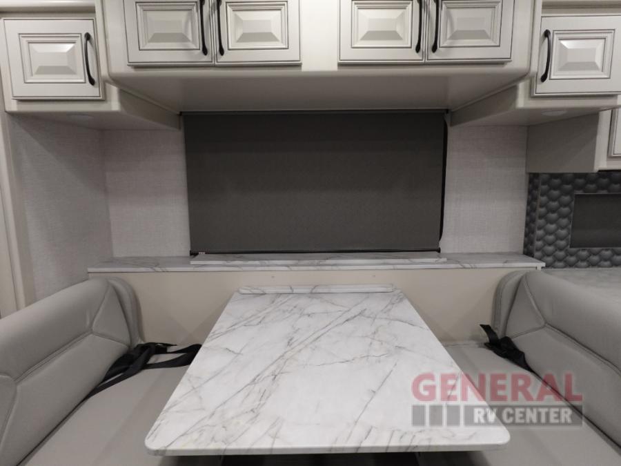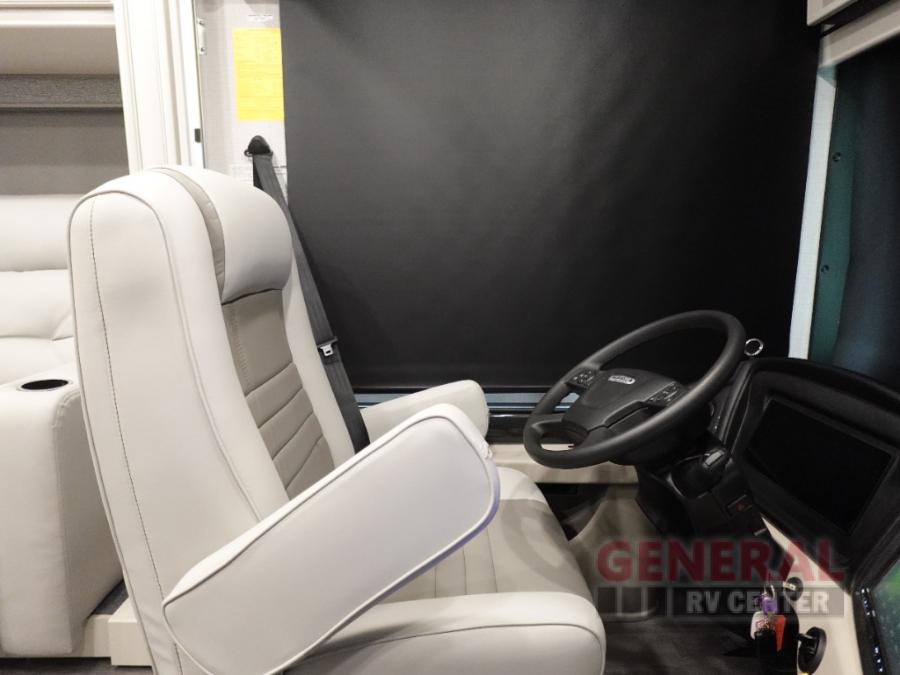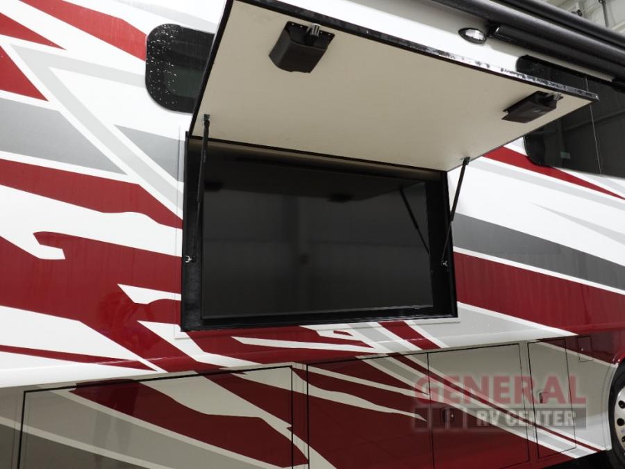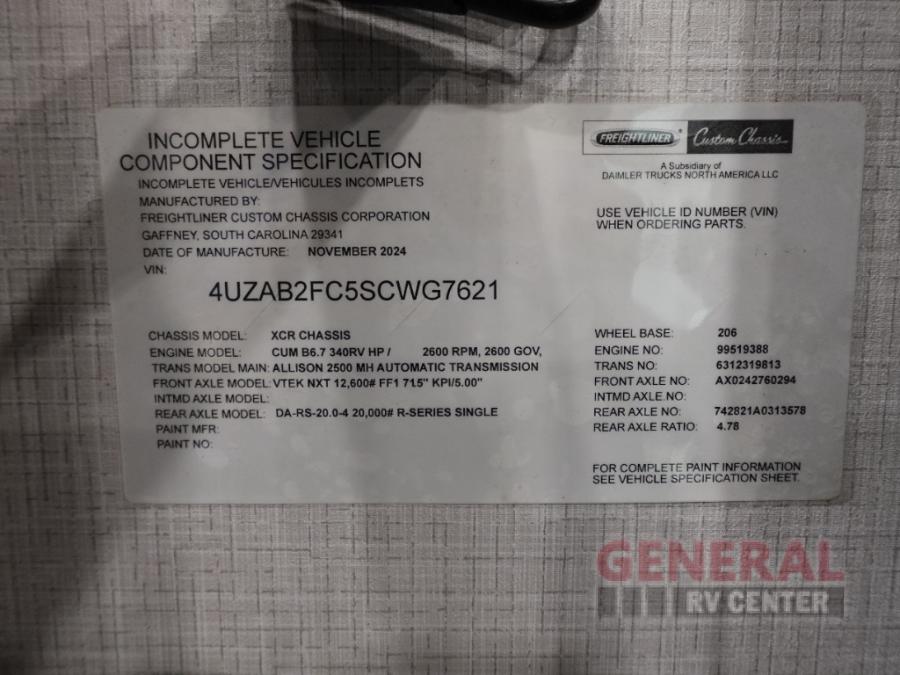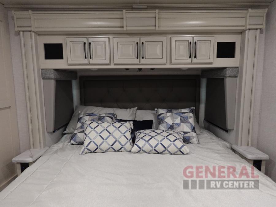 Looking for a couples coach or a family RV that offers everything you want plus more? Look no further! You can travel in style with the beautiful interior and exterior, and relax in comfort on the sofa sleeper with pull-out queen bed and the dinette as well as captain's chairs. Everyone can visit and watch the pop-up LED TV and stay cozy from the fireplace while the cook makes a meal in the kitchen using the induction cooktop and convection microwave. No problem with beverage and leftover storage with a residential refrigerator, and your snacks will fit nicely in the pantry. The full bathroom offers a seated shower and pocket door. The kids or your guests can sleep on the furniture once setup for bedtime, and you will have your own privacy in the rear bedroom with a Encore Series king bed, as well as plenty of storage in the full-length wardrobe, and dresser.