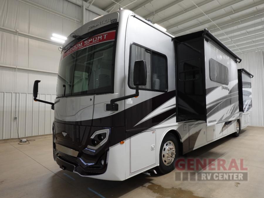 The Fleetwood RV Frontier GTX Class A diesel motorhome is built on a Freightliner custom chassis featuring V-Ride technology and a Freedom Sport foundation. The Cummins 6.7L diesel engine provides plenty of power to get you where you need to go. An exterior service station includes an exterior shower, city water hookup, water pump switch, and towel holder. The full coverage heavy duty undercoating, the vacu-bond aluminum framed constructed sidewalls, roof, and floor, and the painted steel frame chassis construction is sure to hold up for years to come. Heads will turn down the highway when they see the premium gel exterior Vetrosina fiberglass skin. Come find your favorite one today!