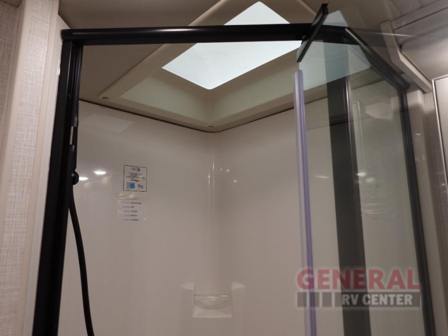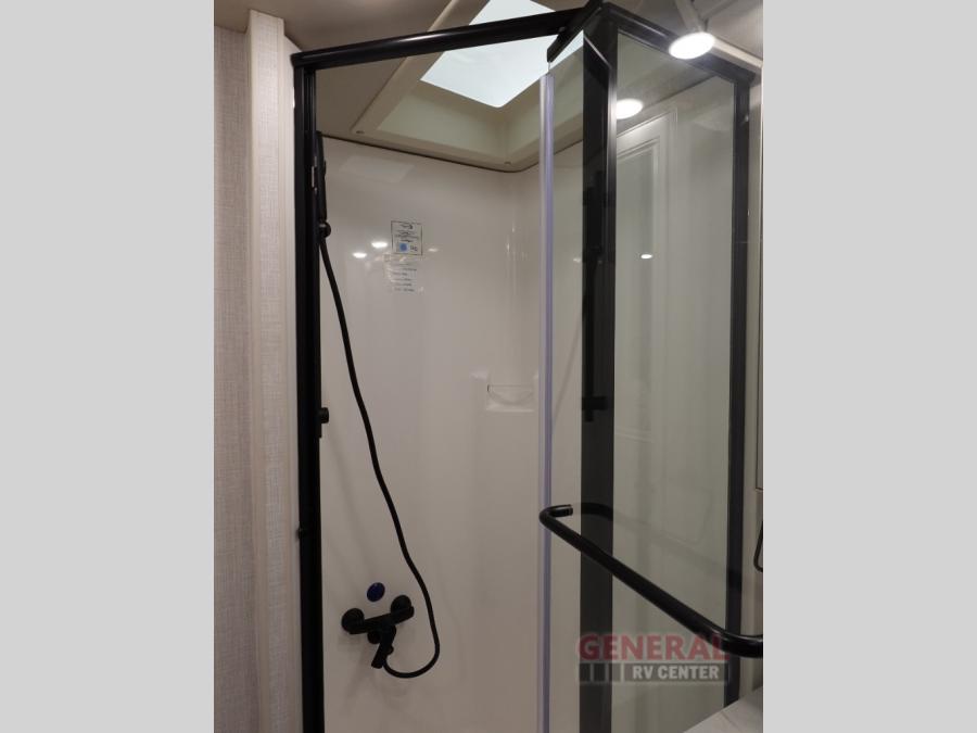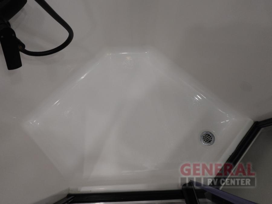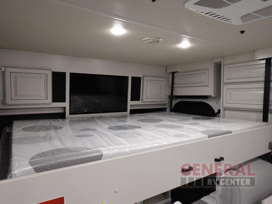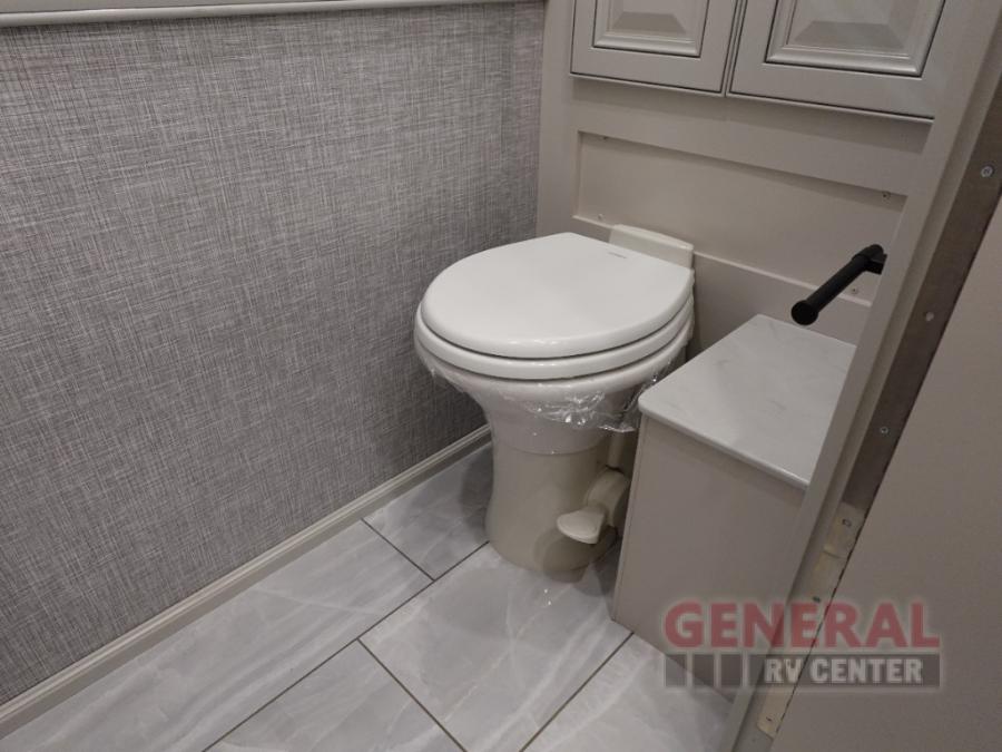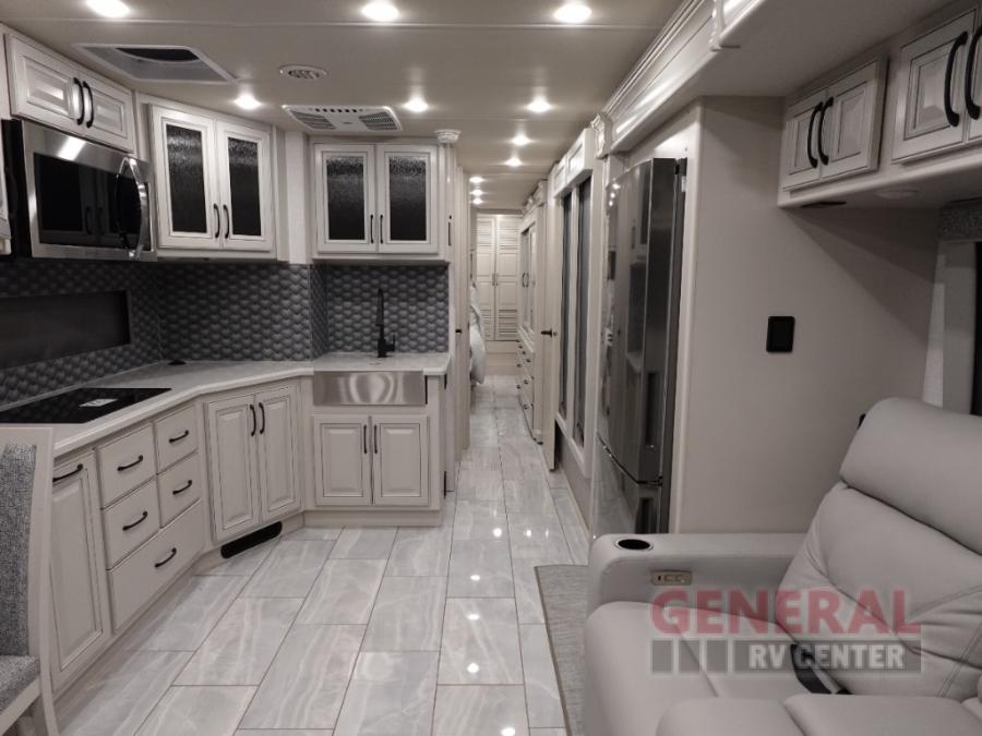 The perfect getaway awaits in this Fleetwood Frontier GTX! A sleek layout with plenty of floor space and two slide outs gives you room to entertain or to relax by yourselves. The kitchen features a unique L-shaped countertop to maximize your work area. There's pull-out storage beneath as well. A residential refrigerator and induction cooktop provide a nice setup to cook almost anything. The kitchen is open to the front living area, so your guests can relax on the sofa and chat with you while you cook. A dual entry bath is at the center of the coach, with access via the hall or the bedroom. A private half bath with linen closet is tucked behind sliding doors at the rear. Porcelain tile throughout is both stylish and easy to clean.