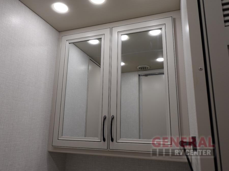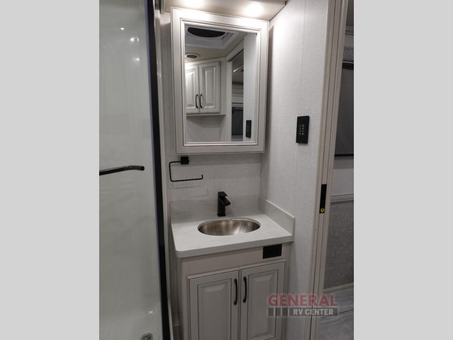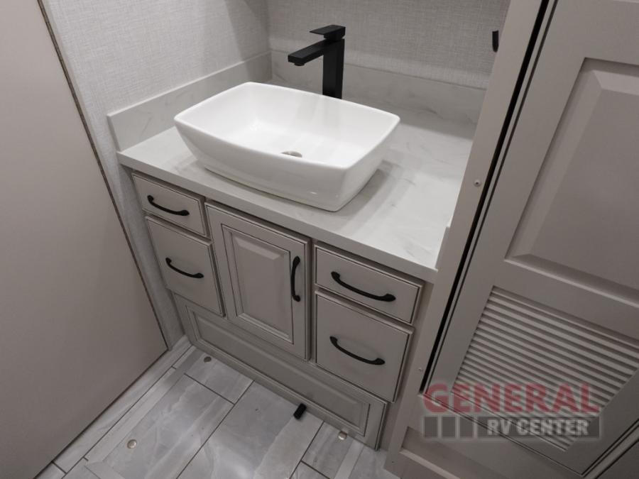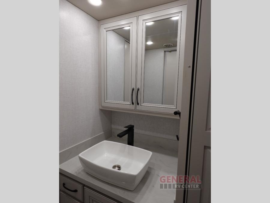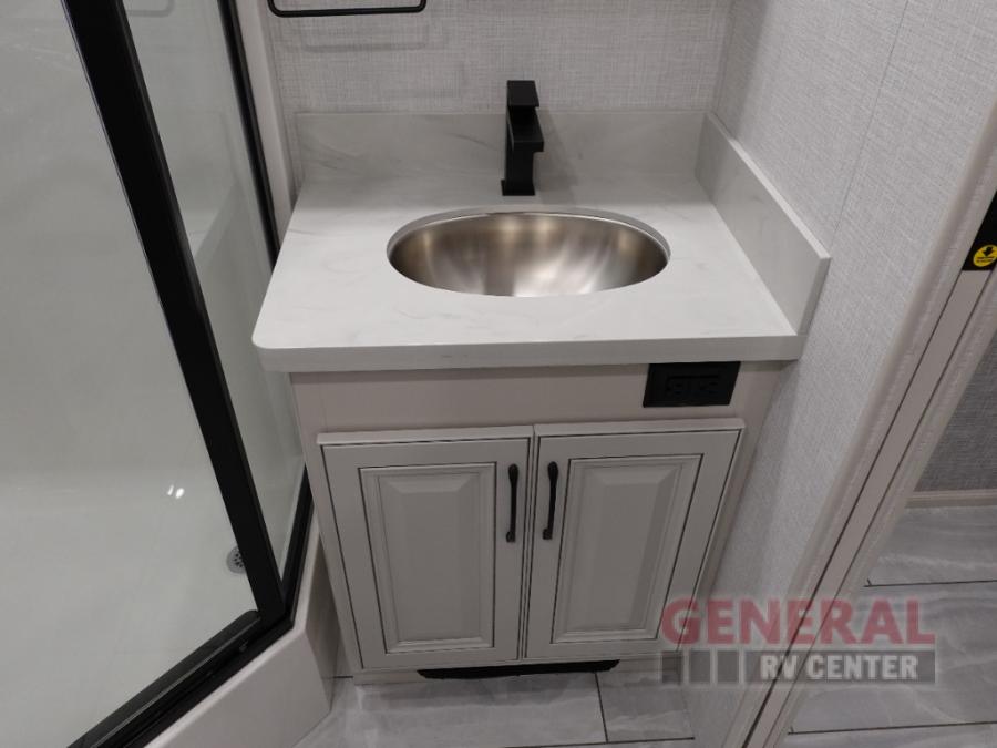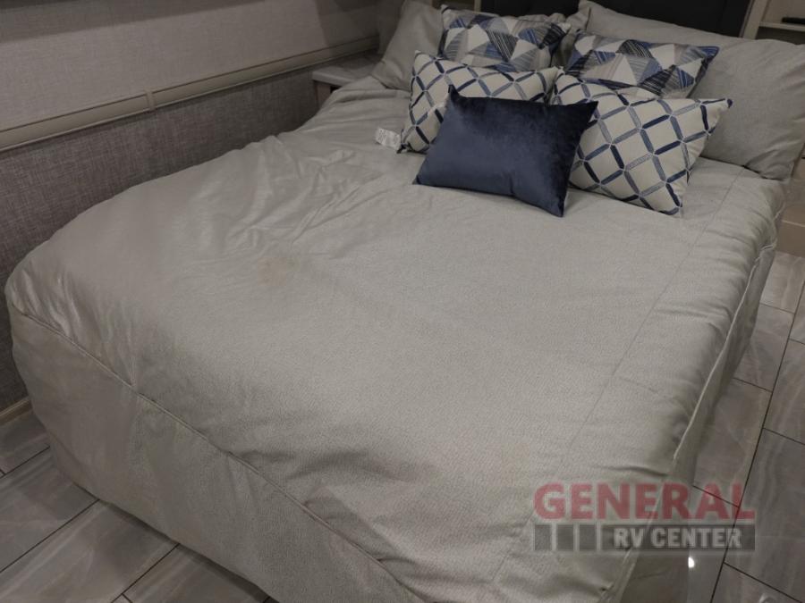 The perfect getaway awaits in this Fleetwood Frontier GTX! A sleek layout with plenty of floor space and two slide outs gives you room to entertain or to relax by yourselves. The kitchen features a unique L-shaped countertop to maximize your work area. There's pull-out storage beneath as well. A residential refrigerator and induction cooktop provide a nice setup to cook almost anything. The kitchen is open to the front living area, so your guests can relax on the sofa and chat with you while you cook. A dual entry bath is at the center of the coach, with access via the hall or the bedroom. A private half bath with linen closet is tucked behind sliding doors at the rear. Porcelain tile throughout is both stylish and easy to clean.