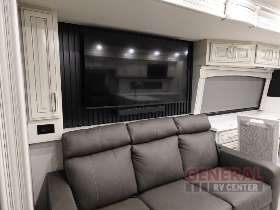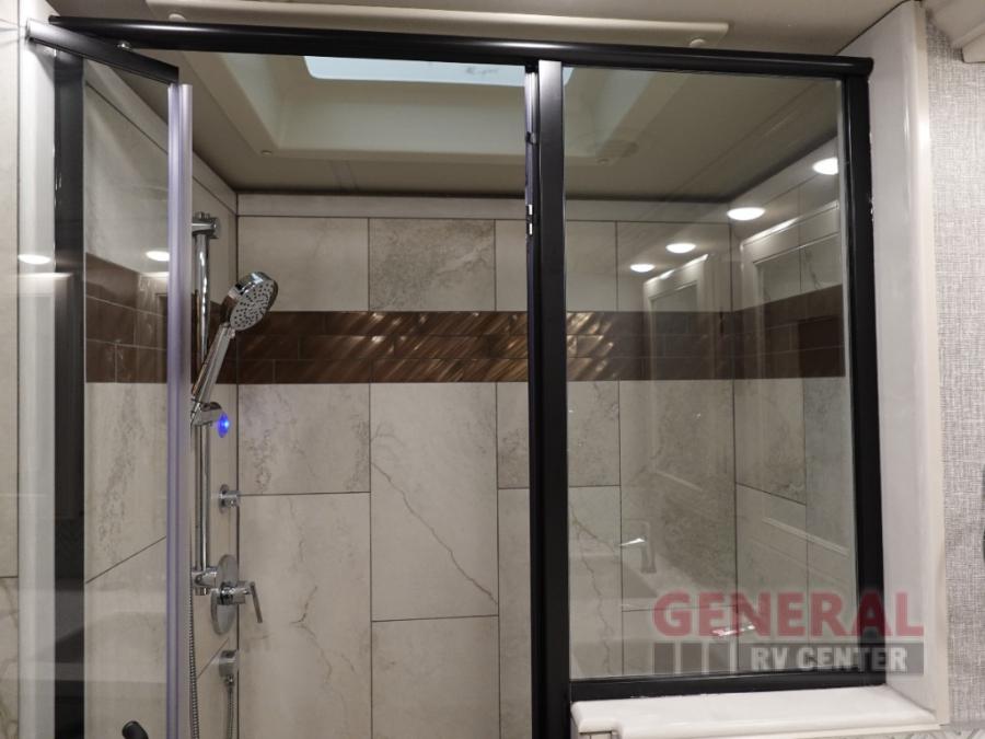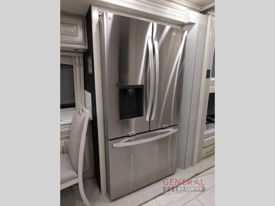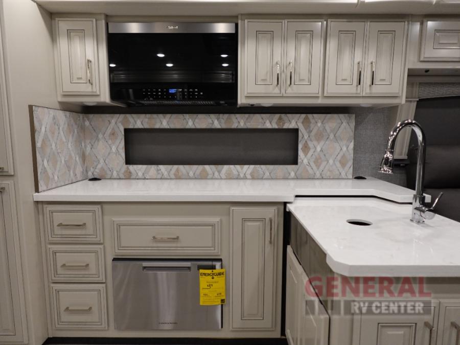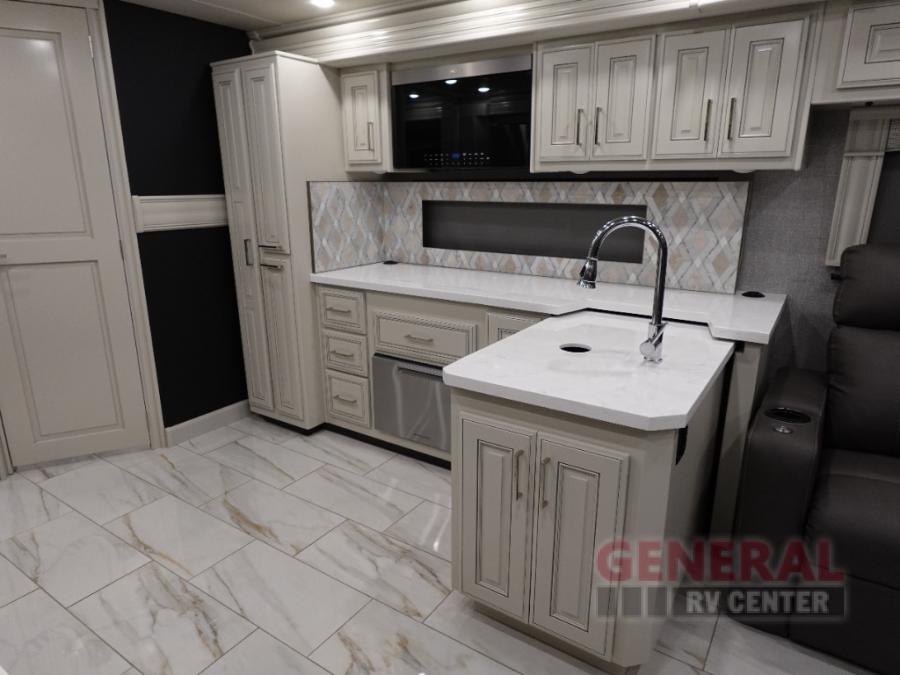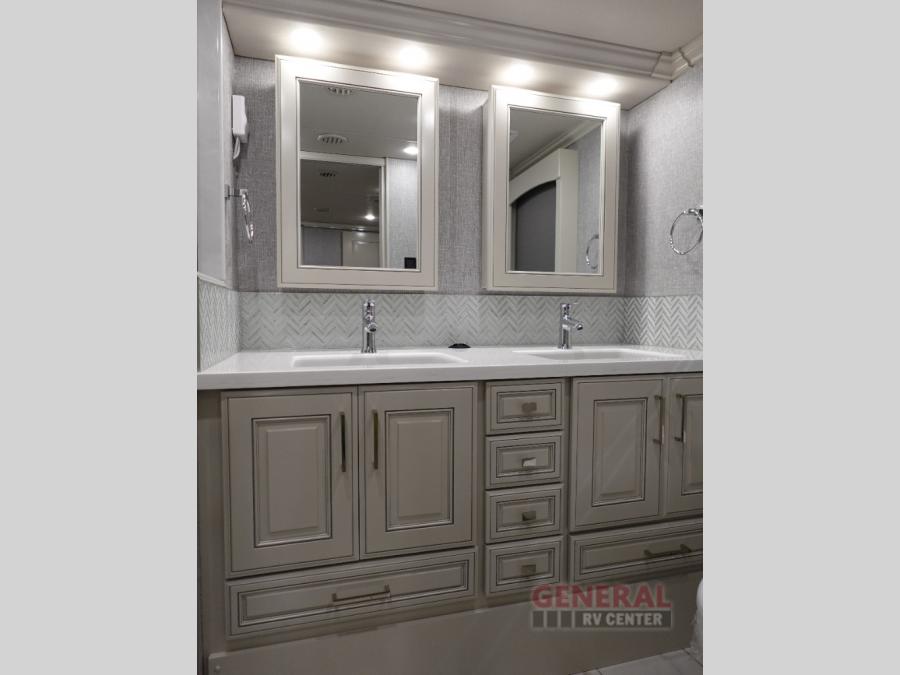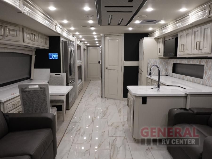 With any Palisade Class A diesel motorhome by Fleetwood RV, you will be met with luxury at every turn! There is a Freedom Bridge foundation and a Freightliner Custom Chassis plus an Allison 3000 6-speed transmission for a smooth drive. The Vacu-Bond aluminum framed constructed sidewalls, roof, and floors means you can enjoy your coach for years to come, and the Powerlock System interlocks the floor, walls and roof for even more strength. Outside, the basement pass-through storage and side swing aluminum bus-style baggage doors will let you easily pack camp gear, and the 4-color premier full body paint is sure to turn heads as you travel down the highway. Additional exterior features include automatic hydraulic leveling jacks, a King universal stationary satellite, automatic entrance steps, and the list goes on! Once inside, you can enjoy the porcelain tile flooring, hardwood cabinetry, elegant tile backsplash, dual bath sinks, and glass shower door to name a few comforts!