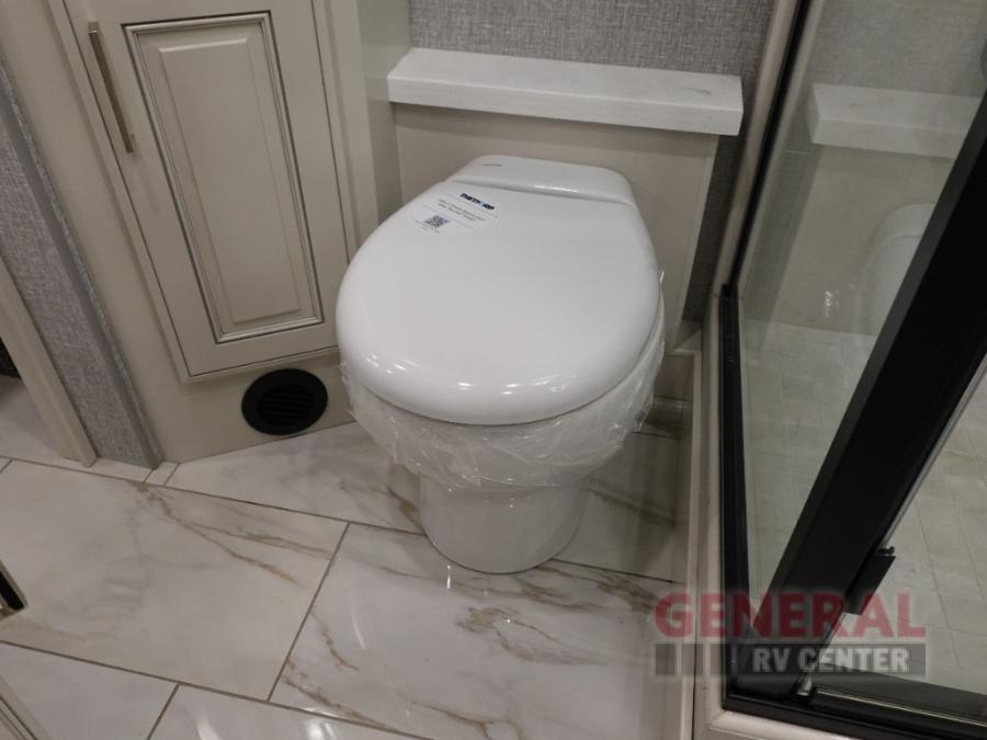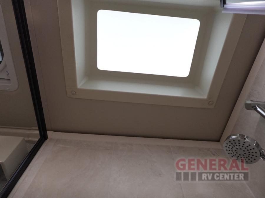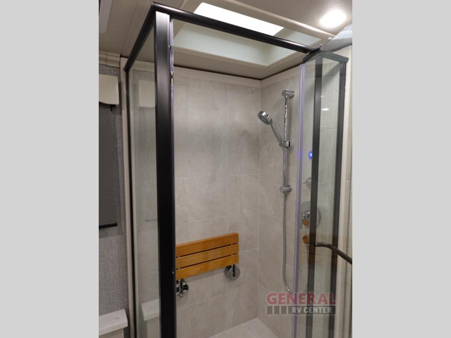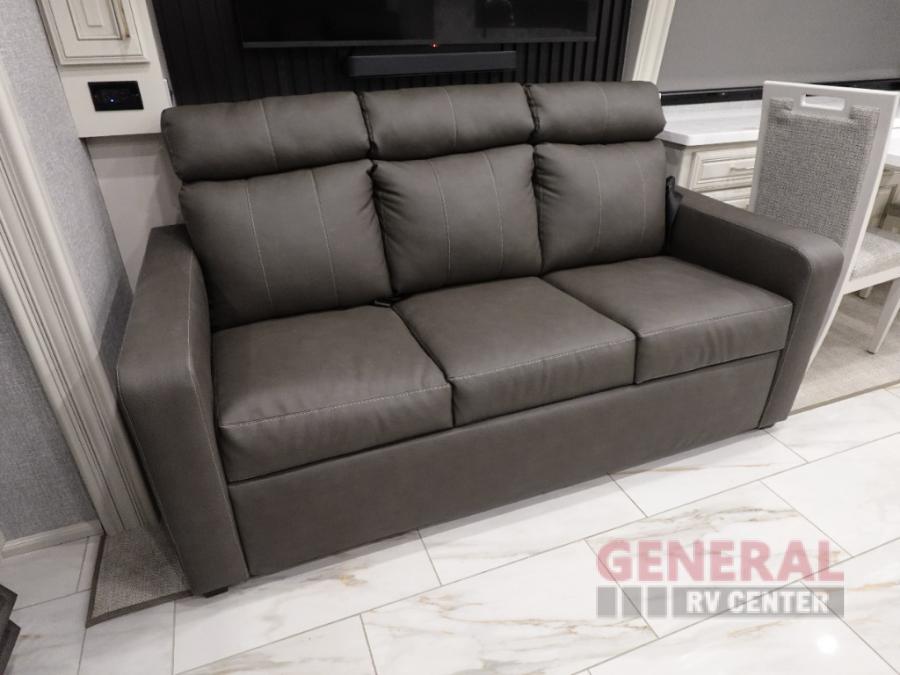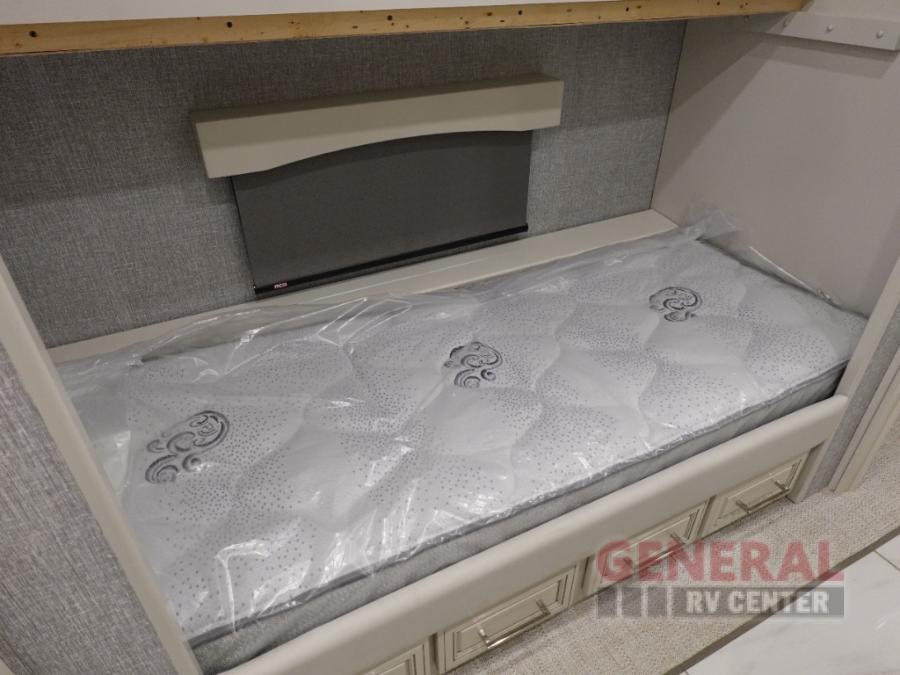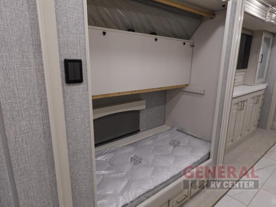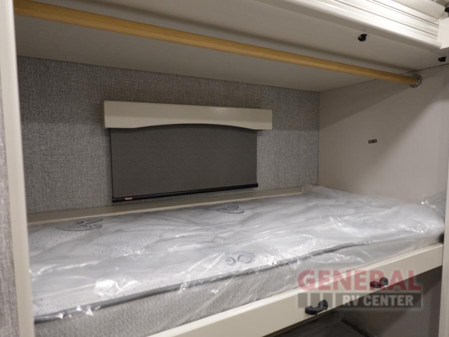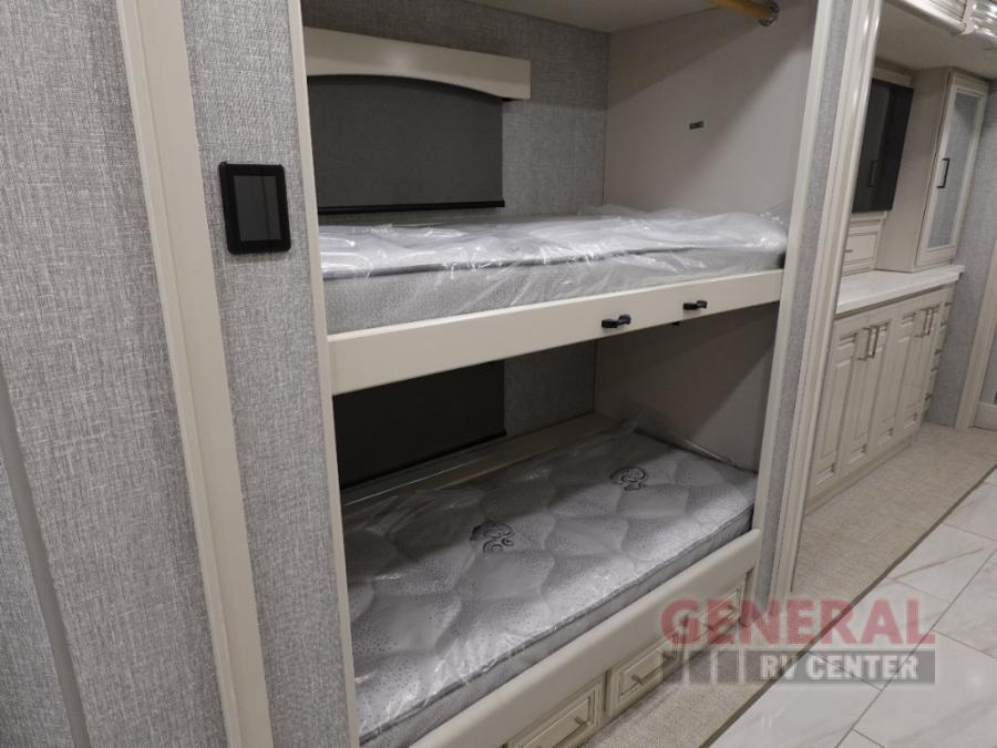 Head across the country or state in this spacious coach! The motion power lounge provides a comfy place to relax, and the sleeper sofa with a full-size mattress will be perfect for guests. The full kitchen includes a two burner induction cooktop and stainless steel over-the-range convection microwave to cook meals, plus a dishwasher for easy clean-up and a residential refrigerator for food storage. You will love having a king bed slide out to sleep on, along with dual bedroom wardrobes and a side-by-side washer and dryer to make laundry day easier than ever. The convertible bunk beds are right across from the mid-coach full bath, and there are accordion doors here if you want to make the bunks and bath one big master bunkhouse! The second full bath is found in the back, creating a master bedroom you are sure to love. There are dual bath sinks here, a toilet, and a tile shower with a seat for all-around luxury!