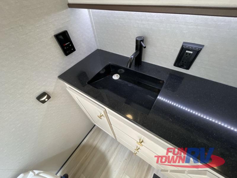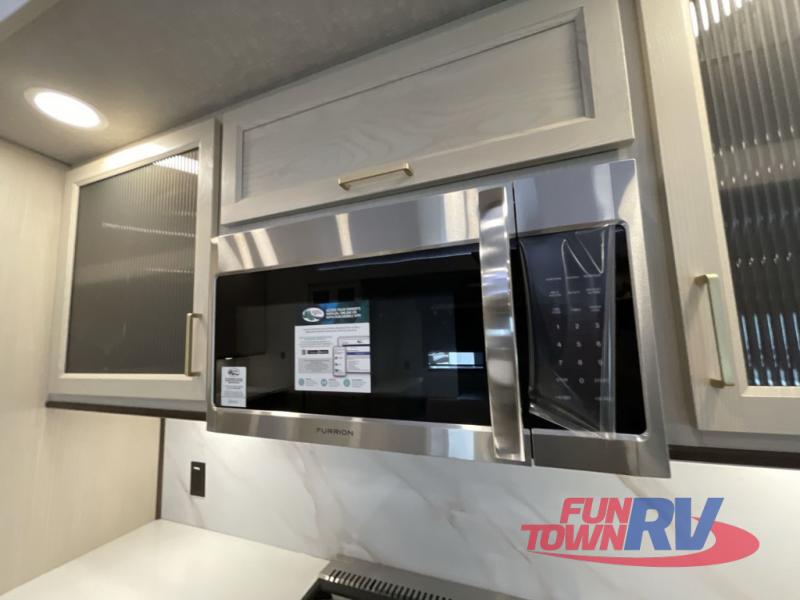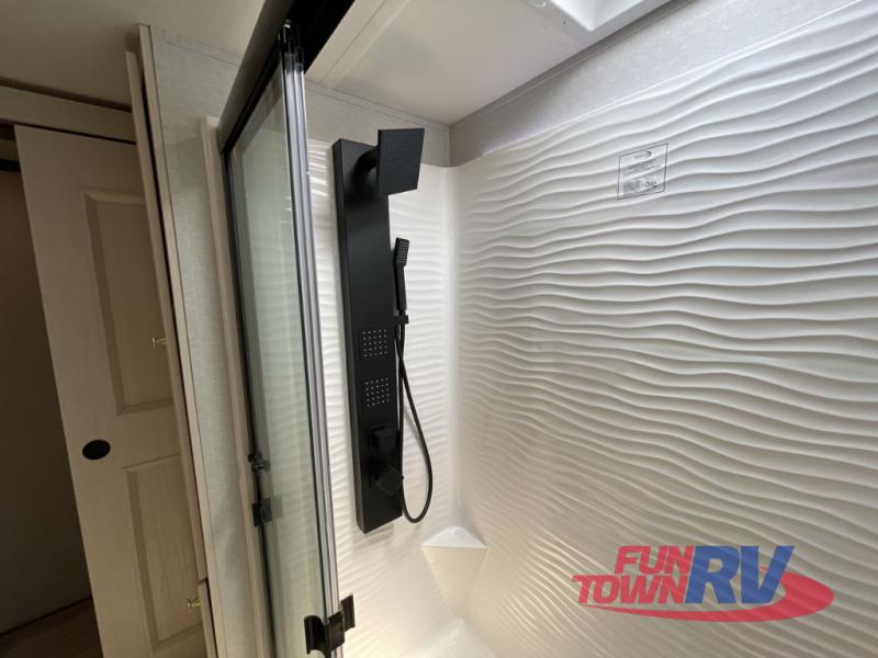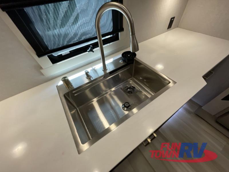 It will feel like coming home each time you take this fifth wheel out! The dual opposing slides in the main living area make your space open, and the waterfall island with swivel chairs will be the perfect place to prep meals, dine together, or set out snacks for movie night! You will also love the rear counter space with a large sink to clean up each day and there is a dishwasher option if you want the option to make the process even easier. A tri-fold sofa in the main living area will provide a place for a guest or two to sleep, and the Murphy pantry hidden behind the entertainment center and fireplace will keep snacks stocked up. The full bath includes a shower with a seat, dual bath sinks, plus a linen closet to keep towels tidy. What could make this fifth wheel better than a king bed slide out in the front bedroom?! How about a large wardrobe with washer/dryer prep, a dresser with a TV above, and overhead storage for belongings!