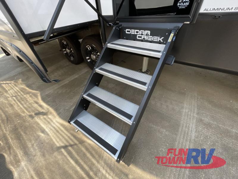 With any Cedar Creek fifth wheel by Forest River, you will find a quality-built RV with your comfort in mind! The all-aluminum super structure on 16" centers or less will provide a solid foundation to your fifth wheel, and the 3M bonded sidewalls will hold up over years of use. Each model also includes a Road Warrior suspension for smooth towing, a 21,000 lb. Rhino box hitch, and a new 101" wide body frame. Inside, you'll enjoy walnut/two tone wooden cabinets and fascias, day/night roller shades, motion lighting in the bath and bedroom closet, plus many  more comforts. The new CradlePoint WiFi/5G antenna and Day 1 connectivity will help keep you connected as you travel, and the "Rich Solar" 200W solar panel will give you off-grid capabilities!