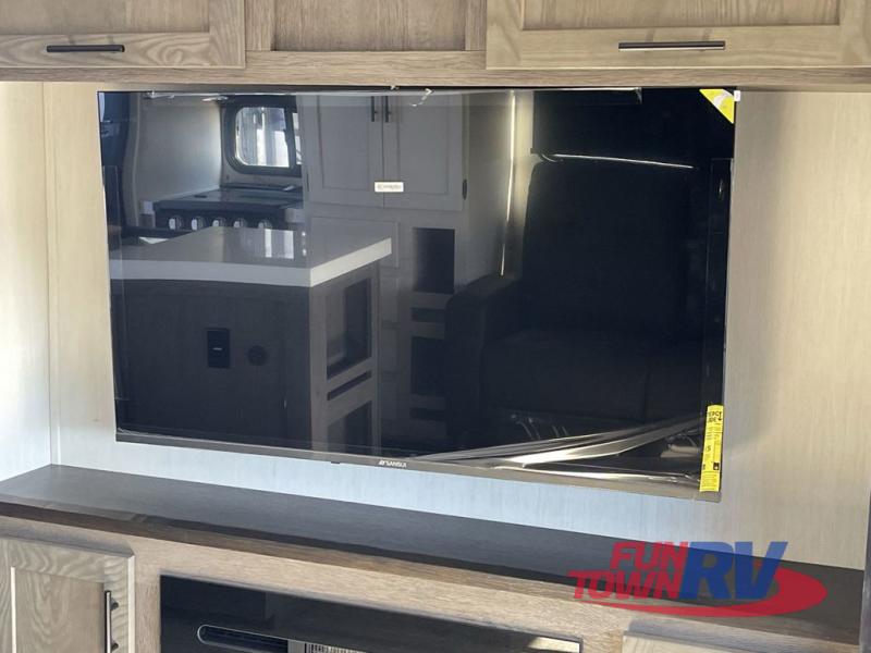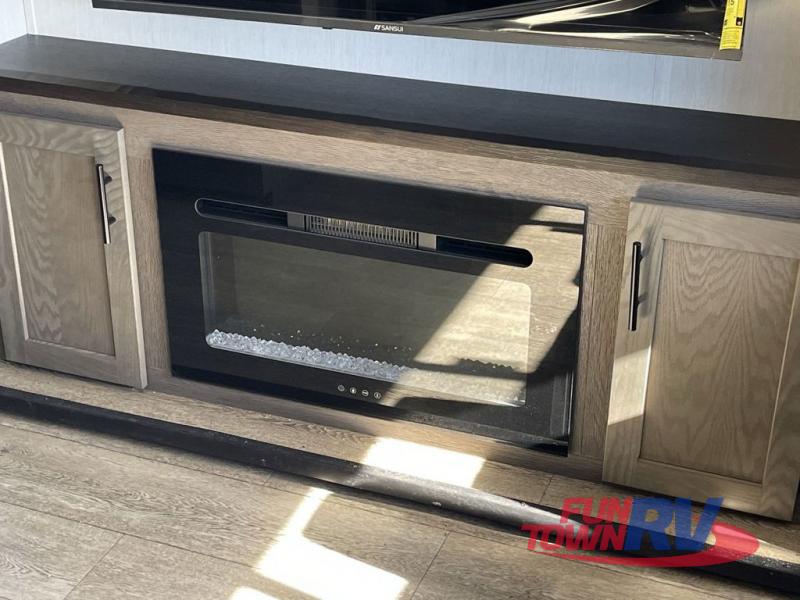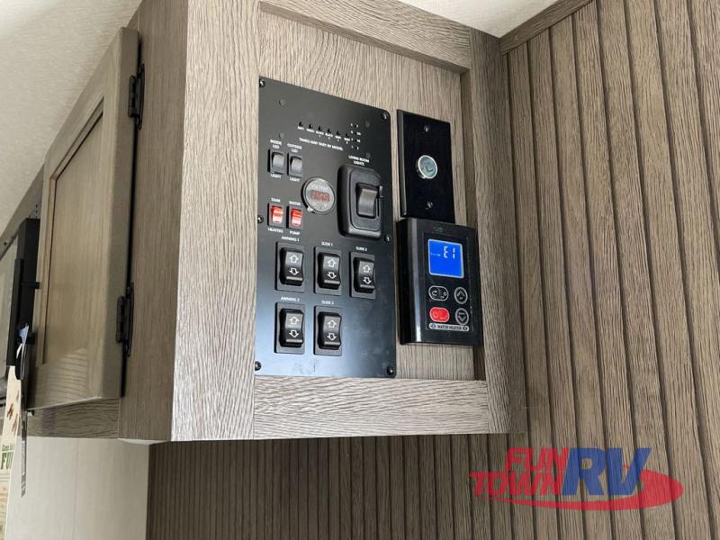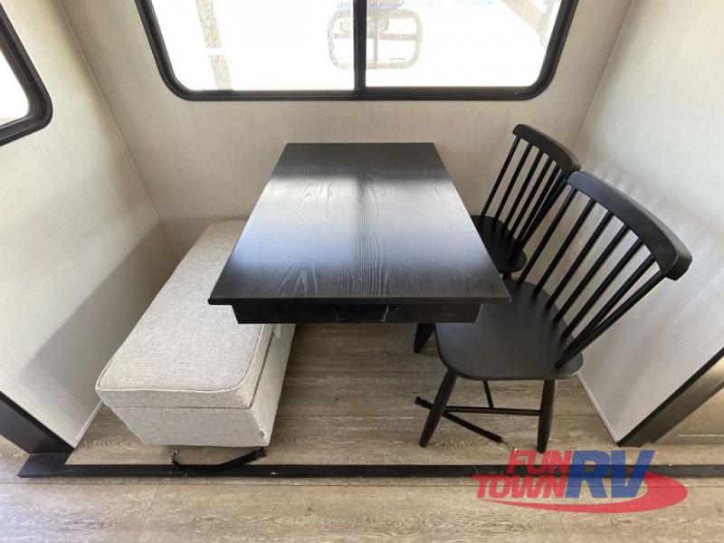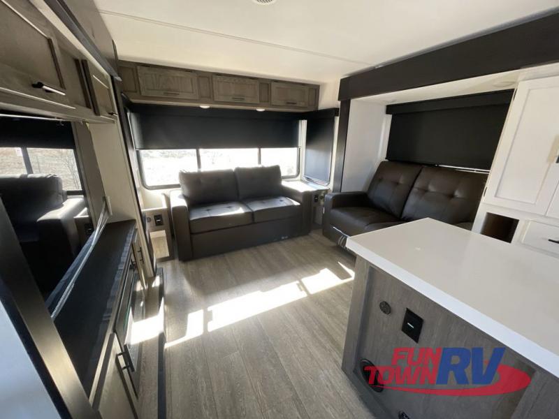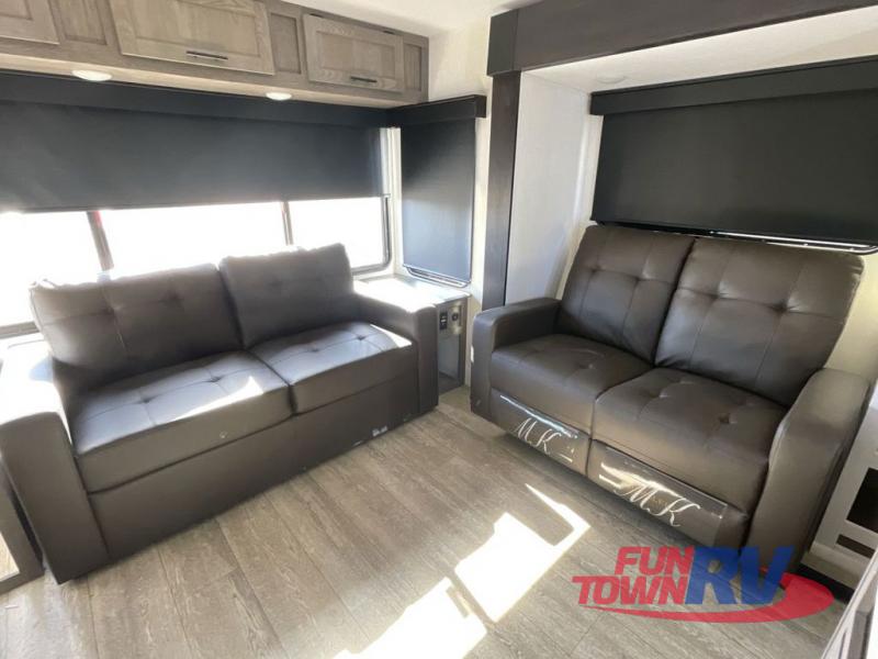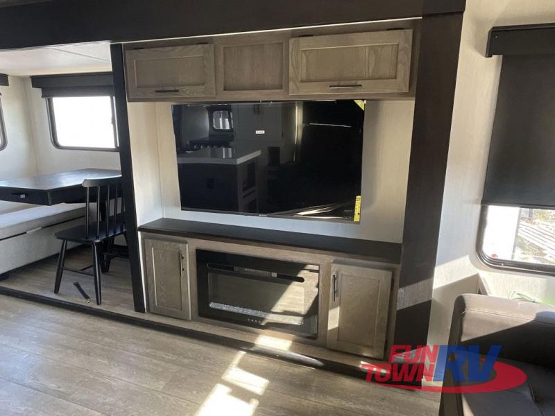 It will be so easy to find comfort in this travel trailer! The dual opposing slides in the combined kitchen and living room will create an open floorplan you are sure to love. There is a rear tri-fold sofa, theater seating across from an entertainment center, plus a table with chairs and a storage ottoman seat to keep games organized. The chef of your group will love having extra counter space provided by the kitchen island, and there is a hutch to keep nice dishes stored away. Up front, the private bedroom includes a king bed slide out, dual wardrobes and a dresser, plus a front sun bench where you can sit to pull your hiking boots on. There is even a wardrobe with washer and dryer prep if you choose to add those appliances!
