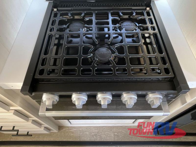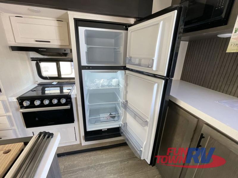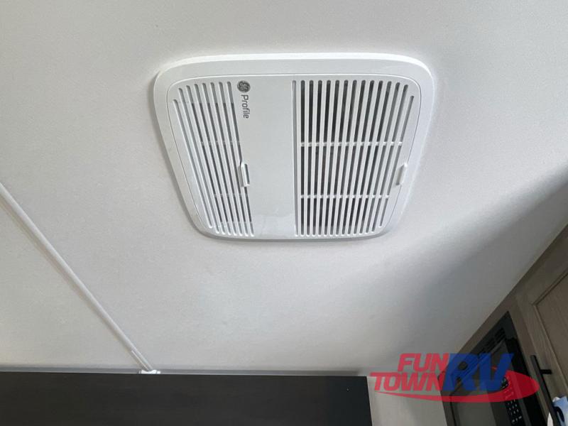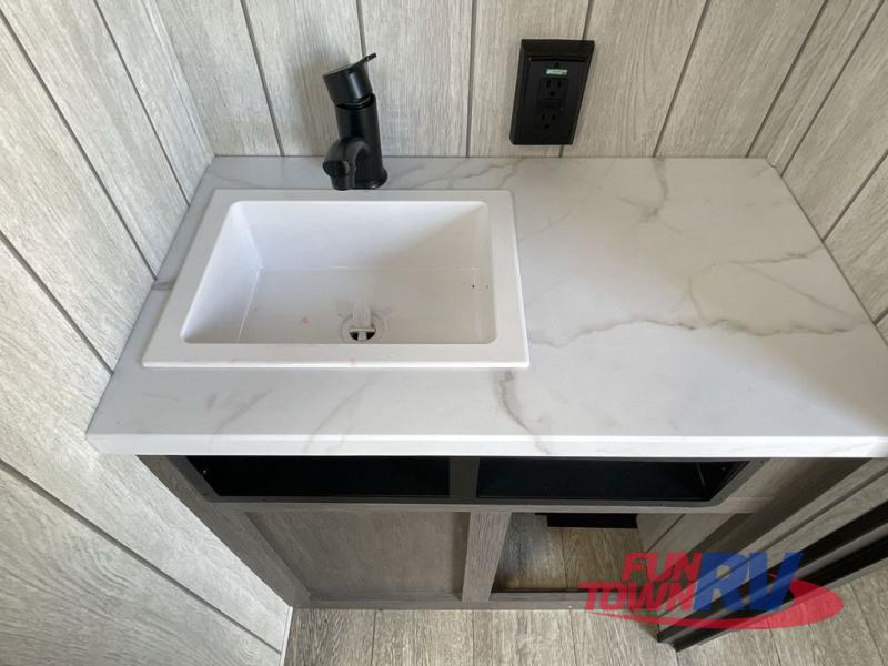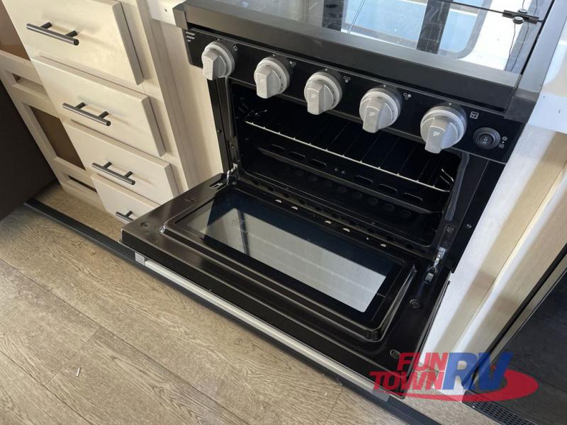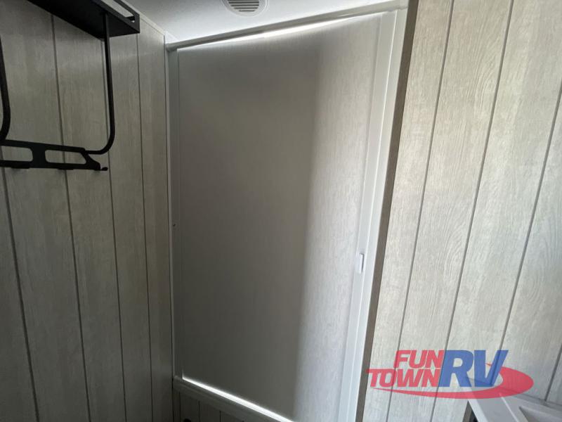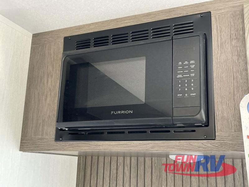 It will be so easy to find comfort in this travel trailer! The dual opposing slides in the combined kitchen and living room will create an open floorplan you are sure to love. There is a rear tri-fold sofa, theater seating across from an entertainment center, plus a table with chairs and a storage ottoman seat to keep games organized. The chef of your group will love having extra counter space provided by the kitchen island, and there is a hutch to keep nice dishes stored away. Up front, the private bedroom includes a king bed slide out, dual wardrobes and a dresser, plus a front sun bench where you can sit to pull your hiking boots on. There is even a wardrobe with washer and dryer prep if you choose to add those appliances!