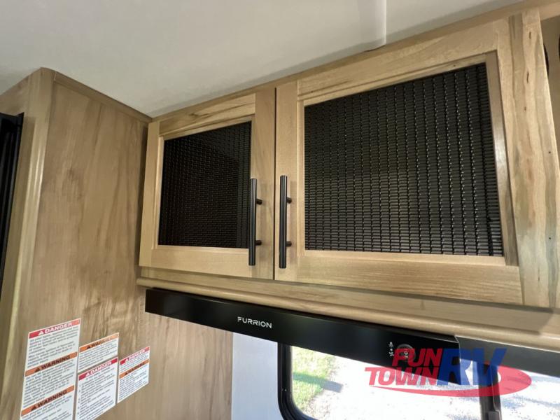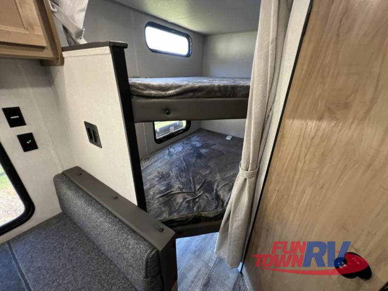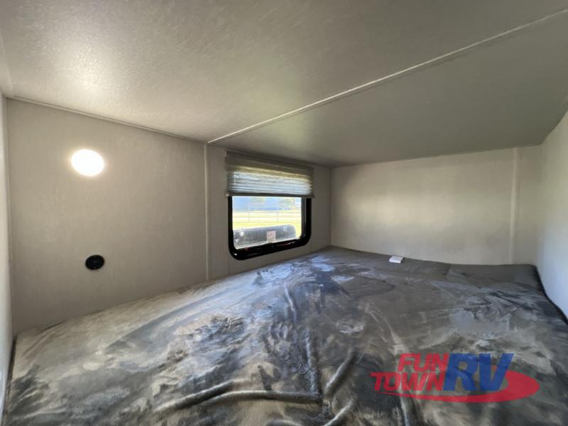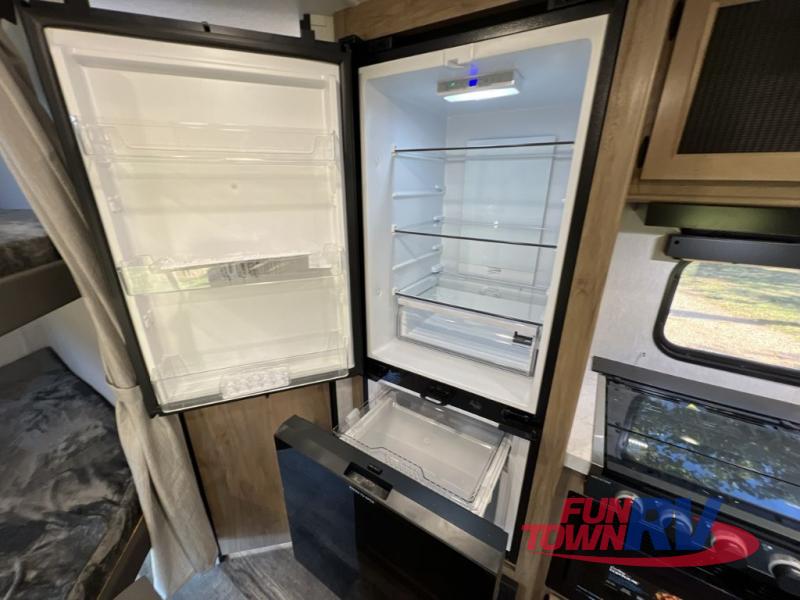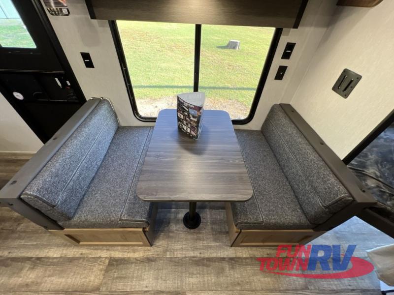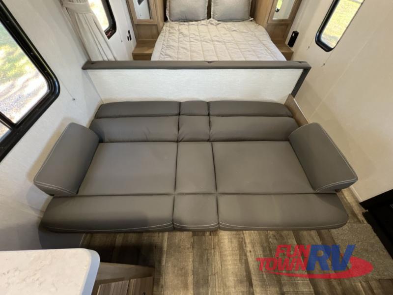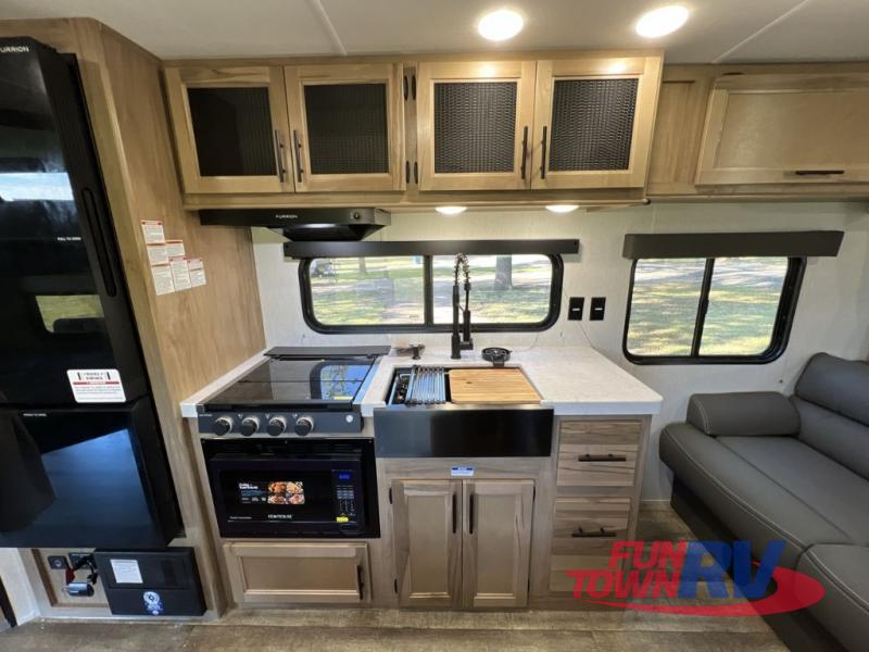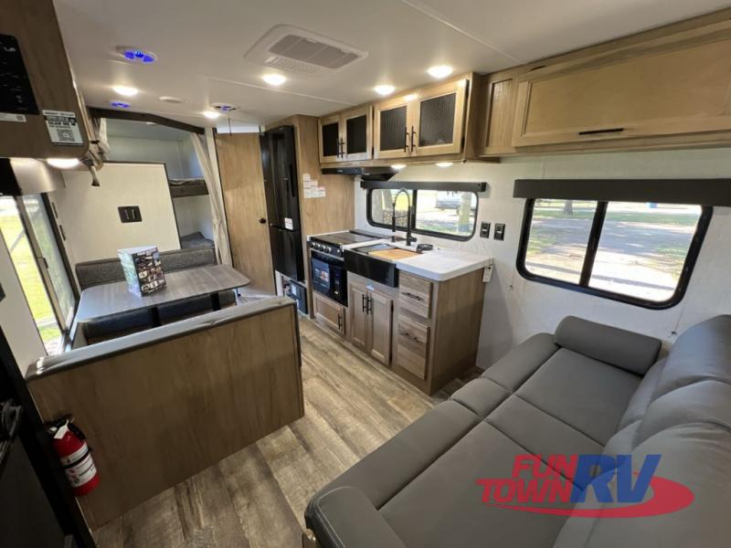 If you like to camp with more friends and family, this travel trailer is for you! Since there are double-size bunks, a queen bed, plus a sofa and booth dinette, you can sleep eight people each night! The front bedroom includes the RV king bed, along with dual bedroom wardrobes and USB ports to charge your phones overnight. A full kitchen, complete with an air fryer and refrigerator will let the chef do their thing, and everyone can head outdoors to sit under the 15' patio awning!