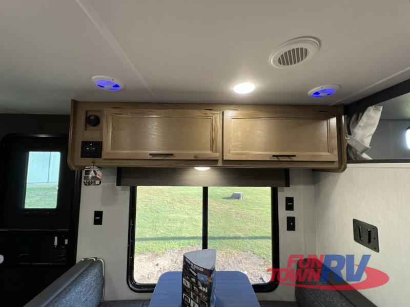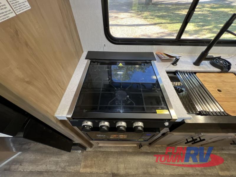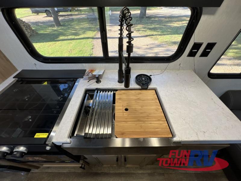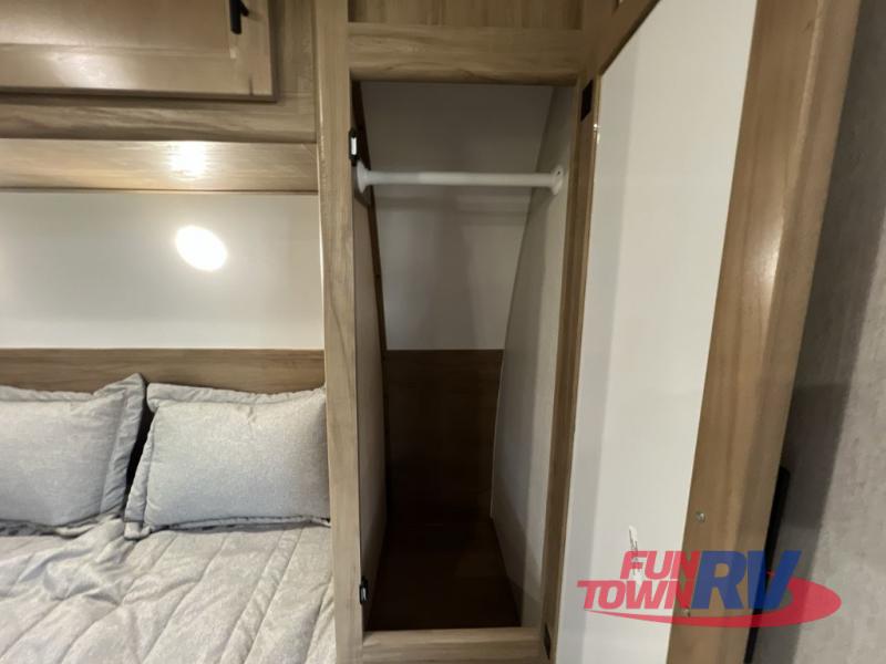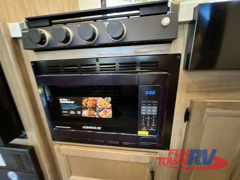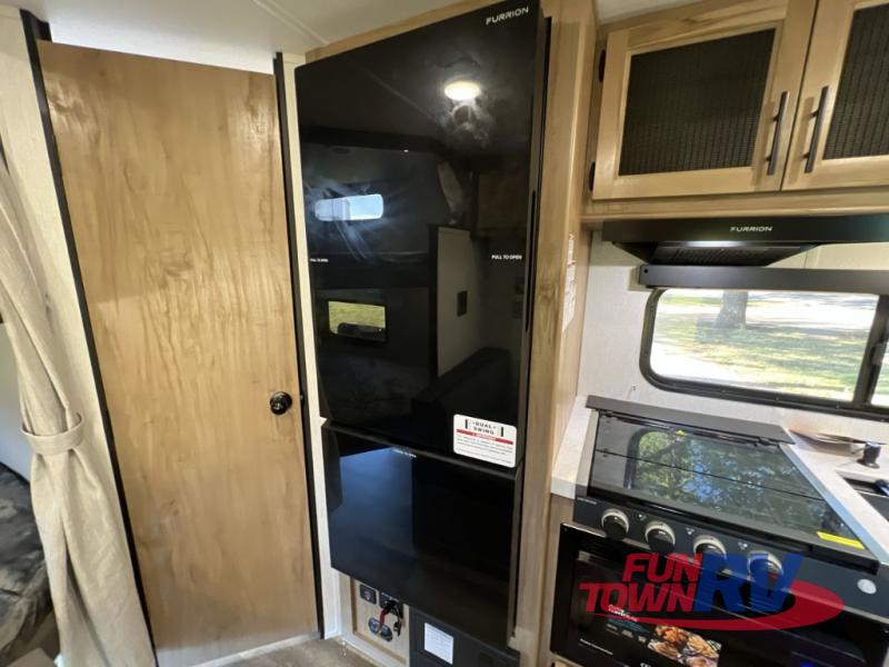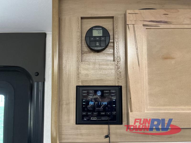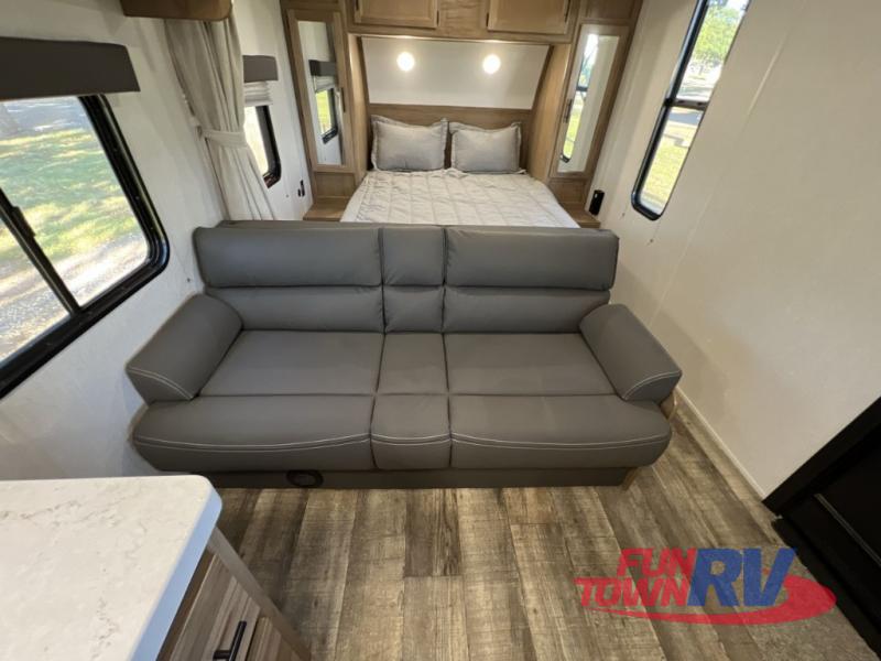 If you like to camp with more friends and family, this travel trailer is for you! Since there are double-size bunks, a queen bed, plus a sofa and booth dinette, you can sleep eight people each night! The front bedroom includes the RV king bed, along with dual bedroom wardrobes and USB ports to charge your phones overnight. A full kitchen, complete with an air fryer and refrigerator will let the chef do their thing, and everyone can head outdoors to sit under the 15' patio awning!